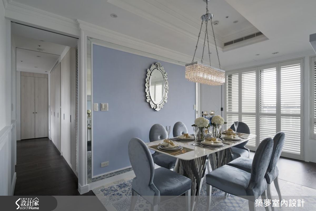 局部利用水藍色點綴空間,無論是餐廳的大片壁面、玄關的花磚地坪,還是沙發背牆上的相框視覺,皆呼應柔美浪漫的風格主題。