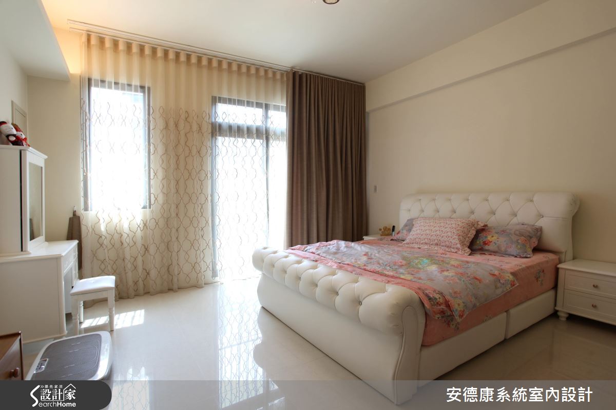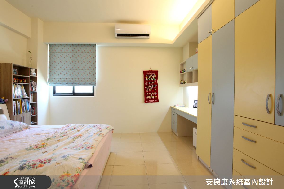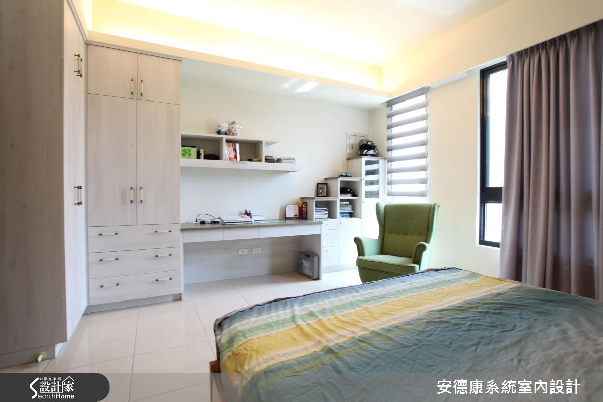 雖然採光良好,但由於原格局有著些微風水疑慮,因此設計團隊首先規劃兼具收納機能的吧台,解決開門見灶風水問題;另外,為了保留寬敞的公領域空間,刻意用線簾取代屏隔,化解穿堂煞問題。電視牆結合收納櫃功能,並以木紋系統板材創造自然質感。另外,設計師利用大面積灰鏡修飾位於過道上的衛浴空間,放大開放式餐廚的視覺感受。針對私領域規劃,設計團隊依據居住者不同的需求與特性,在男孩房以板材打造貓跳台、女孩房則因應公仔收藏習慣,以跳色門片設計開放展示櫃,機能與美觀兼具。