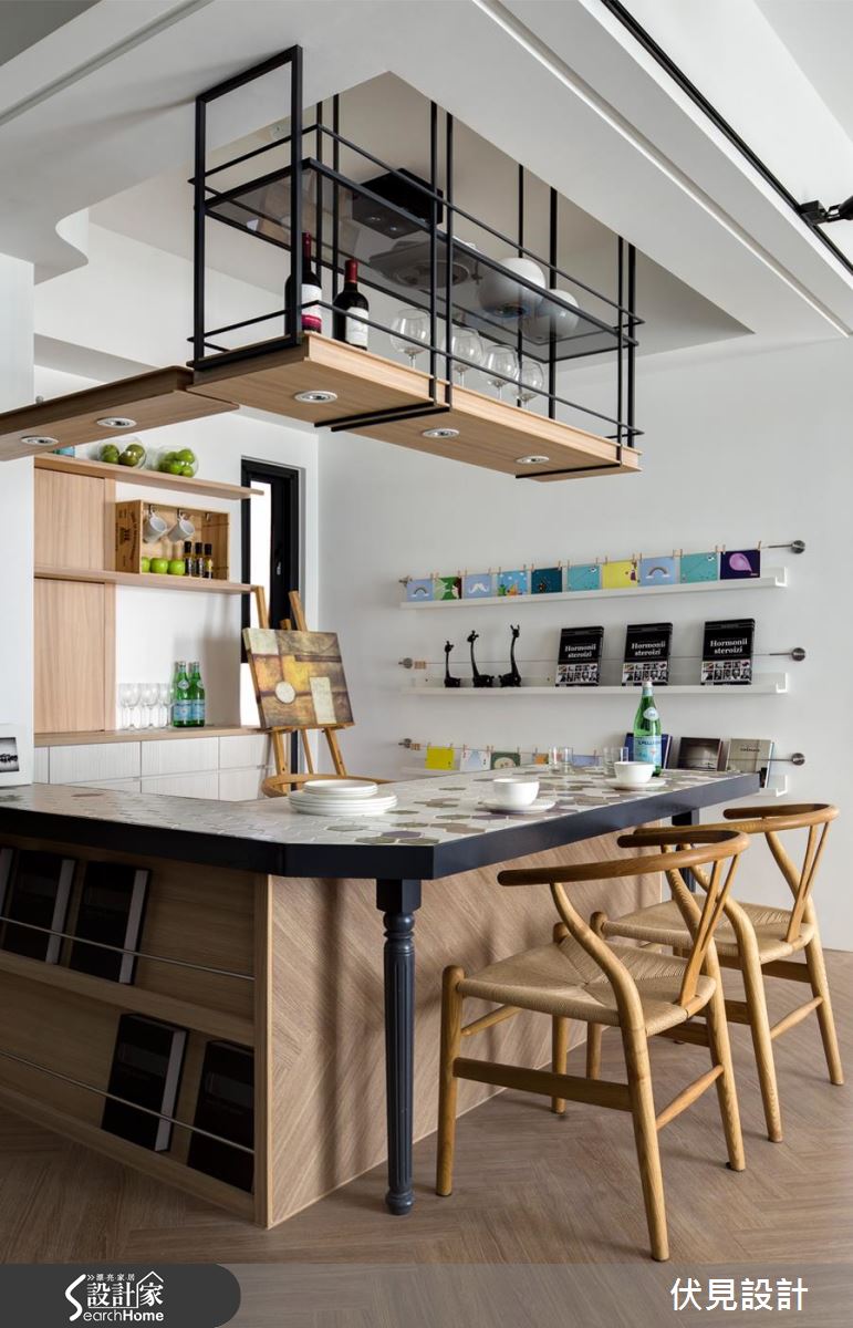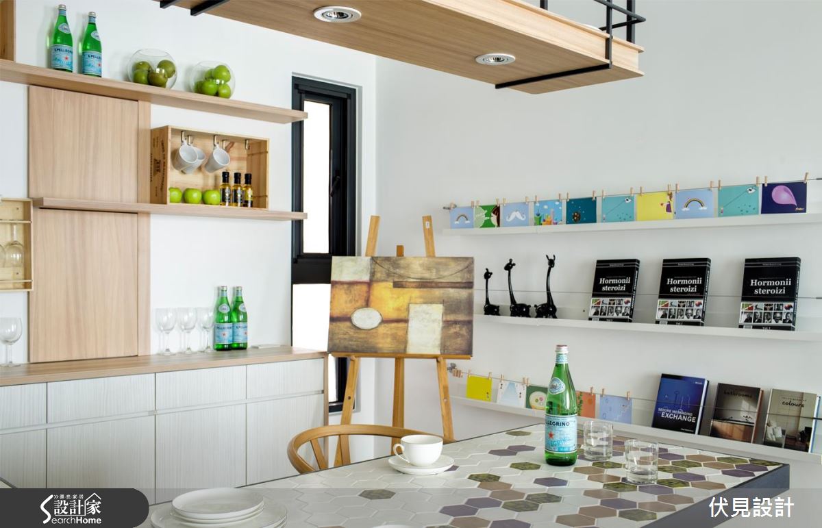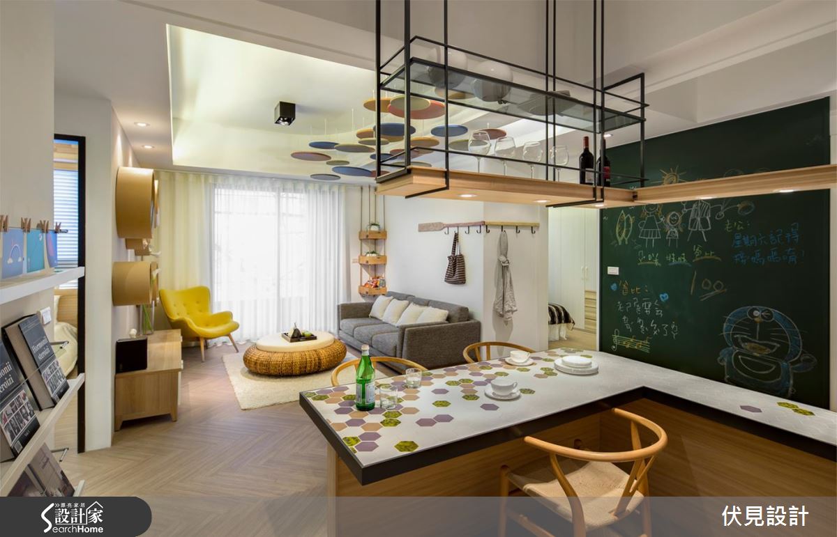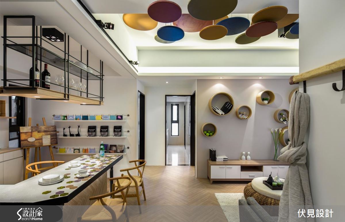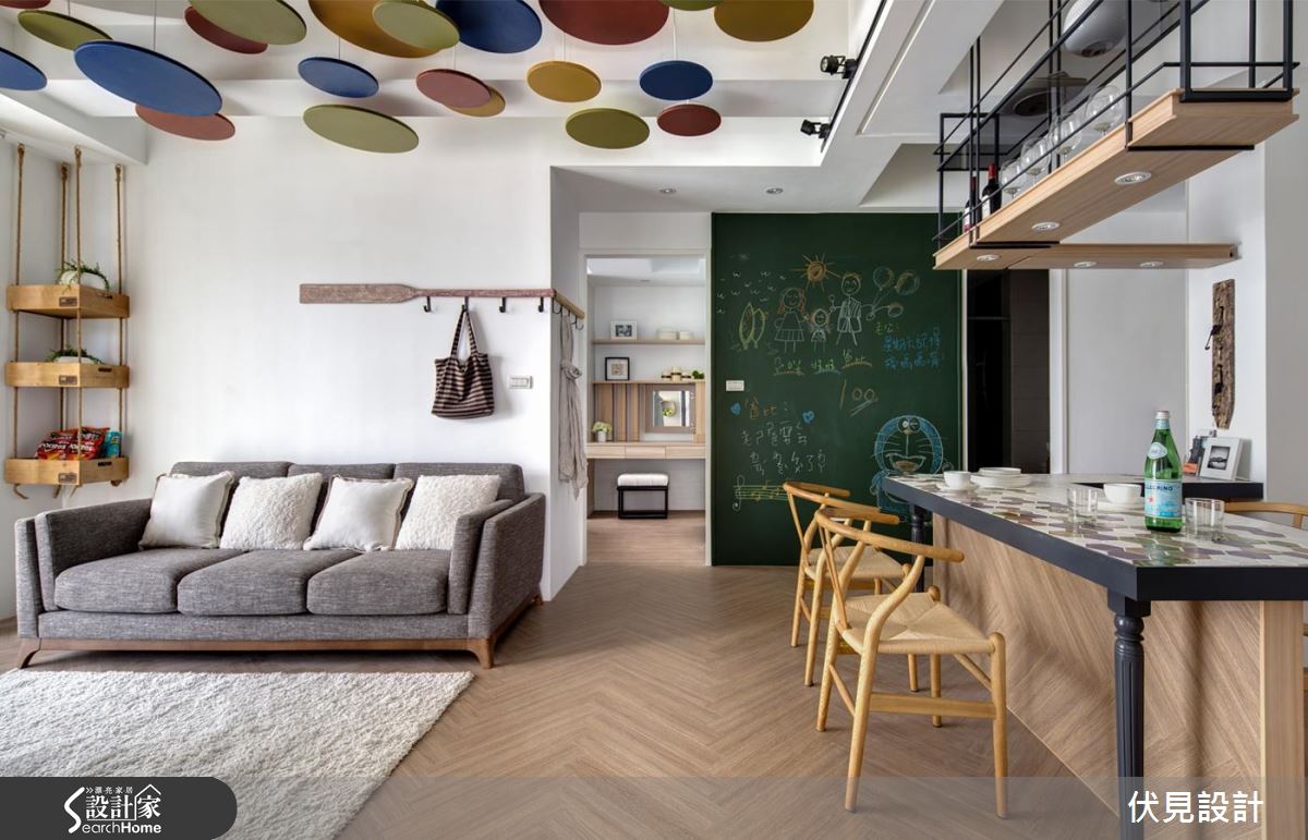 空間採人字拼木地板大面鋪設,搭配簡約潔白的整體基底,作為呼應軟件家具的絕佳背景,燈飾以活潑繽紛的形式懸吊於天花,在圓與圓的交錯之中,形成具延伸感的視覺導引,使空間更添挑高層次,並呼應電視牆的層架規劃、度假感的編織桌几、吧檯桌面的圖騰等,透過無數輕快的圓型語彙、構築喜悅而圓滿的意象;開放餐廚兼具用餐、畫室、閱讀等多重主題,在吧檯融入導角處理,並加入 L 字造型塑造流暢脈絡,同時藉由木質、鐵件、烤漆等彼此共構,將收納展示機能化為美好風景,混搭出豐富的獨特表情,給予餐具、器皿、書籍等物各得其所的置放,而一旁的黑板牆配置,則作為一家人留言塗鴉處,展現帶生活感的悠閒況味;寢臥注入少量綠色調和視覺,並於床頭羅列植栽擺飾、凝聚有氧氛圍,一旁具手繪感的櫃體陳設,則巧妙帶出不容複製的個性風貌!
