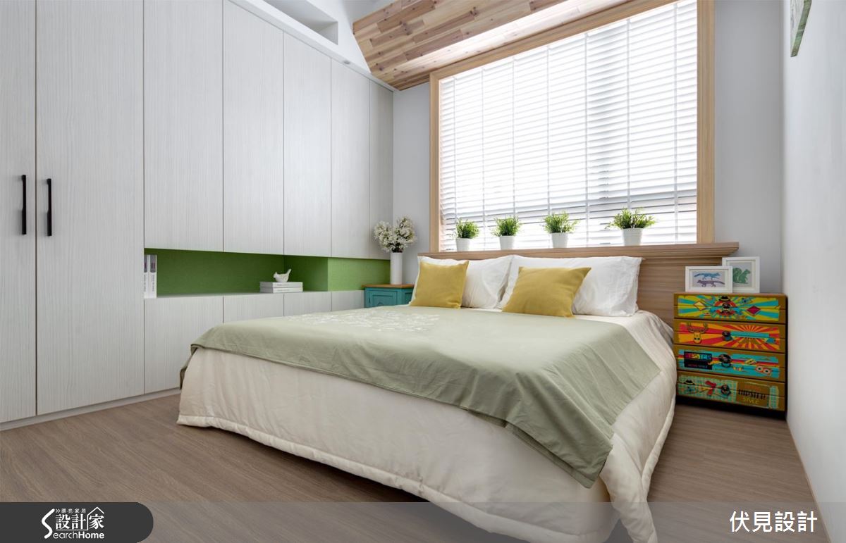 臥房為消弭床頭的樑柱壓迫,以木質作造型包覆,並銜接至床頭的窗框,搭佐百葉引進明亮窗光,構成一幅療癒感十足的畫面!