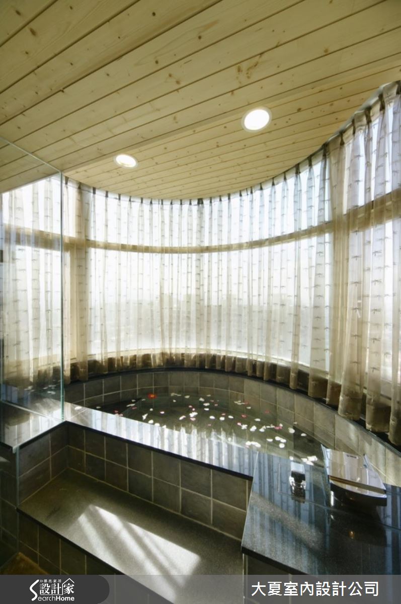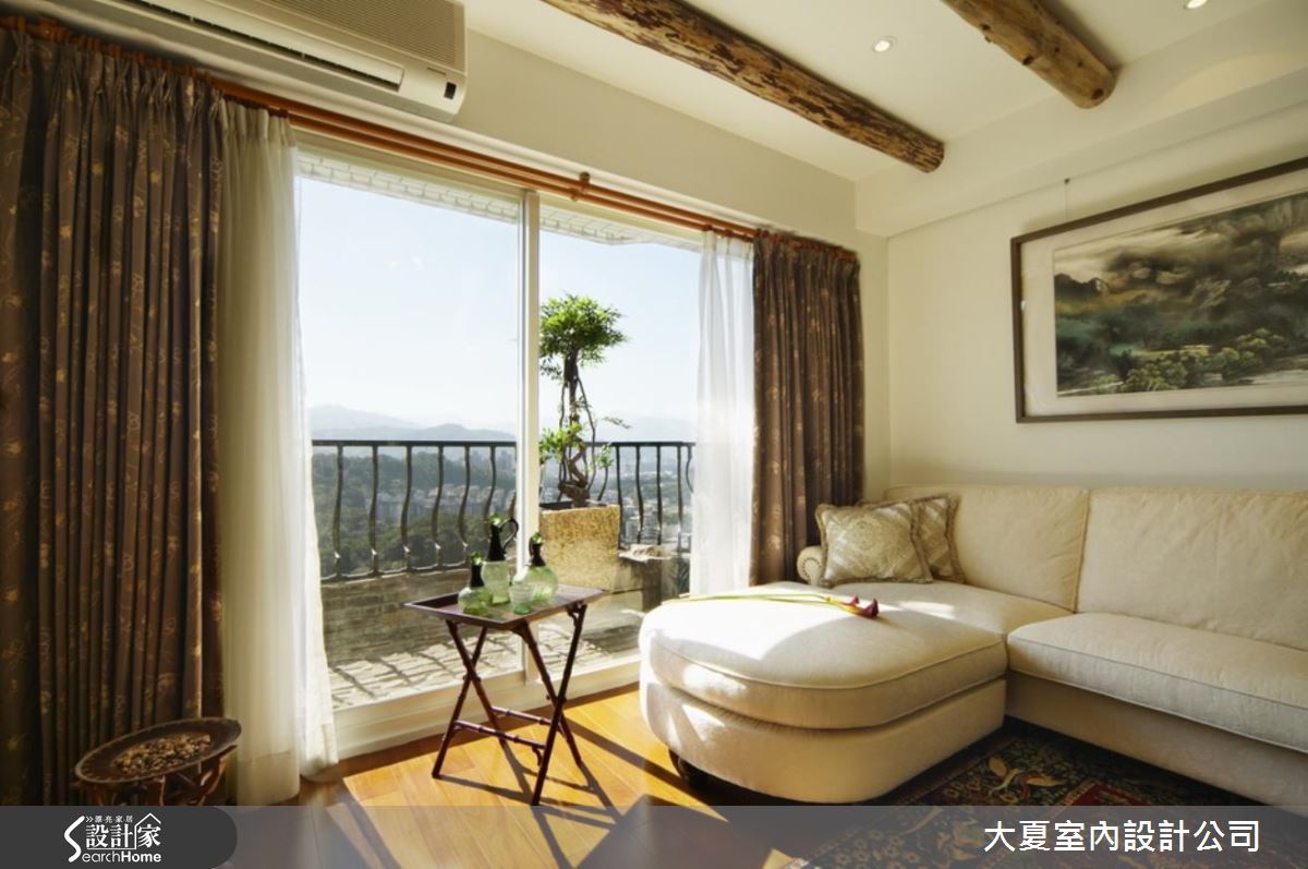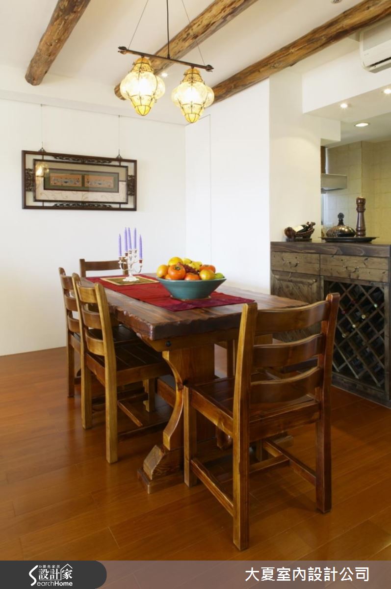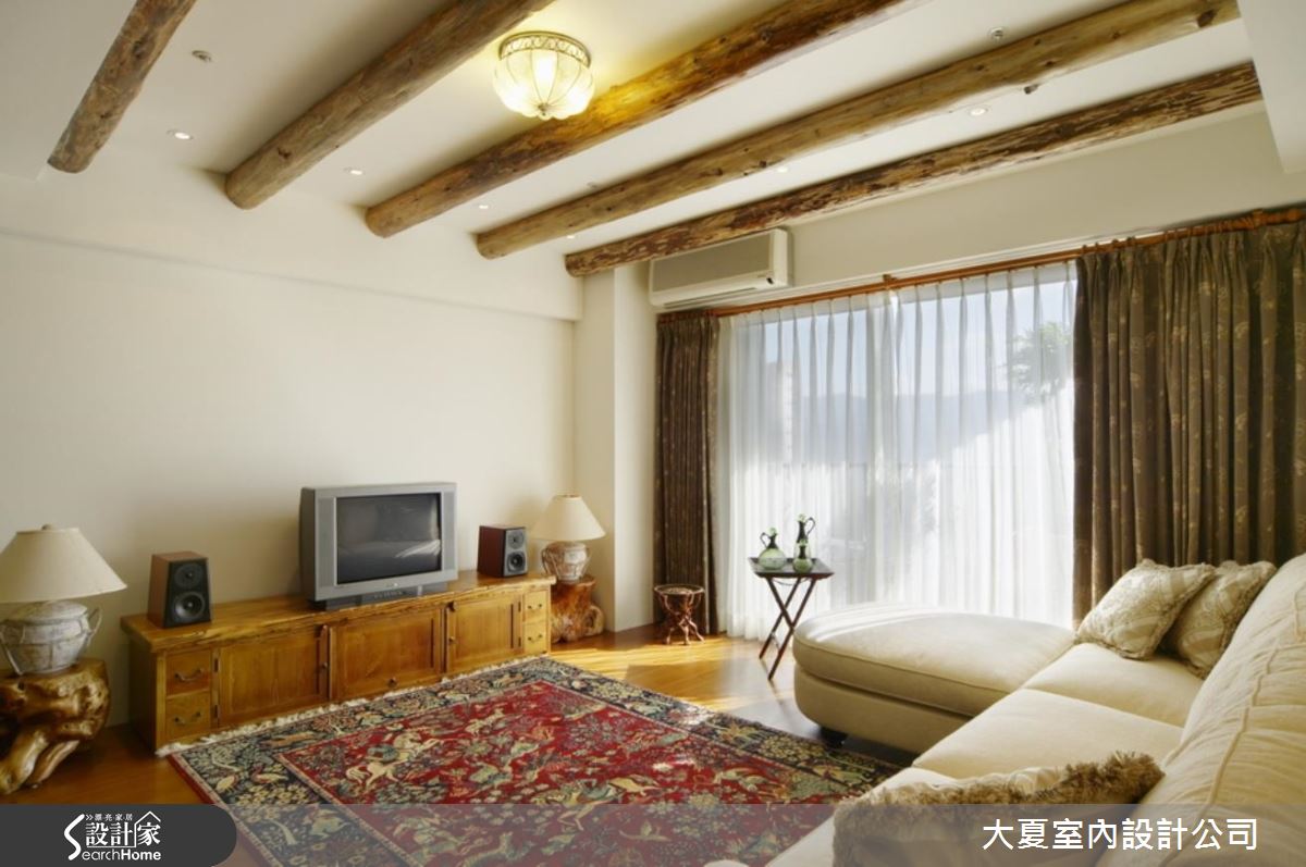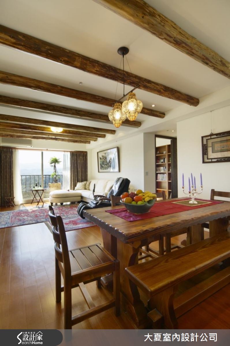 整體空間以白色飾底,磚、木頭、石材與鍛造鐵件等元素在空間裡恣意創作,這些質材經過手工處理後,所傳遞出獨特的觸感及溫度,引出愜意、溫暖的人文氣息,賦予鄉村風深度的內涵;客廳的天花板利用圓形杉木堆疊視覺層次,空間裡充斥著原木材質的矮櫃、餐桌椅等造型,挹注自然寫實的生命力;此外,更藉由民俗風地毯、鐵件結構的復古燈飾以及部分手工家具的搭配,物件上所烙下的仿舊痕跡,替愜意的室內氛圍注入一抹閒適自得的東方禪風。