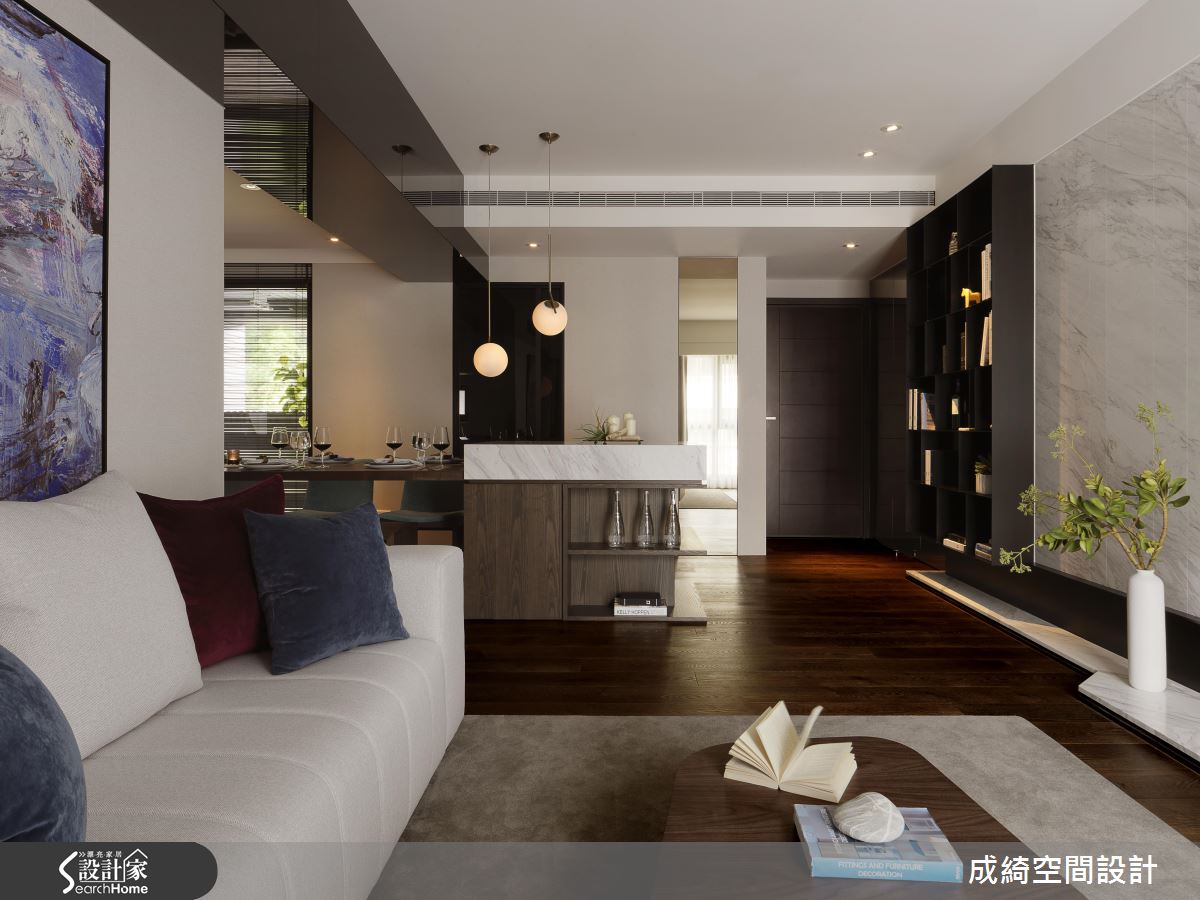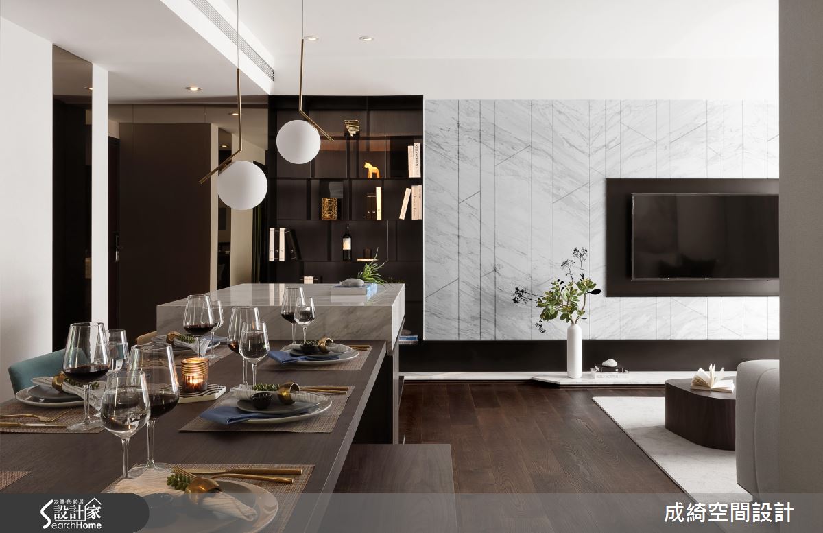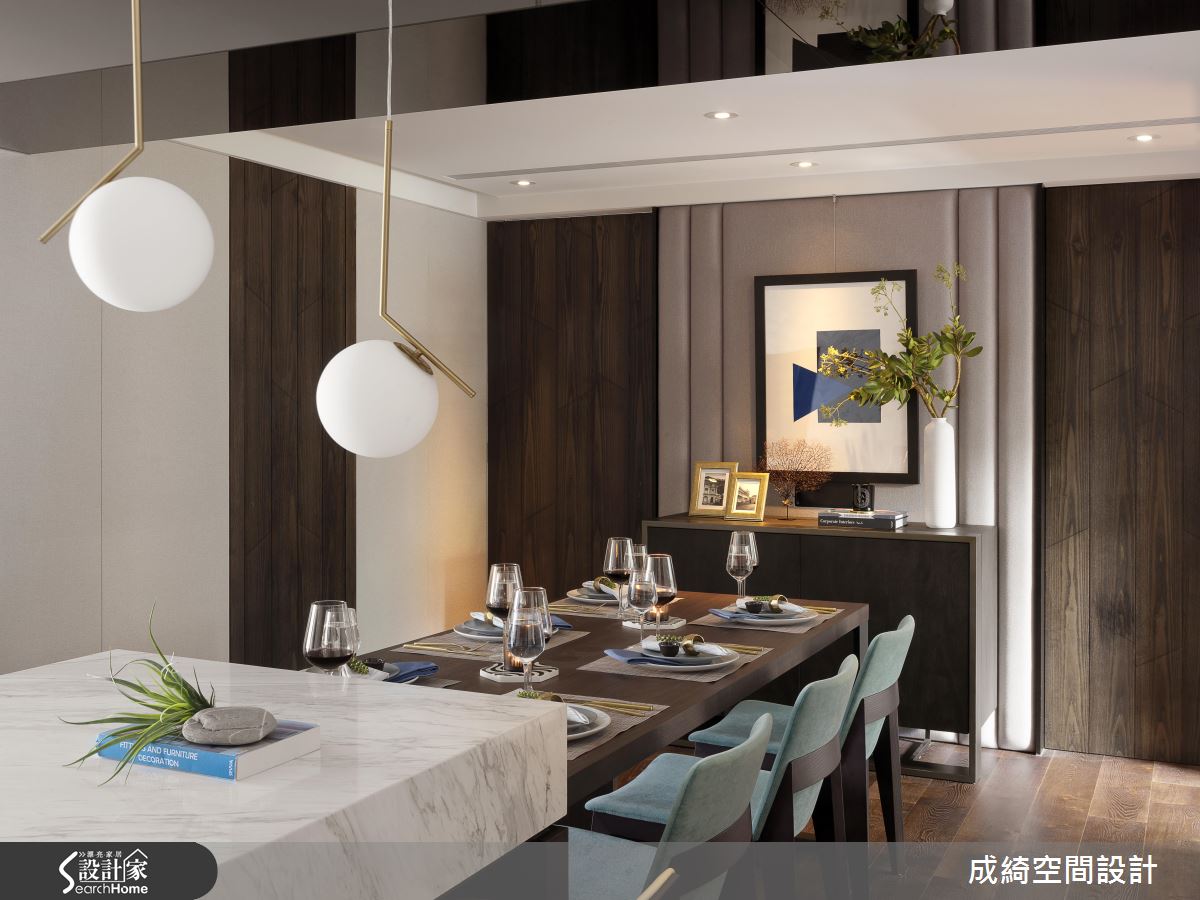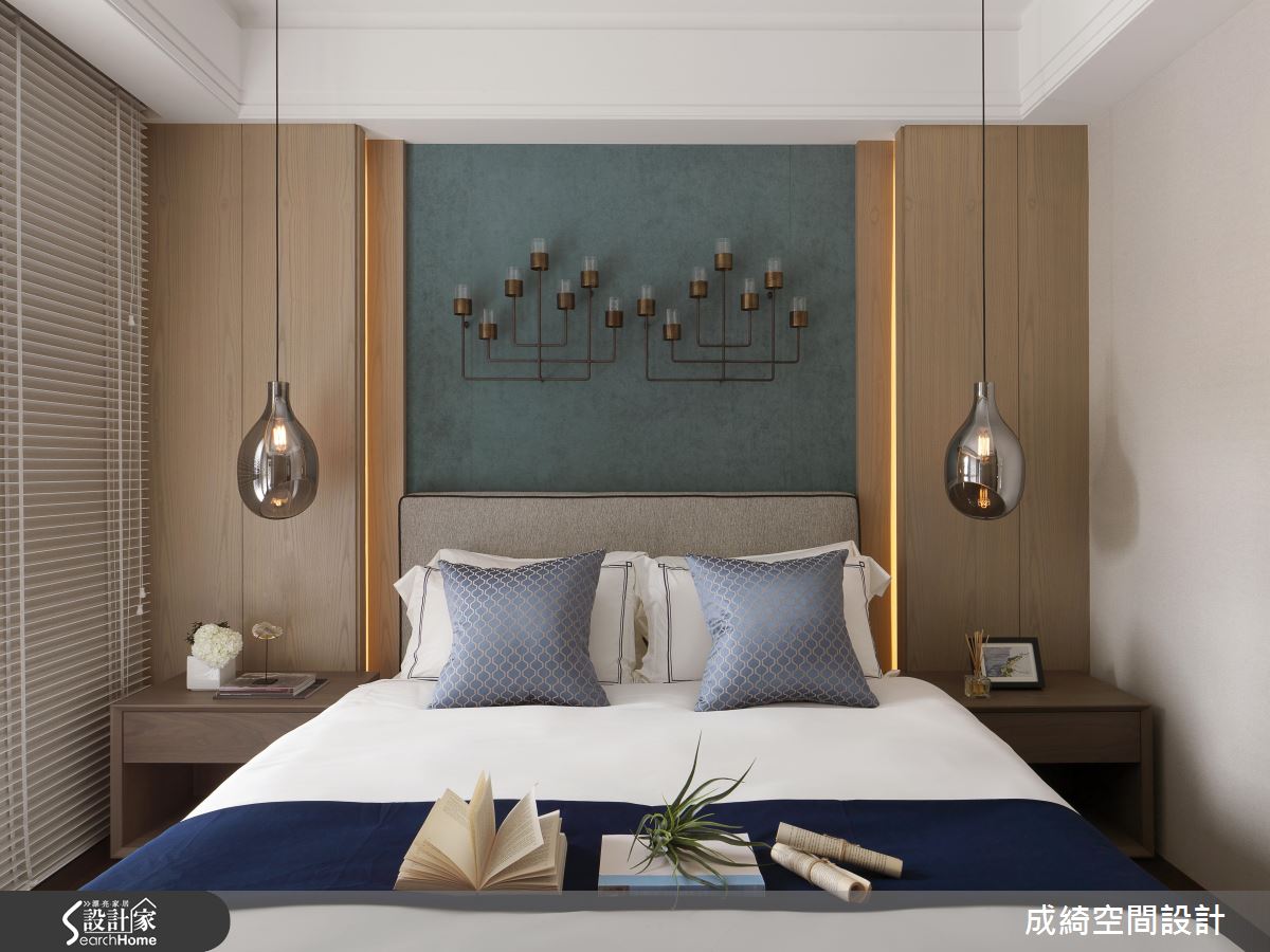 客廳的電視牆以斜切線分割立面,軟化大面積石材的厚重感,且刻畫出獨特品味;串連輕食吧檯與餐桌領域,結合簡約設計的吊燈,再加上一面端景牆的精心安排,調和出雅致的人文景緻。端景造型的後方以門扇區隔出私領域,踏入主臥室,第一眼就愛上設計感十足的床頭牆,湖水綠絨布牆面飾以手作金屬燭臺的佈置,兩側添以垂掛式玻璃吊燈,時尚、新穎的創作靈感,引出令人怦然的生活品味。
