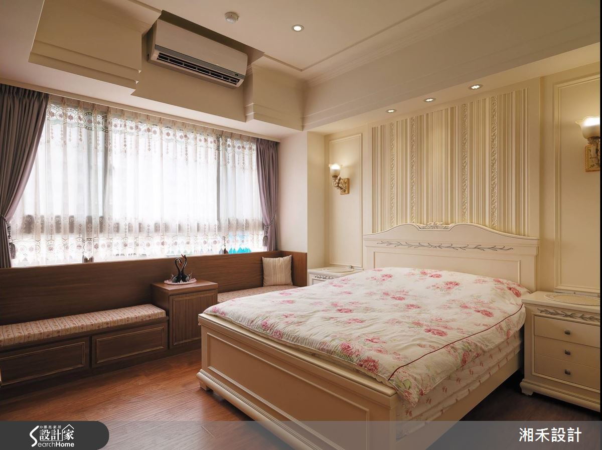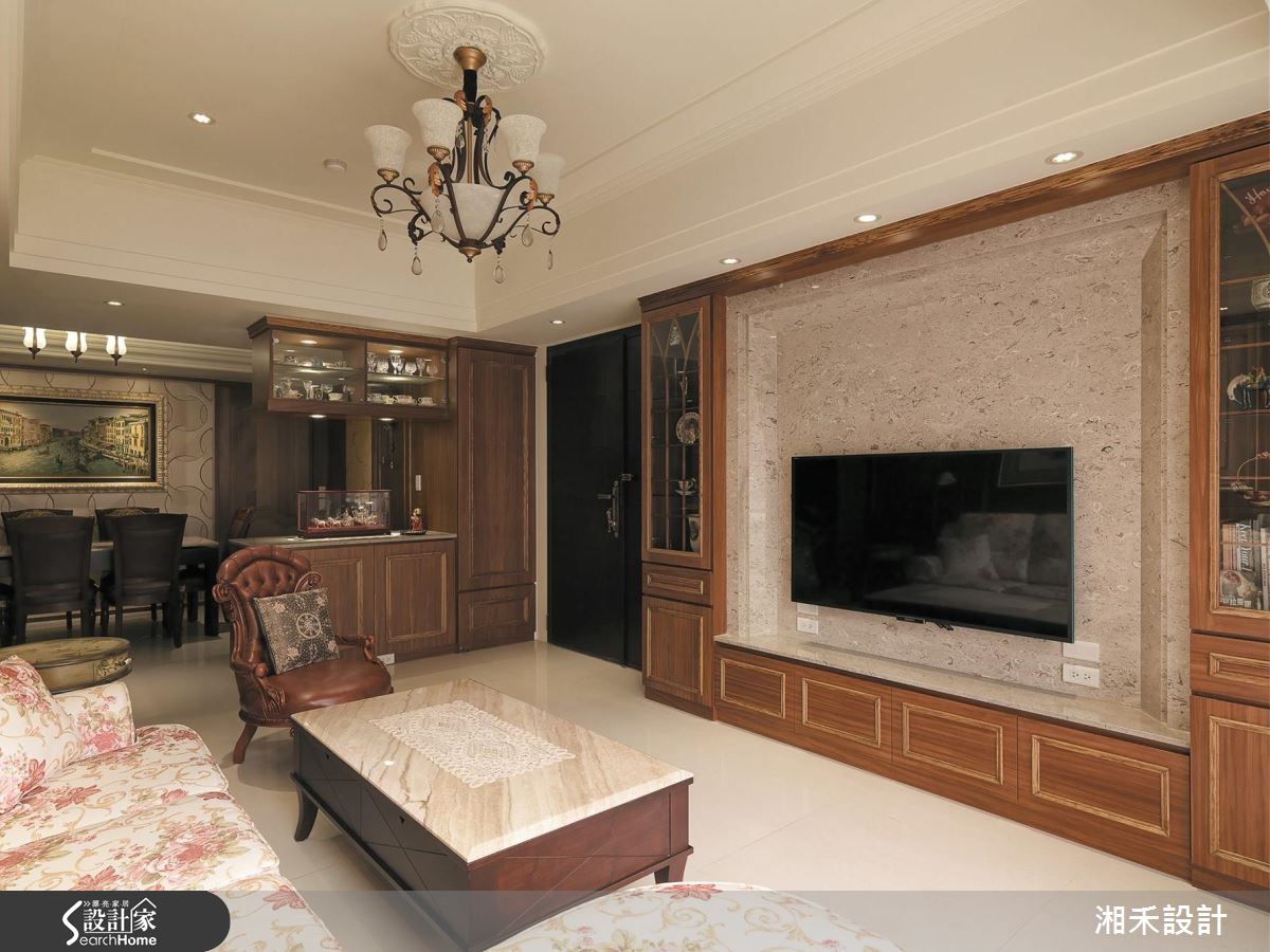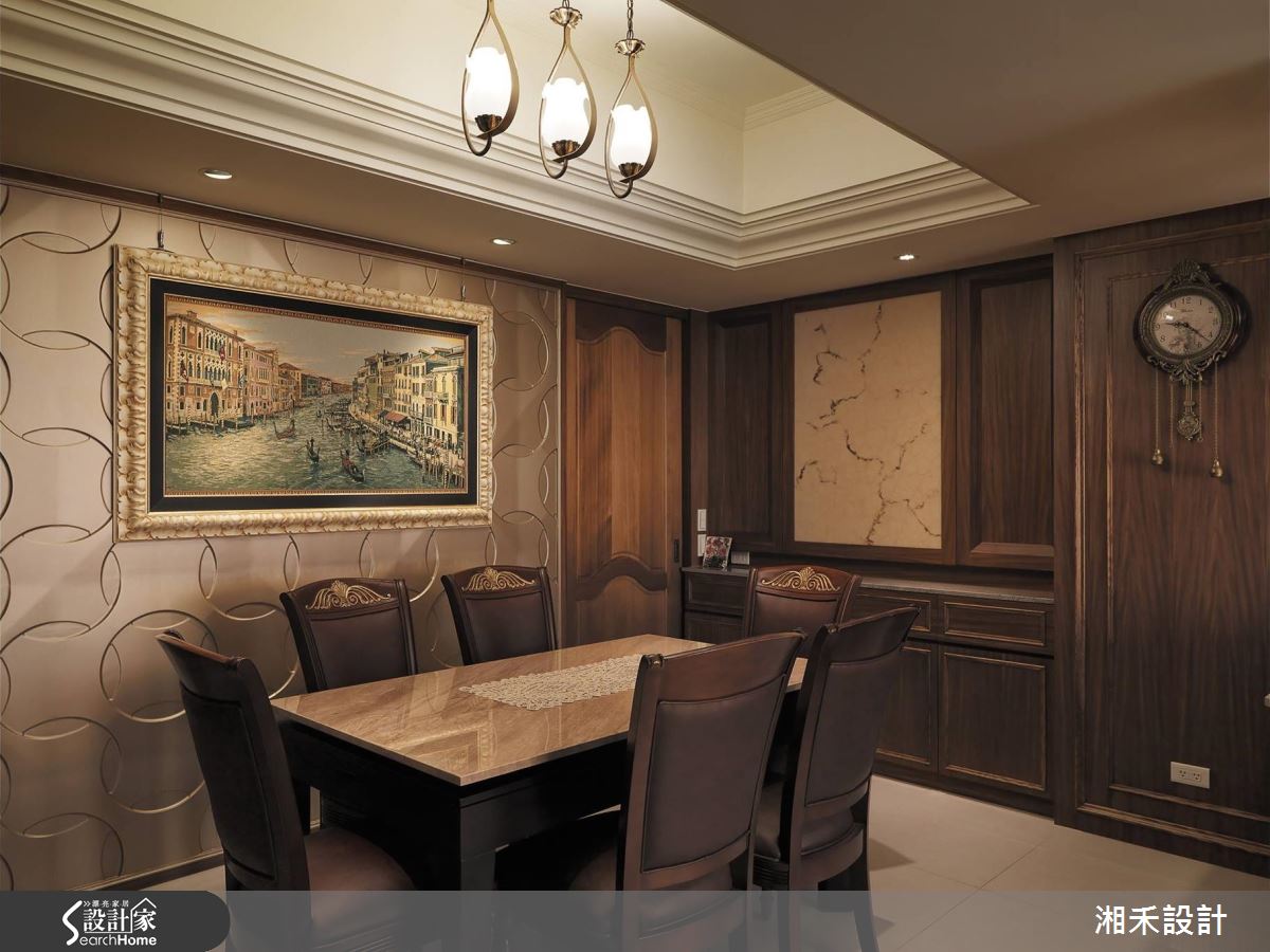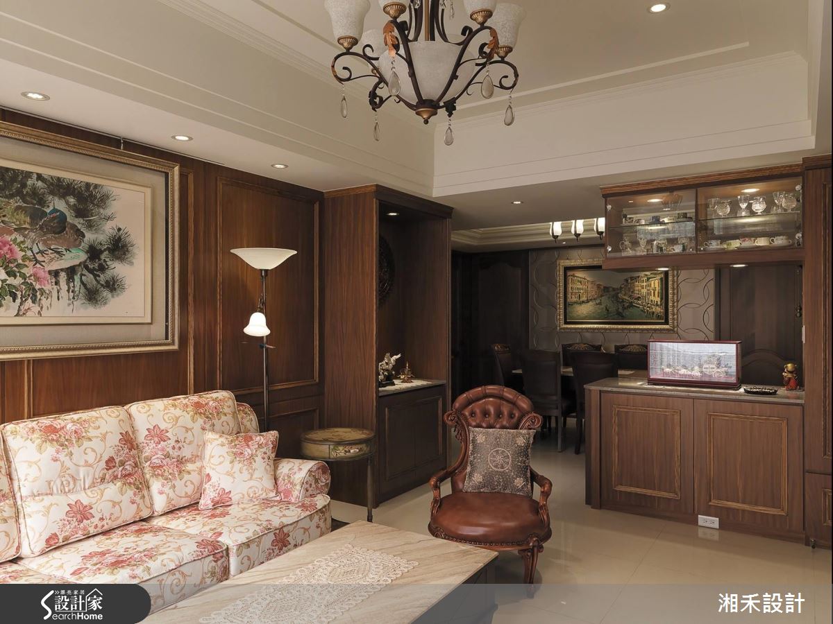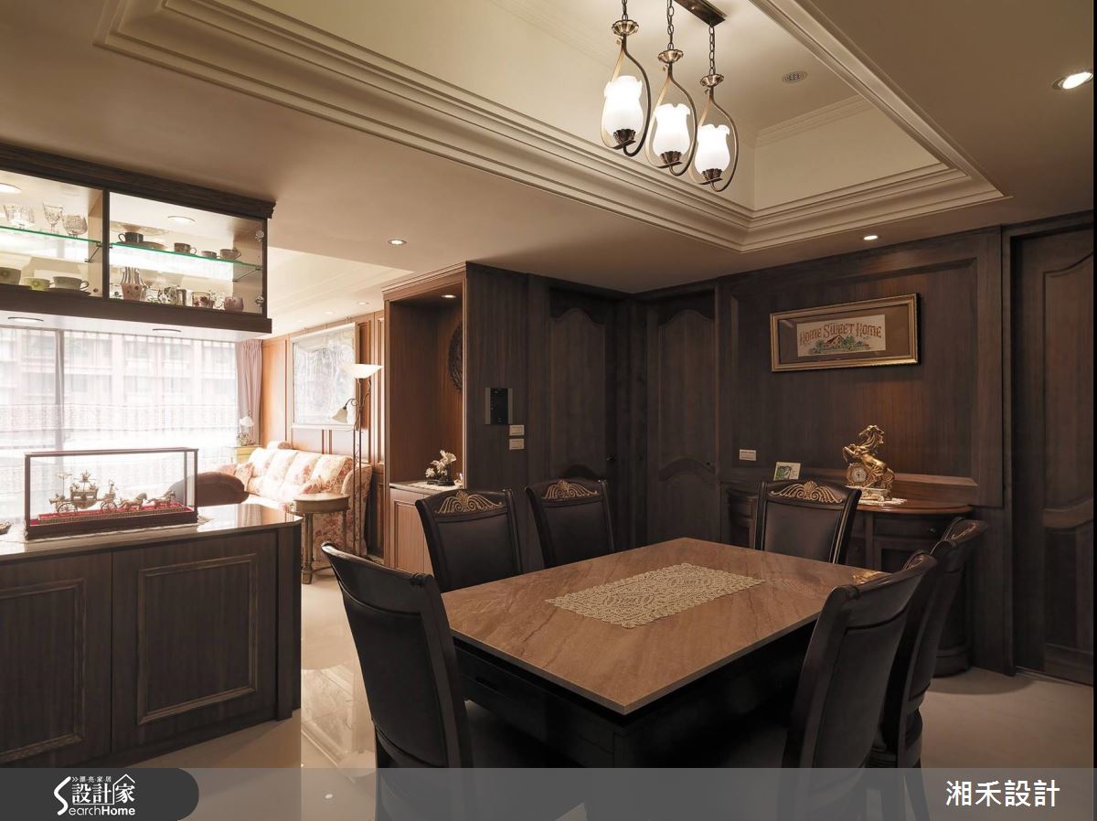 空間依循屋高條件,因應樑體分布作出天花起伏、確切區隔各別場域,並賦予線板細緻雕飾,營造美好的古典氣韻,同時注入大面積深咖啡木質色,映襯著碎花沙發的輕快質感,帶出優雅平衡的生活品味,沙發牆則擺放一幅中式畫作聚焦,對應著電視牆的石材紋理,演繹充滿自然風韻的別致對話;餐廳因著玄關櫃的透空配置,援引客廳的明亮採光,周邊環繞各種細緻面材,創造細膩的立面表情,霧金色牆面更揉入中式銅錢的立體圖紋為背景,襯托金色畫框主體,將「圓」與「方」的應用表現得淋漓盡致;寢臥在床頭描繪質地輕盈、款式多元的造型線板,構築雅致的視覺畫面,一旁則規劃了整排延伸臥榻,替私領域添注更多元的使用機能!