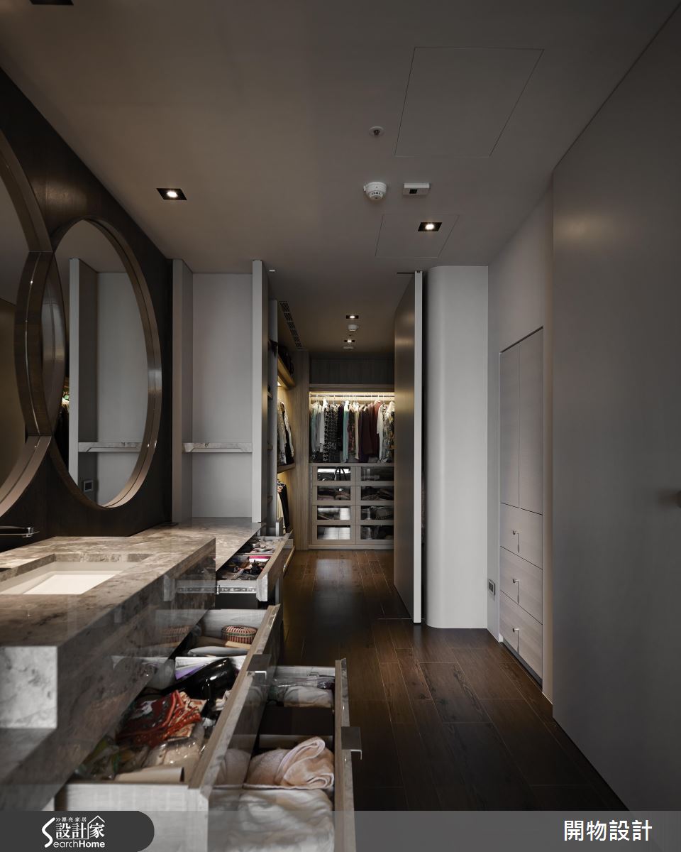 設計師以洗手檯作為中介,將更衣、衛浴機能加以整合,賦予更寬闊大器的使用範圍,且在鏡面融入獨特的圓形語彙,敘說雍容大度的東方精神!