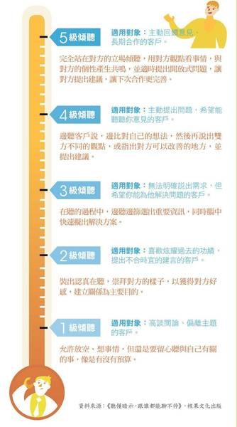 擔任SYP(Sympathize with Your Personality)企業的訓練講師內田和俊將商業現場的傾聽分成5個層級:1~4級的聽者是在傾聽中付出的力氣較少,第5級則是把自己擺第二,站在對方立場,與對方產生共鳴。內田強調,商業傾聽最重要的是聽完話之後,對不同的客戶有不同的回應,不一定只能完全迎合對方。