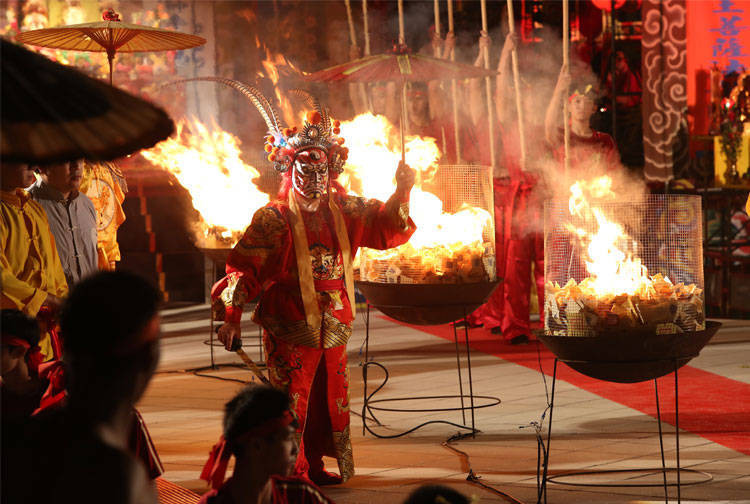 你想看明華園總團,跳一場具宗教神祕色彩的鍾馗嗎?只見鍾馗手持符咒、摔鹽米、灑淨水,腳踩七星步,手持黑雨傘,口中大聲喝斥除煞,驅趕四方惡鬼,淨化場地。