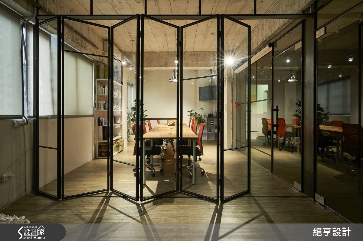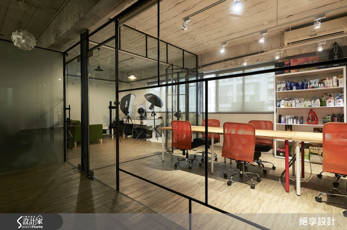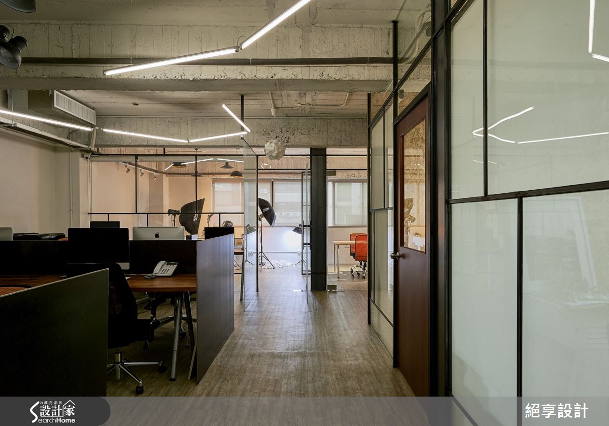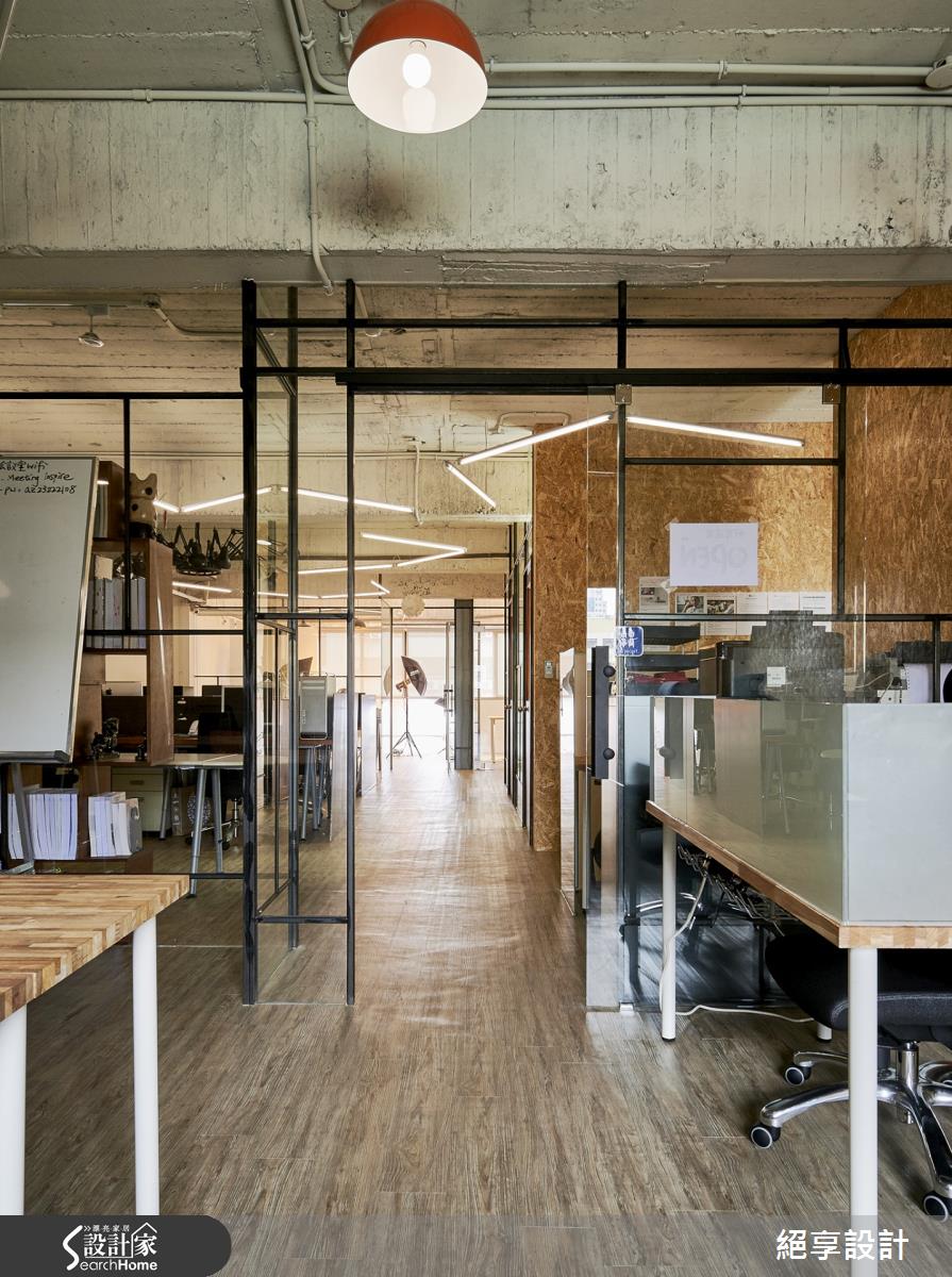 原始的水泥色大面鋪陳,結合舊板模結構創造出天花板的粗糙質感,原色泥作再搭配鐵件元素,辦公室裡還特別利用環保特質的OSB板,打造出主管辦公室與佈告牆,周圍還有一些舊家具與門板的運用,呼應環保自然的設計初衷。整體空間裡讓透明的玻璃搭以鐵件框架,取代印象中實體牆的隔間技法,讓戶外的自然光源引入後,得以恣意流動於室內裡,營造出輕盈明亮的效果;粗細不一的鐵件穿梭在清透質感的玻璃質材中,框構出層次美感且不失穿透的空間特性,而會議室與攝影棚之間特別以摺疊門結合捲簾的區隔方式,替領域轉移間締造出彈性與變化。