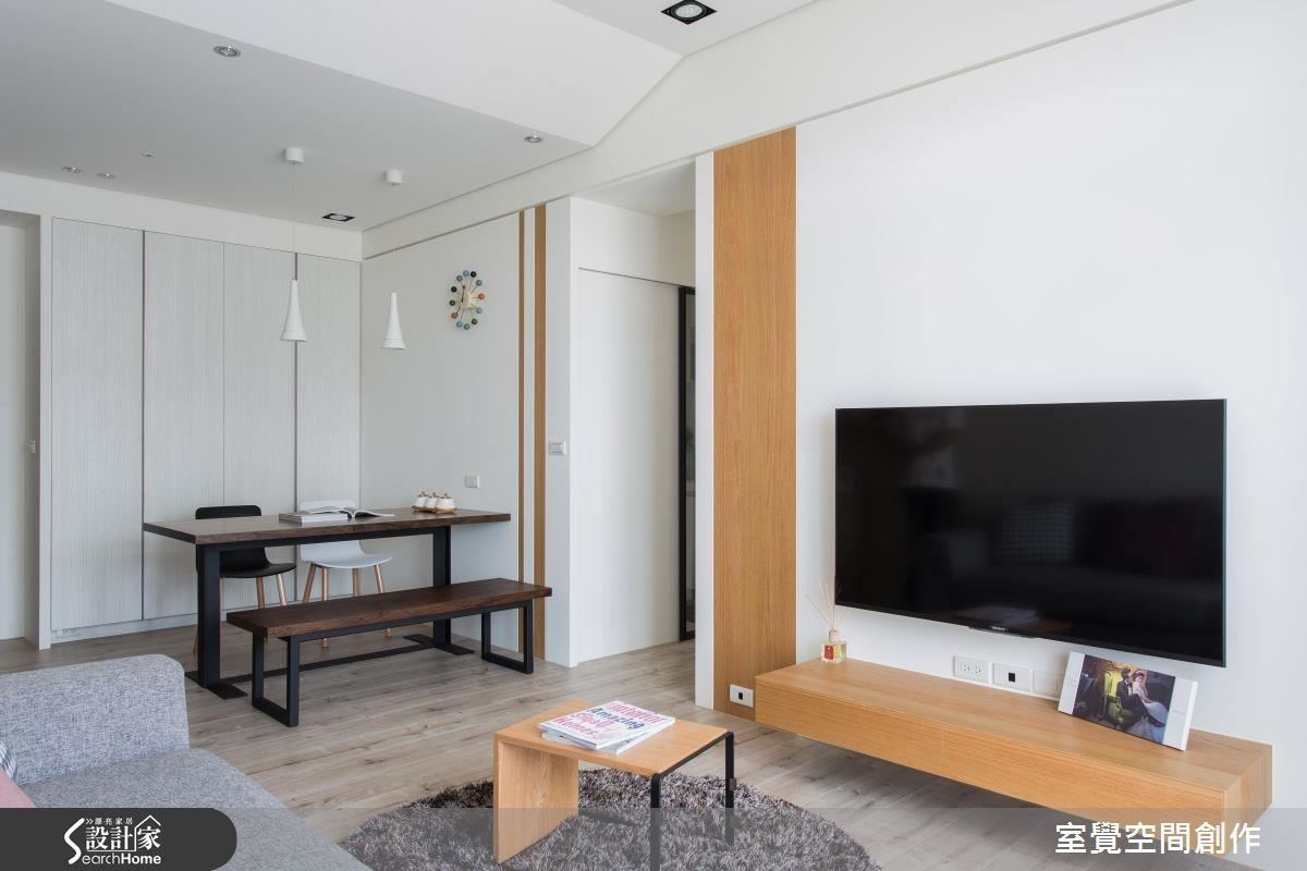 進門右側的開放展示櫃,放棄使用頂天立地的巨大櫃體,改用矮櫃與層架,不僅為空間保留適當留白,更成為餐桌的另一向視覺安定面,使用餐時不因過多物品與空間擁擠,而備感壓力。電視牆面同樣以木層板為主要視覺重點,與整體氛圍相互結合,在現代理性中融合了感性溫度的自然韻味,輕鬆創造愜意舒適的生活情調。