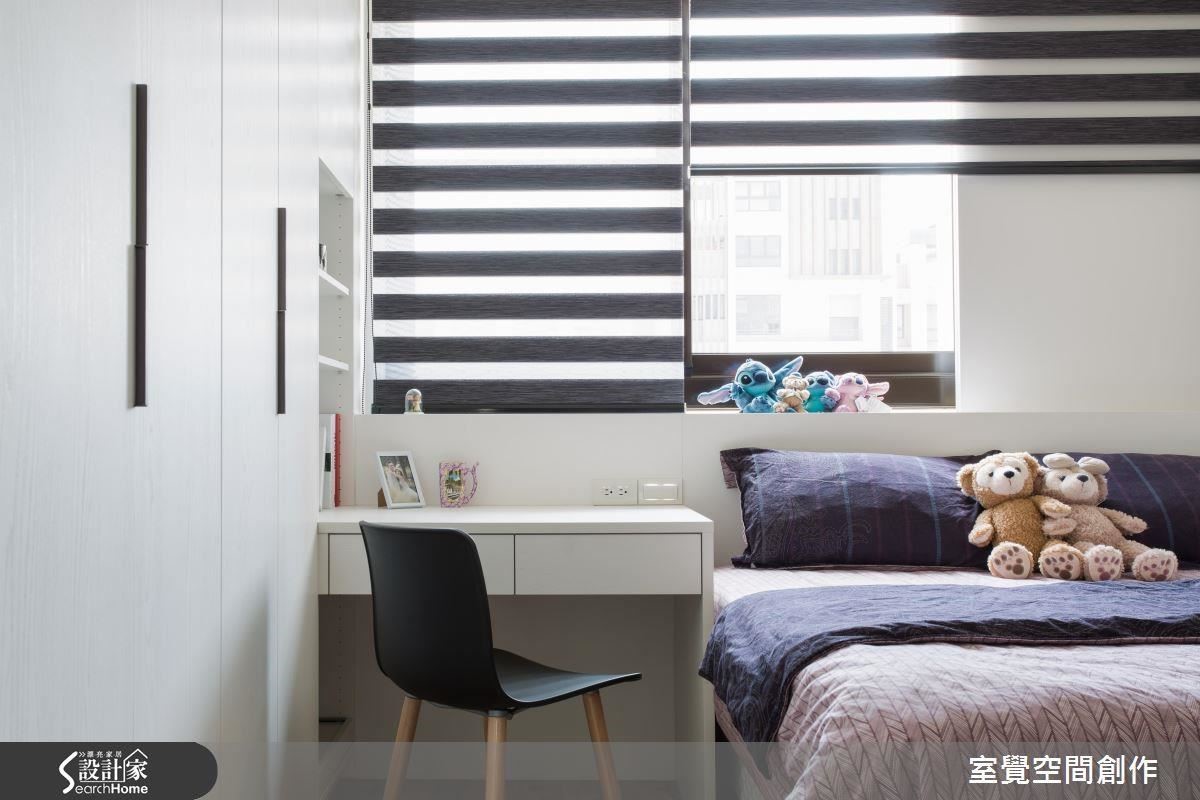 主臥房延續公領域的清爽情調,然而在大面積的白色調中,卻使用了黑色調光簾。王凱躍表示,「這是為了讓屋主保有生活隱私。」除此之外,在黑白色調的交遞中,更顯現代風格的時尚俐落。