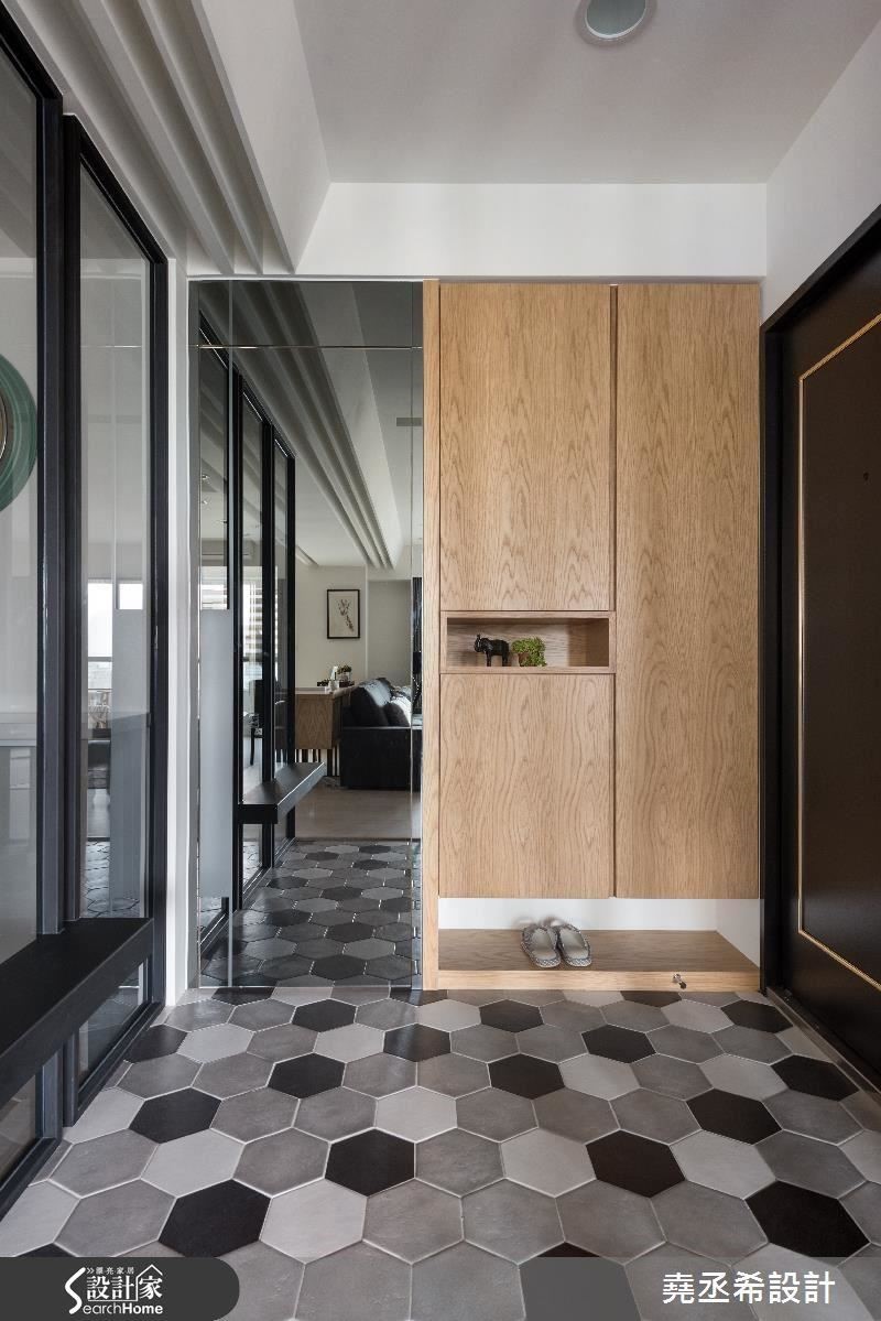 玄關處以白、灰、黑三色六角拼貼地磚,運用適當的比例拿捏與對比,塑造一進門的趣味吸睛亮點;同時利用全身鏡將儲藏空間隱藏在後,打造視覺豐富卻不雜亂的玄關空間。