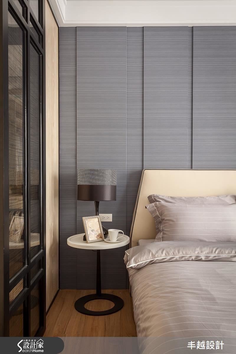 主臥室以灰色床板為背牆,蘊涵暗抑之美,更衣室之推拉門片,以透明玻璃貼上細格紋的玻璃紙,描繪出細緻的美感。