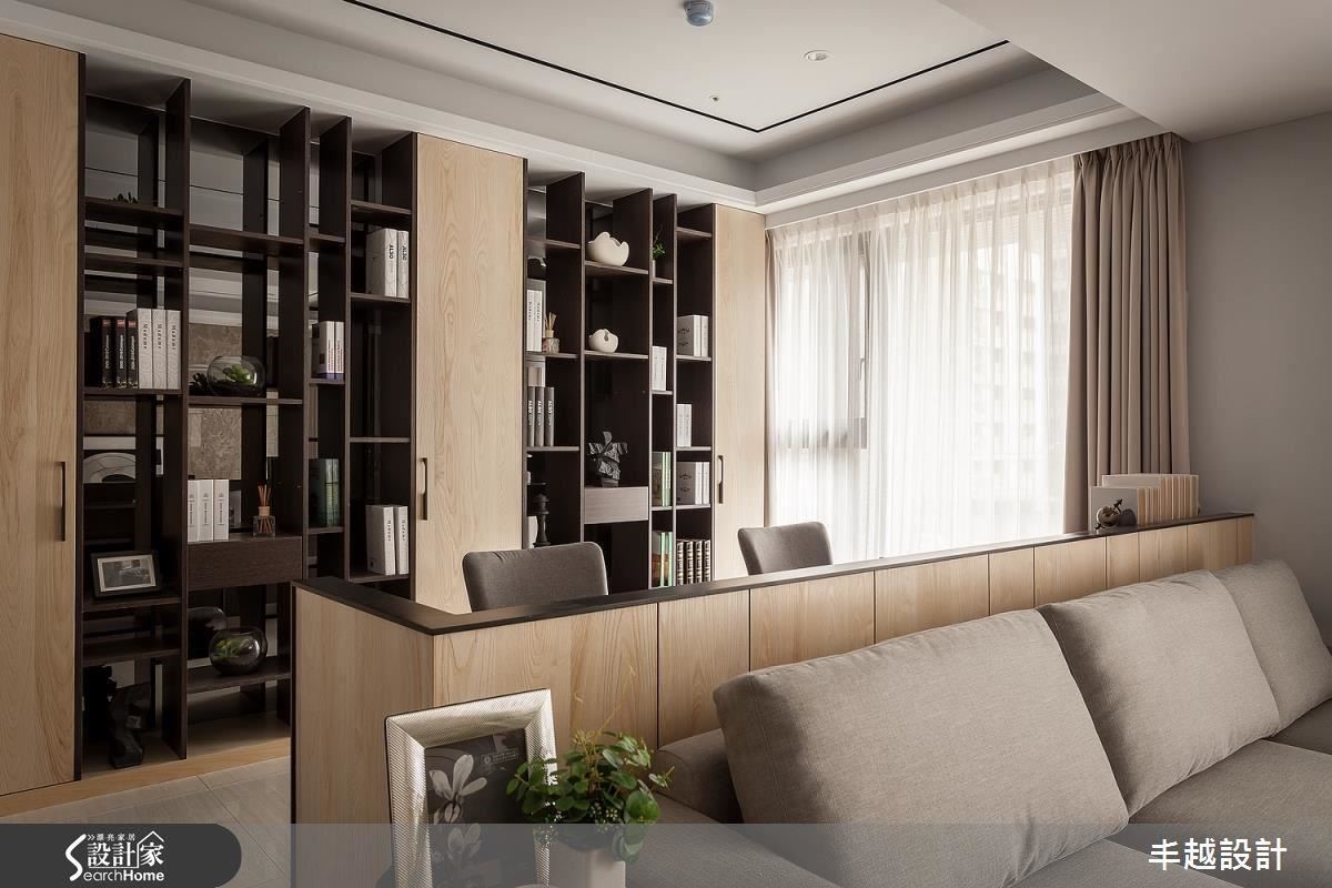 餐桌旁的頂天展示酒櫃,可以擺放屋主喜愛的裝飾品和珍藏紅酒,與特製的油畫推拉門,共築餐廳邊牆的藝術端景,亦可將電器櫃藏匿於無形,不擔心破壞美感。客廳場域營造的是寬敞的舒適感,大面積的落地窗引入絕佳採光,配上整面大理石做為電視牆,更加提升質感。客廳後方的開放式書房,富含使用上的變化性,背牆以不規則格架,跳出櫃體活潑度,並以黑鏡為底做投射效果,讓設計感與展示性相輔相成。