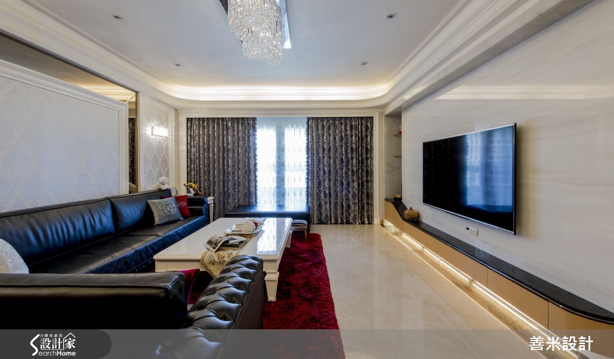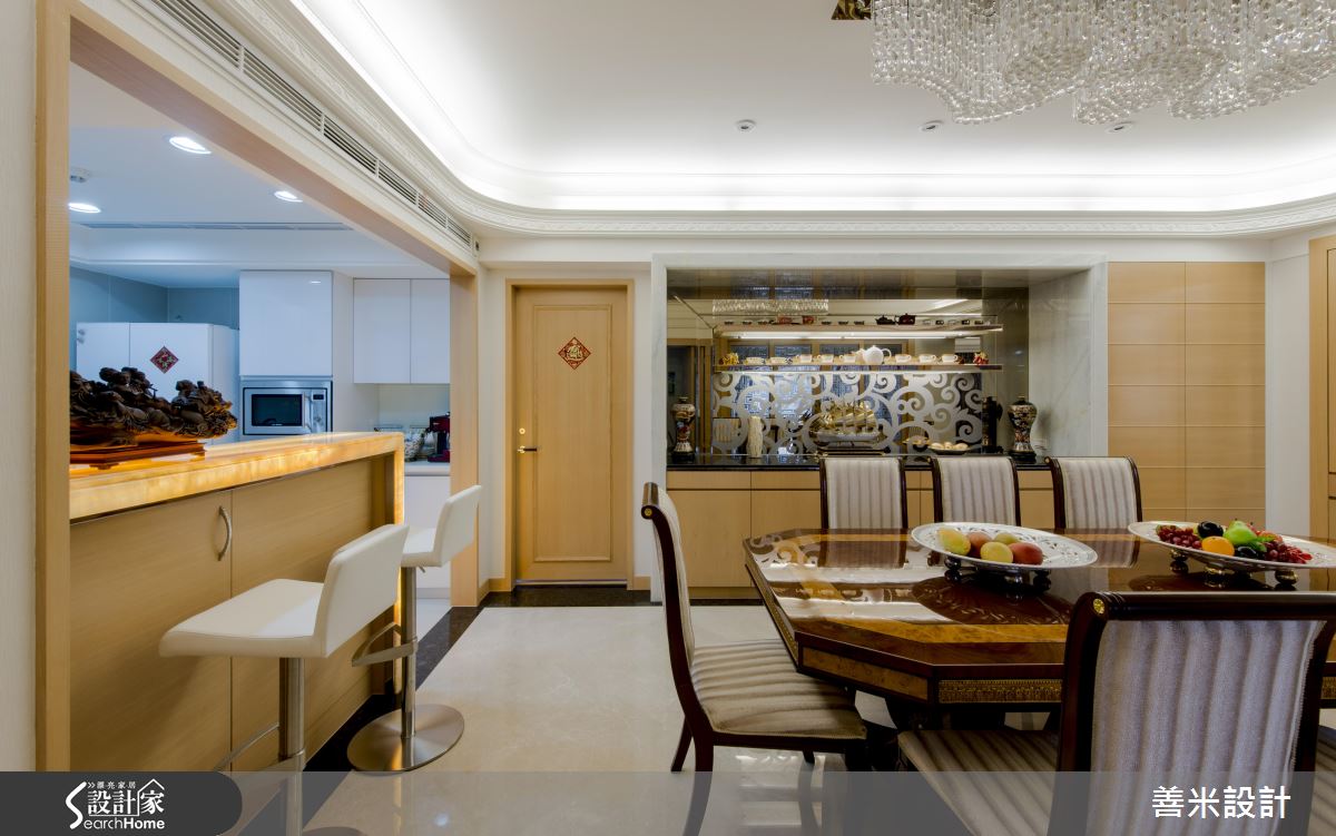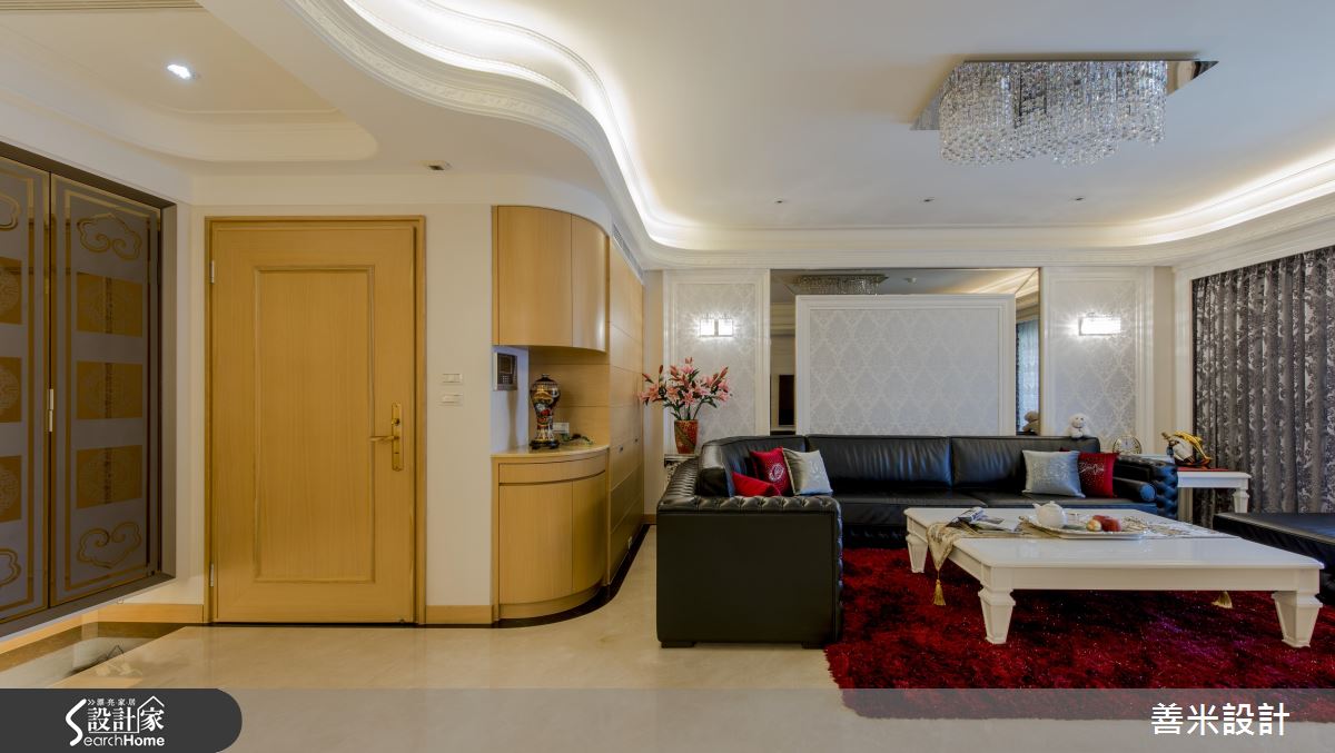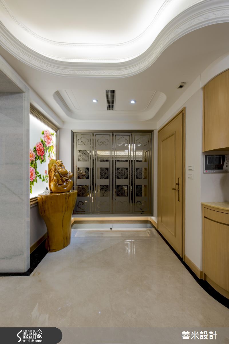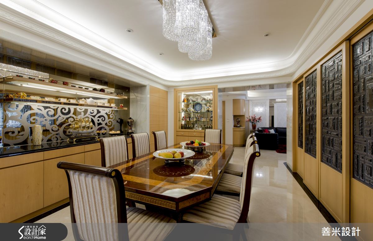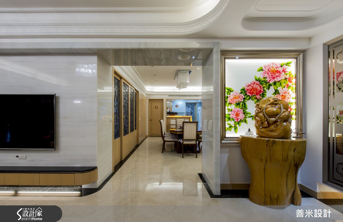 玄關先以彩繪琉璃創造出端景牆,藝術的動人美感成為絕佳迎賓;整體公領域以乾淨、簡約的質材刻劃,簡潔圓弧勾勒出天花板視覺,俐落的大面積石材鋪陳出大器之姿,局部則揉合傳統的安麗格木皮,讓居所不過於冰冷,多了些溫暖的感受;天花板飾以水晶吊燈,壁面結合鈦金、鏡面噴砂的元素,挹注新潮美感,光源透過鏡面折射出明亮視覺,與引入的自然光相互輝映;部分角落搭配屋主的逸品收藏,融合多元的美學元素,挹注人文的非凡質韻,體現高雅的生活質感。