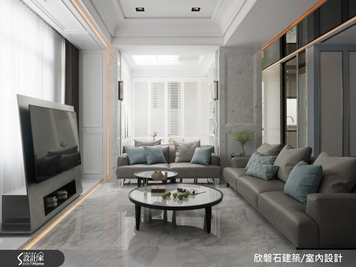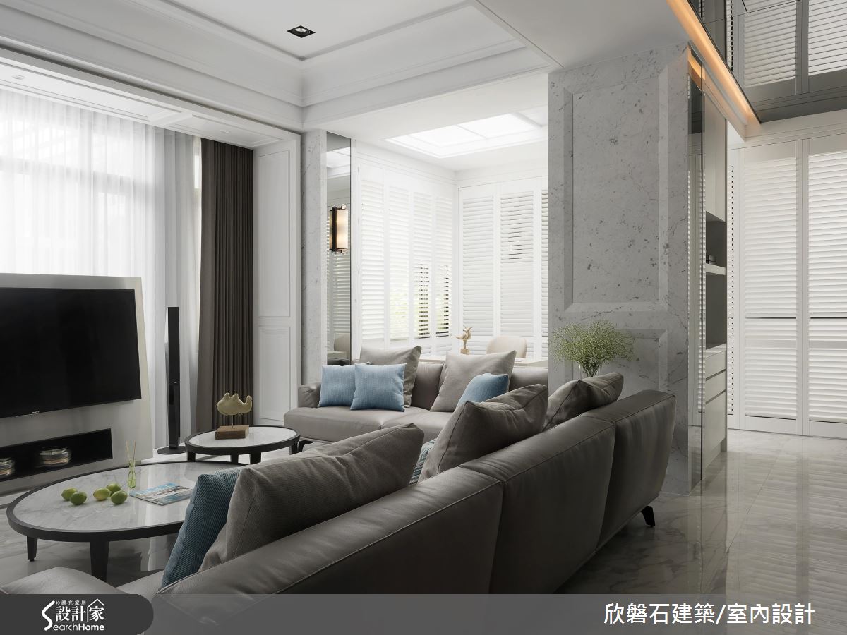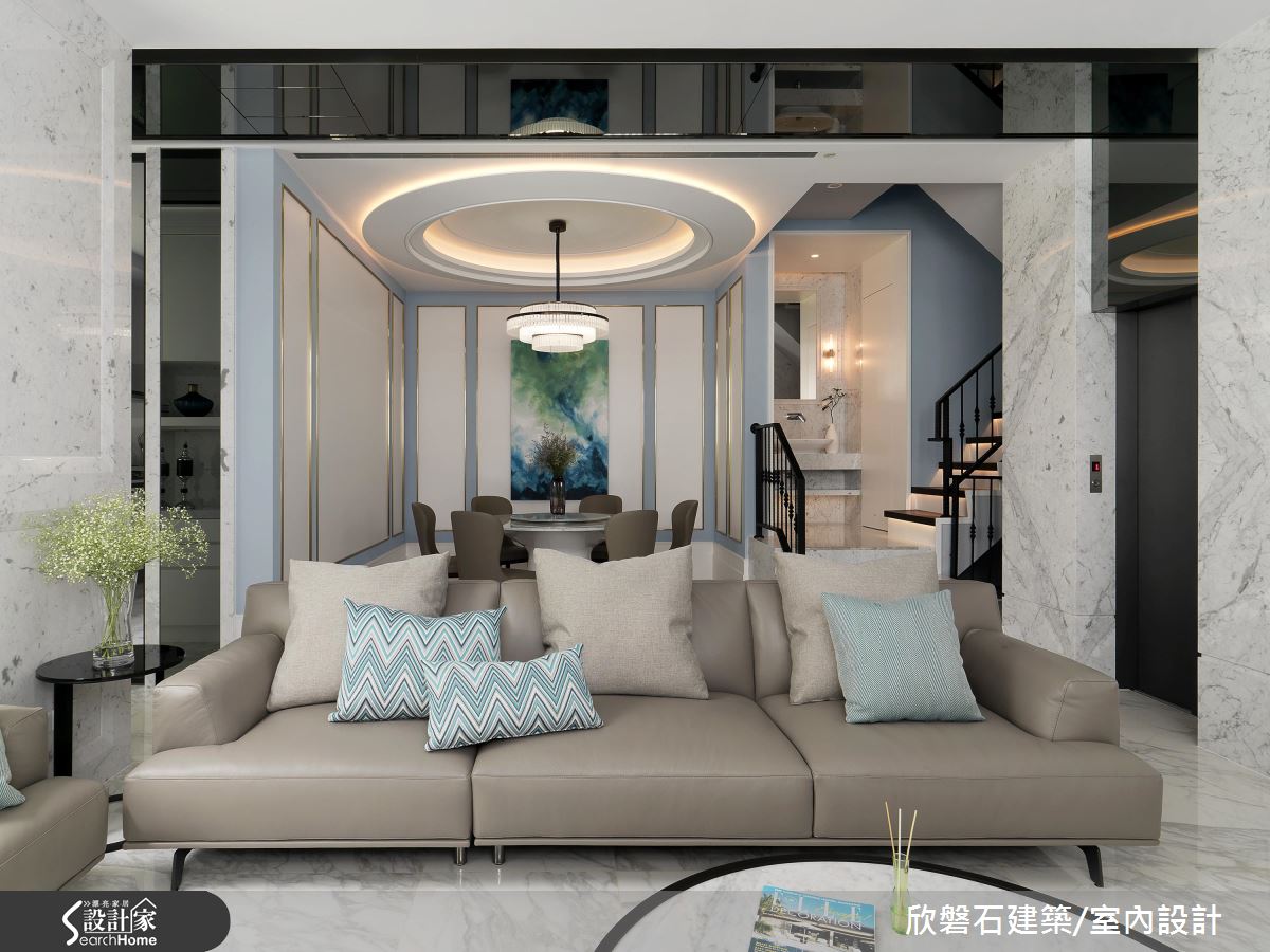 原本房屋基地並不方正,形成許多難以利用的畸零空間,客廳位置也十分狹迫,無法彰顯寬闊大方的豪宅氣場,設計師連貫客廳和餐廳位置後,讓客廳空間向後延伸出景深效果,樑柱上包覆卡拉卡特大理石,搭配灰鏡及細部的燈光佐飾,挹注典雅唯美的居家質感。書房以純白色為主調,大幅提升整體空間的明亮度,並以百葉窗取代窗簾設計,帶來清新而浪漫的異國風情,天花上方運用燈光打造宛如天井的效果,彷彿隨時徜徉在日光下。來到二樓,起居室兼具女主人的按摩室功能,營造放鬆舒適感,並提高淺藍色的比例,搭配鈦金屬材質,在柔和中也有精緻奢華感;臥室床頭運用繃布塑造立體質感,並以紗簾調節光線,調製出舒眠環境。