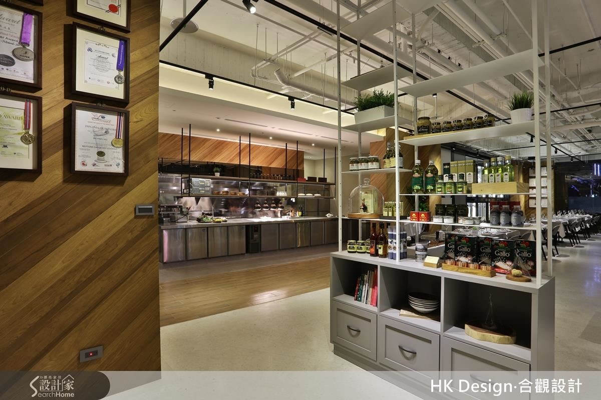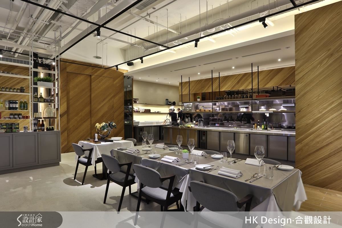 大膽採用全開放式規劃,展開廚房領域,將廚師身分重新定義、兼具表演者功能,而一字型的不鏽鋼廚具設備,則打造立面的協調感與俐落性,使賓客們在用餐之餘,也可親眼目睹廚房內部實境,獲得味蕾與視覺的雙重滿足。