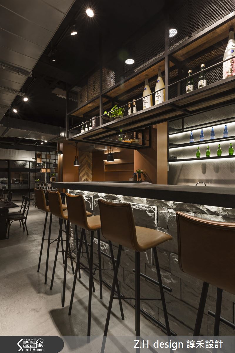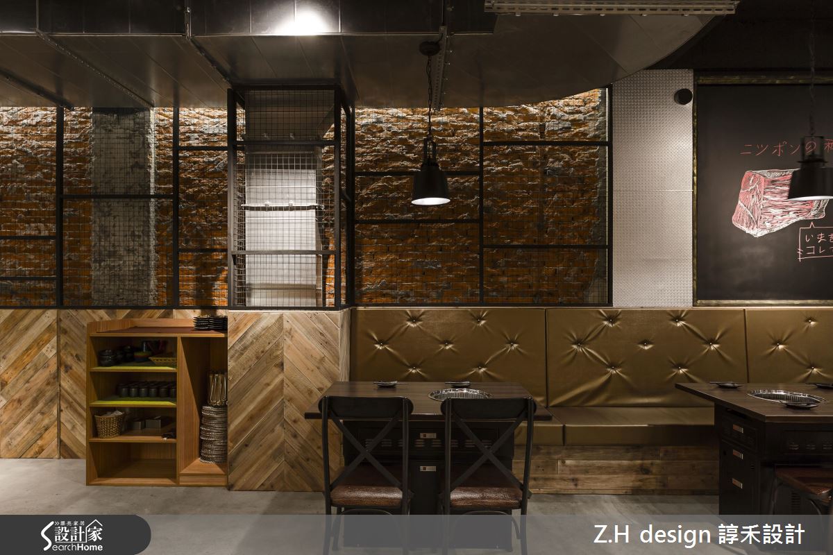 設計師翻轉一般對於燒肉店日式裝潢的既定印象,以富有個人特質的倉庫工業風為主軸,打造新潮的用餐感受。雖然將重點放在硬體設備購置與安全性施作而大幅降低建材預算,卻絲毫不減道地風格。入門處以各式霧面玻璃與窗框拼貼,宛如 60 年代的老教室,巧妙在窗邊嵌入吧台,破除內外隔閡。入門左側以工業環狀吊燈點亮放置釘扣皮椅的候位區,後方壁面以金屬美耐板增添性格氣息。利用鏤空鐵件層架與空心磚作為屏隔,後方順應屋型,規劃長型用餐區域,以大面積黑板與火紅文化石提純經典風格,皮革繃布則注入復古氛圍,而牆面下半部的人字拚造型木質板材更添畫面的層次感。底部更規劃附有吊櫃的方形吧台區域,滿足不同用餐需求的顧客。穿越後方兼具大量置物功能的長廊,便是包廂式座位,在此變換調性,以日式風格為主。