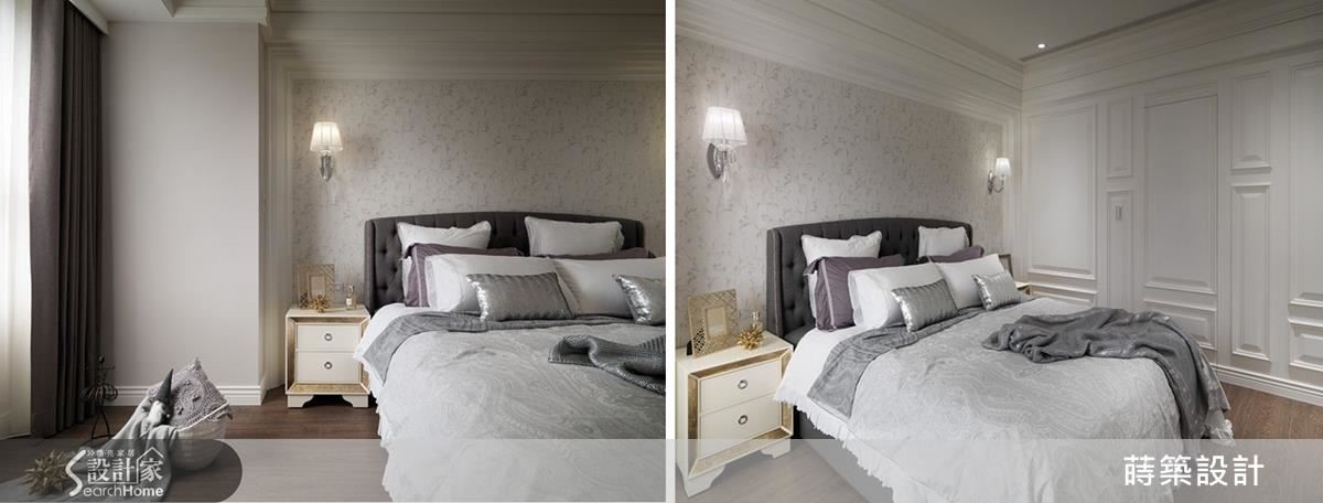 原有客廳在靠窗處架高地板做和室,朱總監將和室拆除後,再把原本凹向更衣室的牆面拉齊,雖然客廳實際面積變少,空間感卻因為方正格局反而擴大許多,主牆壁面以繁複的線板點綴,搭配圖騰壁紙裝飾出華麗感,顯得大方又沉穩(左圖)。