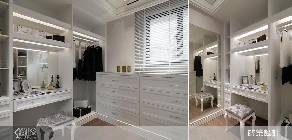 主臥的更衣室全部以白色櫃體,配合間接光源、施華洛世奇的水晶把手,營造出明亮、寬敞又時尚的空間(左圖),任誰也很難想像,一樣的空間,在之前卻是侷促又昏暗。只是不同的櫃體組合,加上顏色與光線的運用,儘管比之前只是多出不到 0.5 坪的化妝桌空間(右圖),但整體感天差地別。