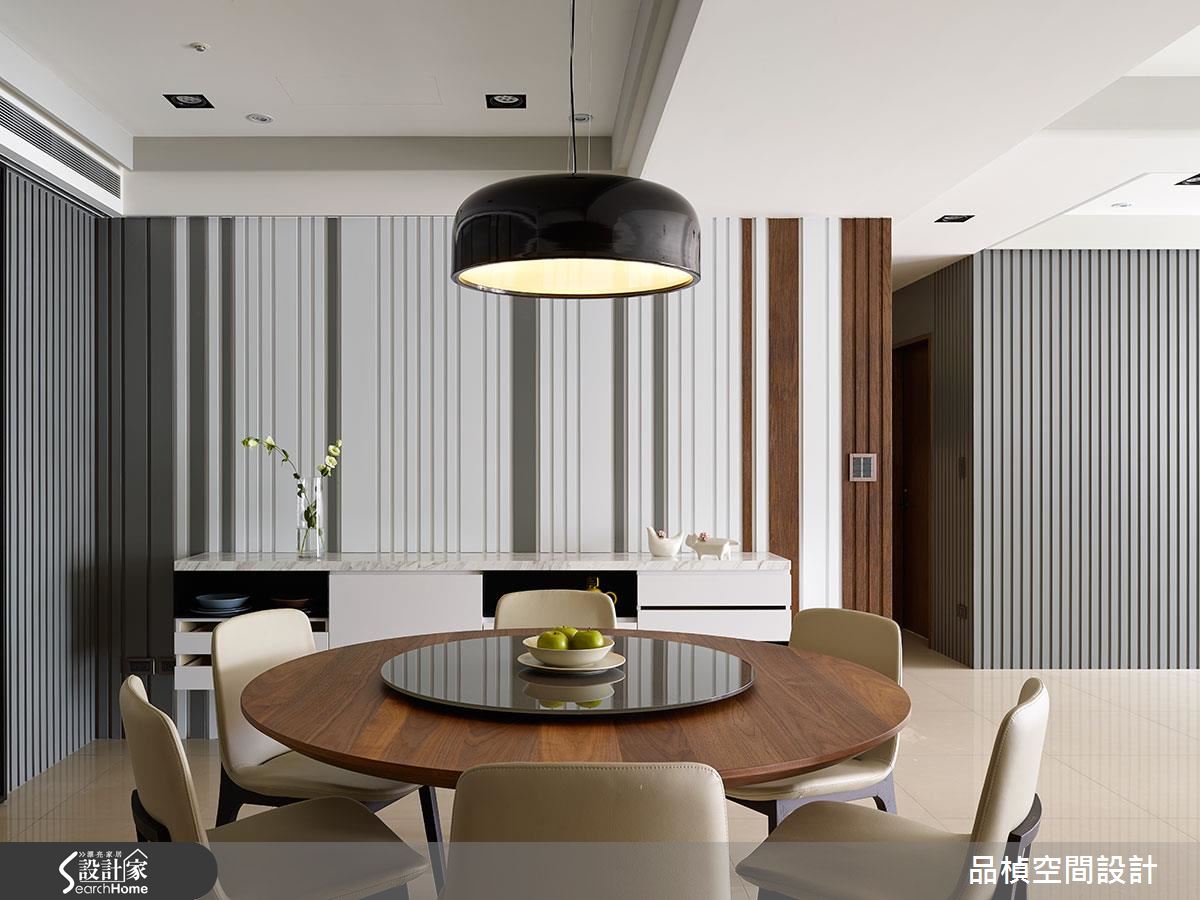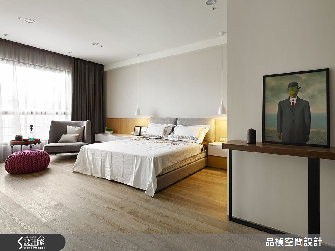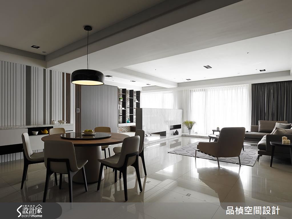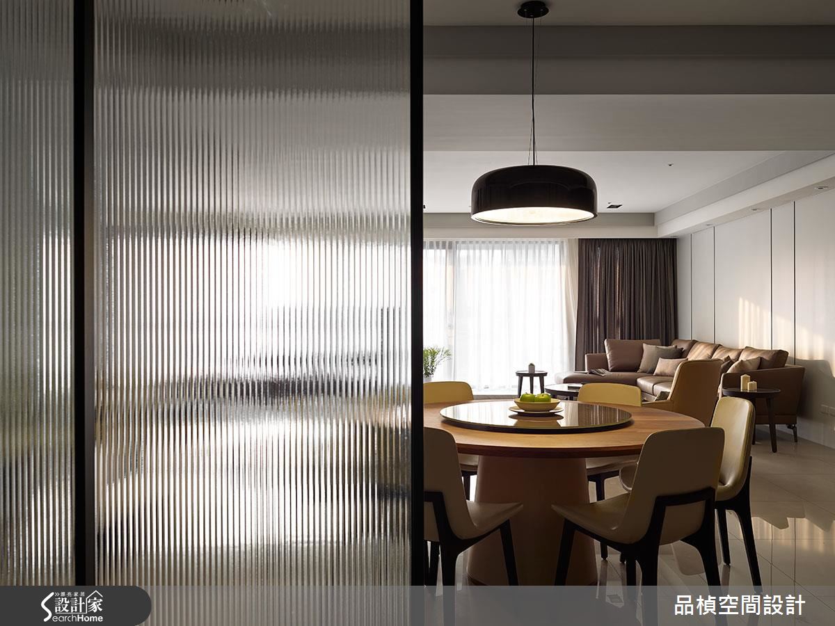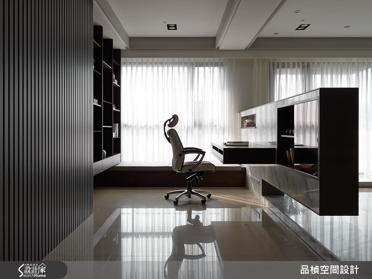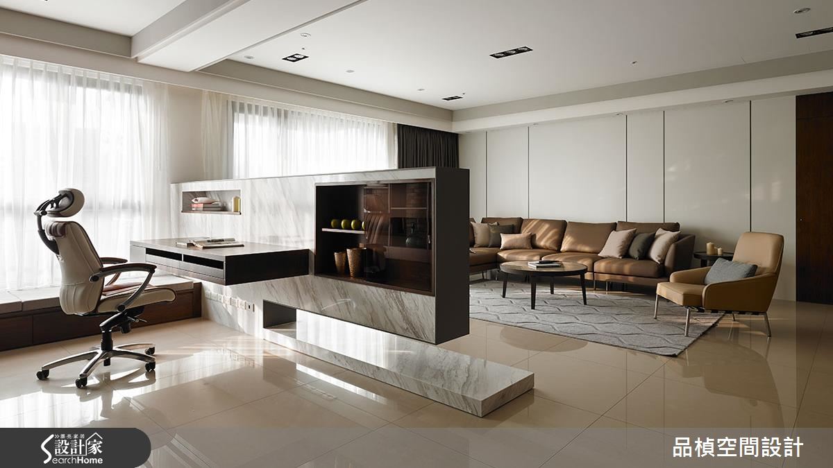 開放式的大空間採用淺灰及大量純白色系,讓居家明亮度大幅提升,並運用大理石、文化石等材質創造豐富層次感,溫潤的木質則在簡潔俐落的線條中,挹注溫煦暖度,電視牆以半身高的矮牆劃分客廳與書房領域,並賦予雙面用途,同時可作為書房的展示收納使用,書桌檯面直接嵌在牆面,取代繁重的家具,讓整個空間更加輕盈靈巧,一旁則沿著窗邊規劃臥榻,不管是憑窗閱讀或是日常小憩都相當合適。廚房與餐廳使用長虹玻璃區隔,透明的線段將日光垂直梳理,巧妙地延續呼應餐桌旁的端景視覺。主臥室內包含一個寬敞的更衣室,以玻璃拉門區隔獨立隱私性,並在兩個空間之間加設透光玻璃,為更衣間帶來充足的自然光度。