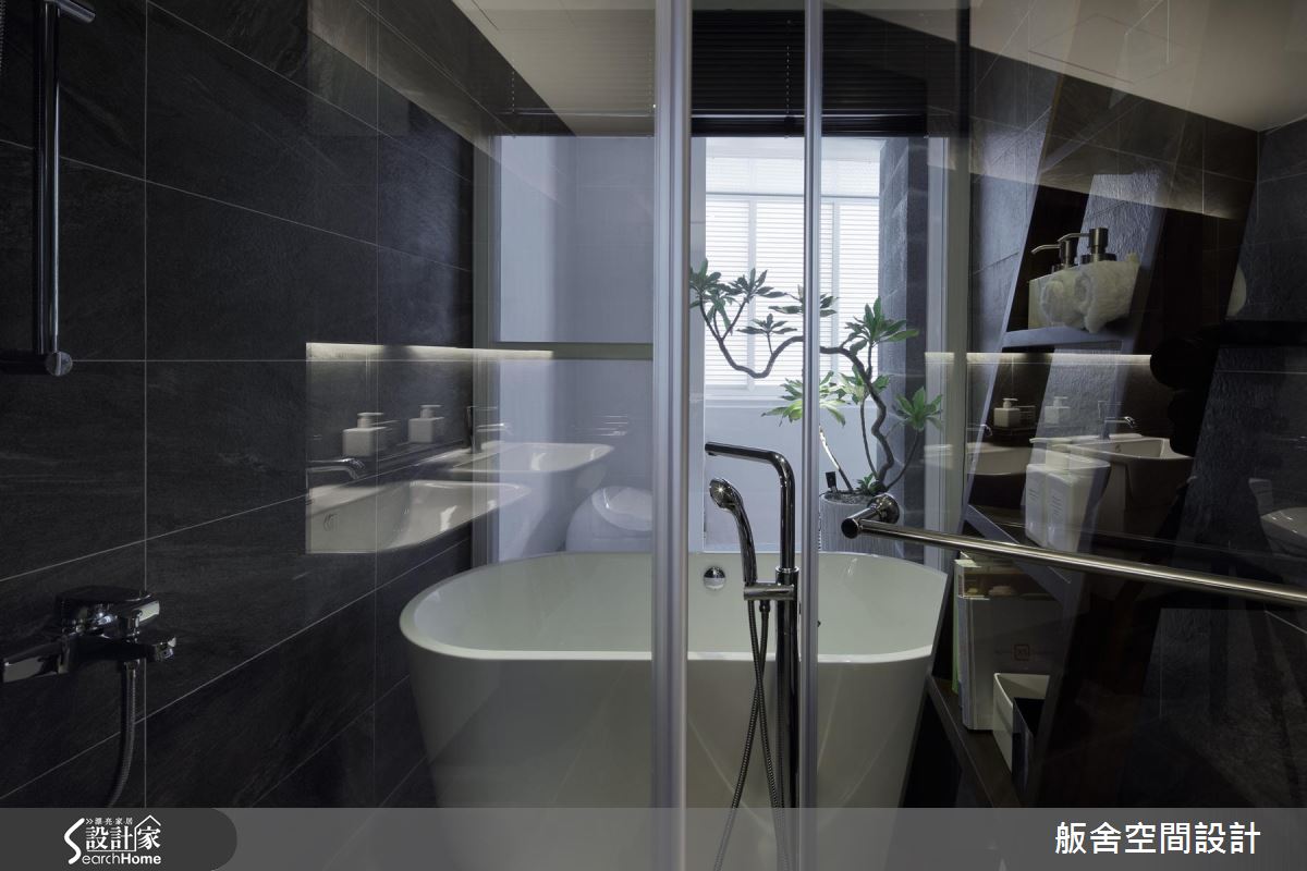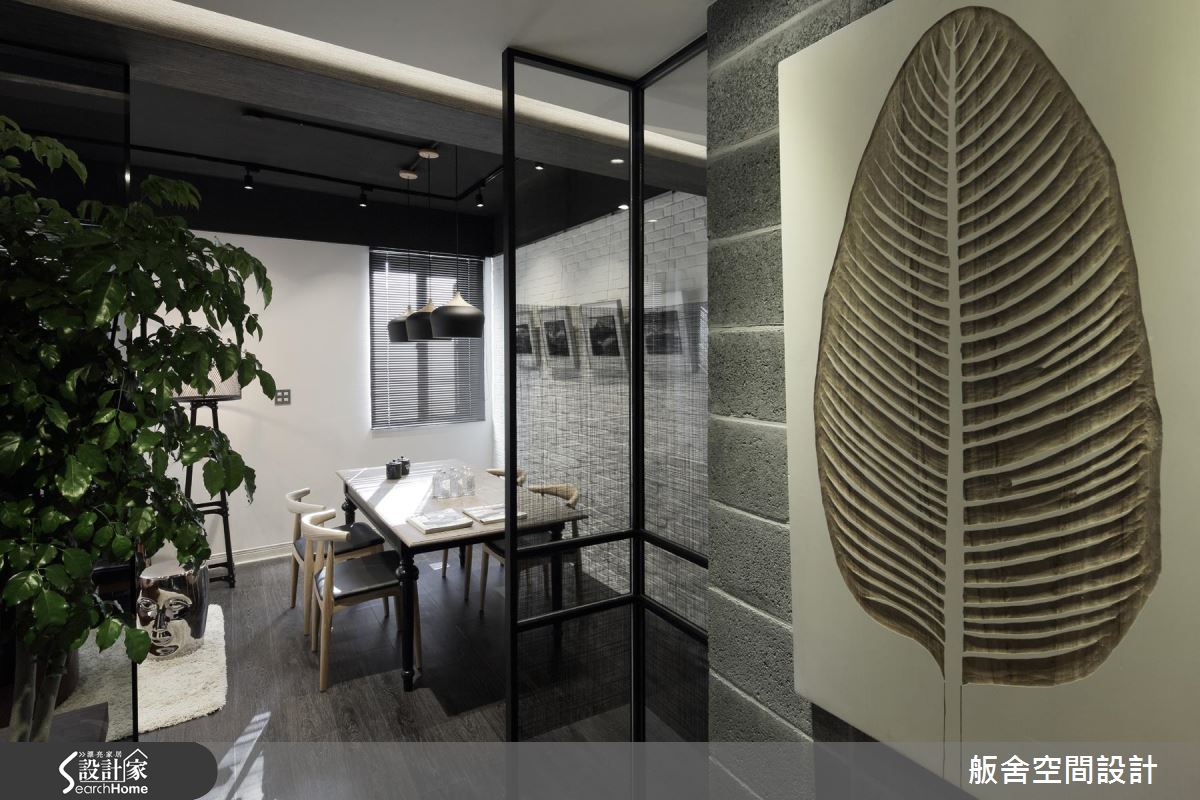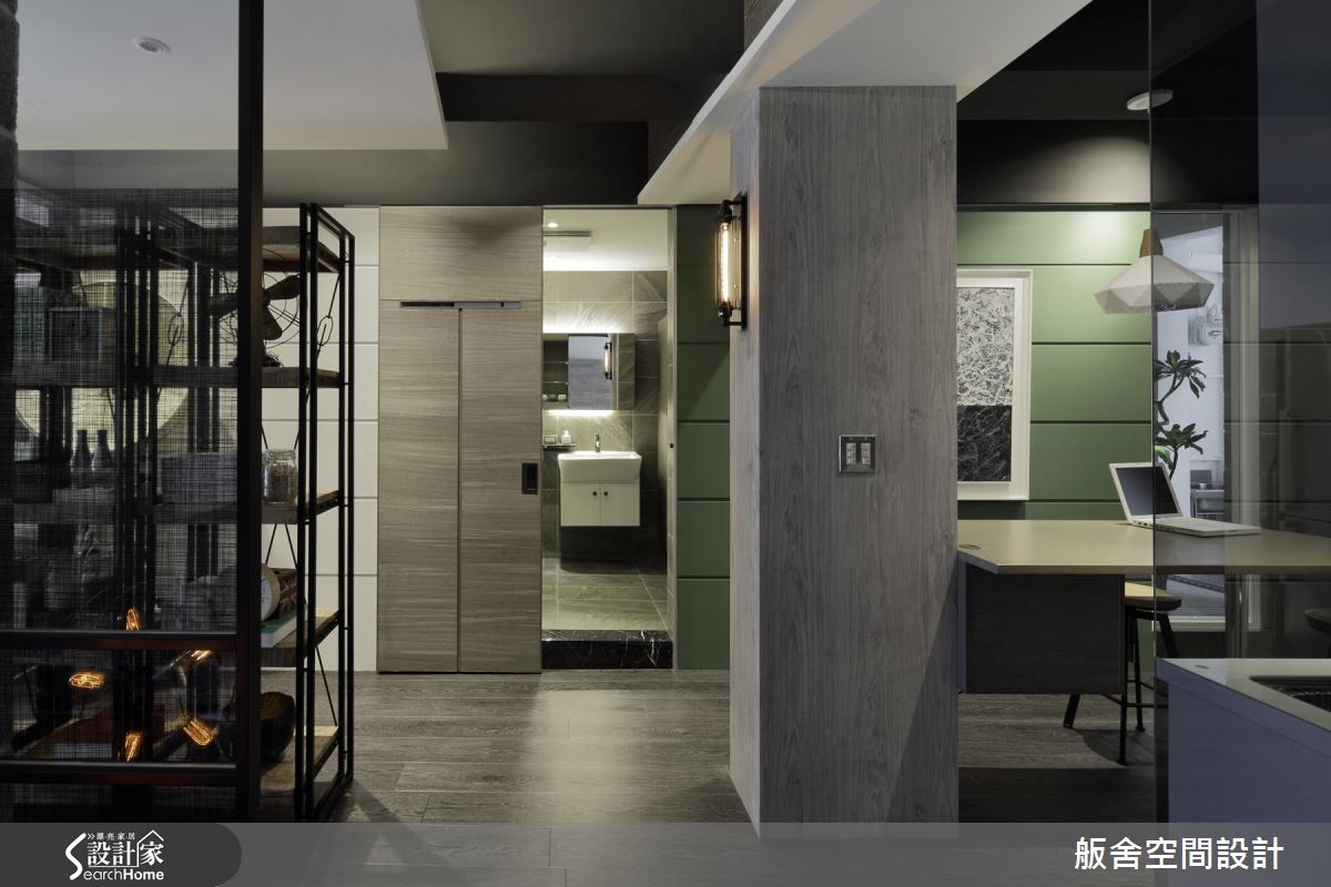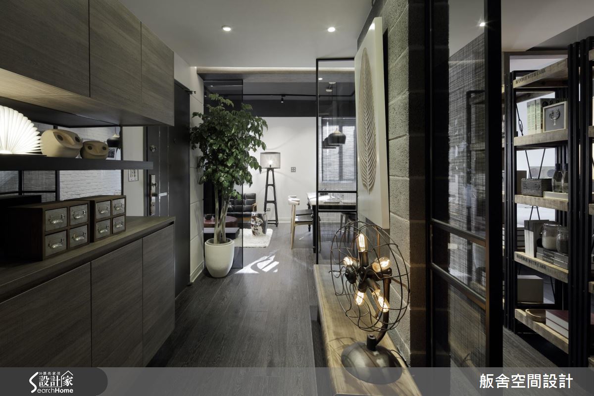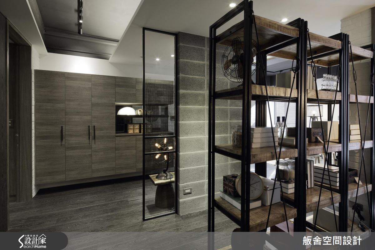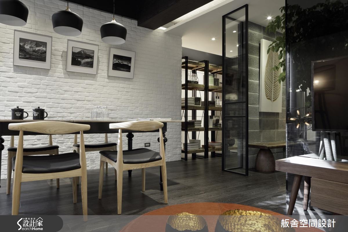 整體空間為長形格局,以工業風引領室內的視覺美感與設計細節,將磚、文化石、木紋PVC地板與空心磚等材料混搭,自然光隨鋁百葉的縫隙引入室內,照亮空間裡的風格布局;客廳旁靜置一張大型書桌,結合復古鄉村與工業風的樣式,交織出新穎的混搭美感,而桌底設置事務機的模式,成為閱讀與工作的複合空間。窗框、樑柱替場域劃分界線,特別是讓立柱、牆面與櫃體形塑出廊道動線,搭佐深淺色系的對比安排,營造出空間層次感。