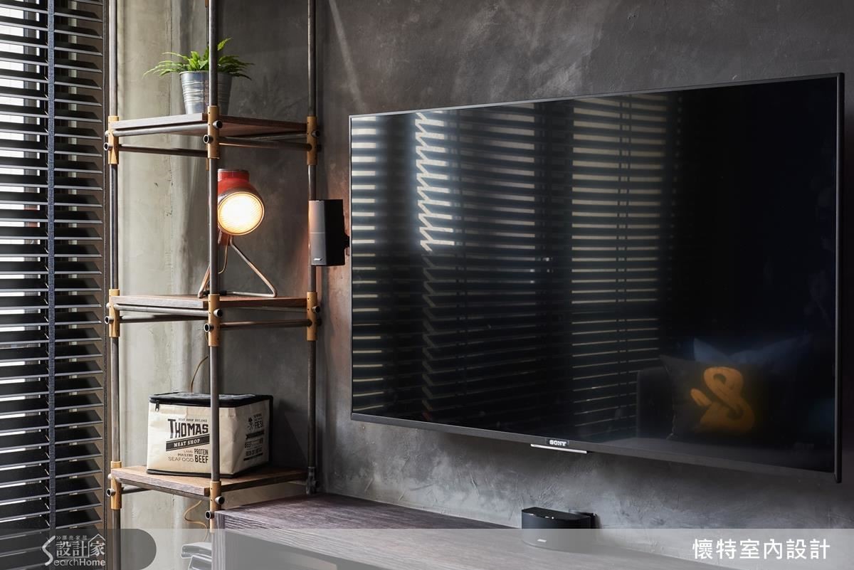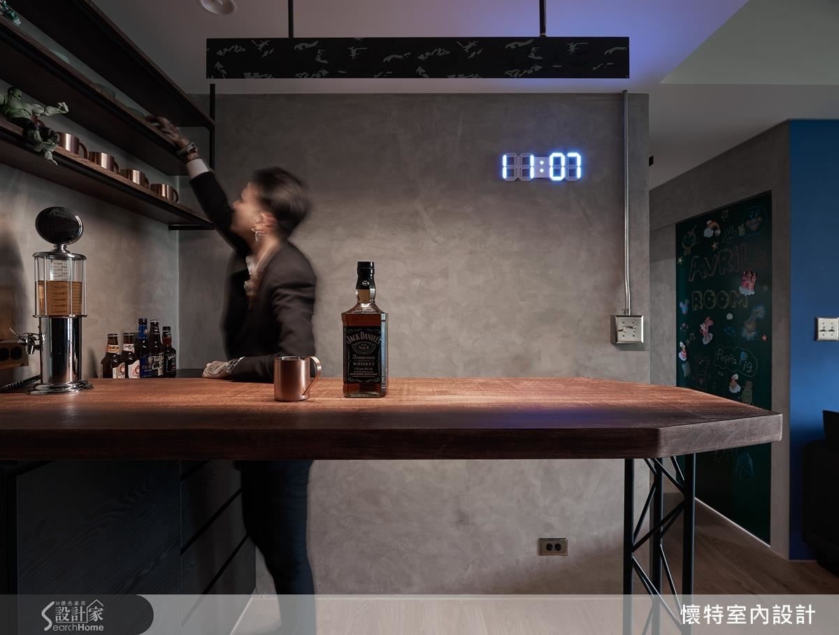 在收納空間規劃上,除了木皮仿舊處理、櫥櫃增設鐵網外,以鷹架結構為靈感設計的展示層架,讓人有耳目一新的感受。不僅圓形鐵管表面,以特殊浸染轉印手法上色,吧檯桌上的燈飾,也採相同手法穿上迷彩,充分展現男主人個性化的特色。