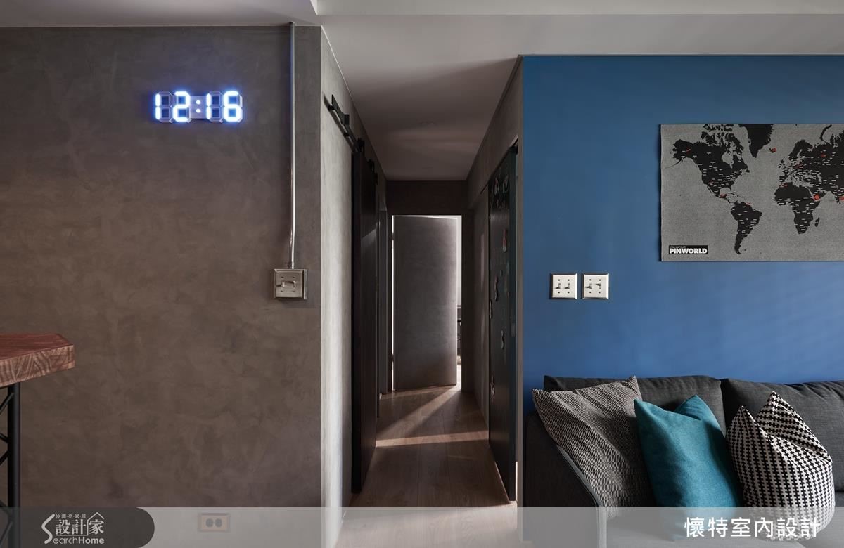 除了客廳帶有工業感的軌道燈照明外,獨創的車頭燈角落照明,以及主臥房的床頭燈,創造出截然不同的情境式氛圍,不僅滿足各種不同的使用需求,也讓空間更有設計感。