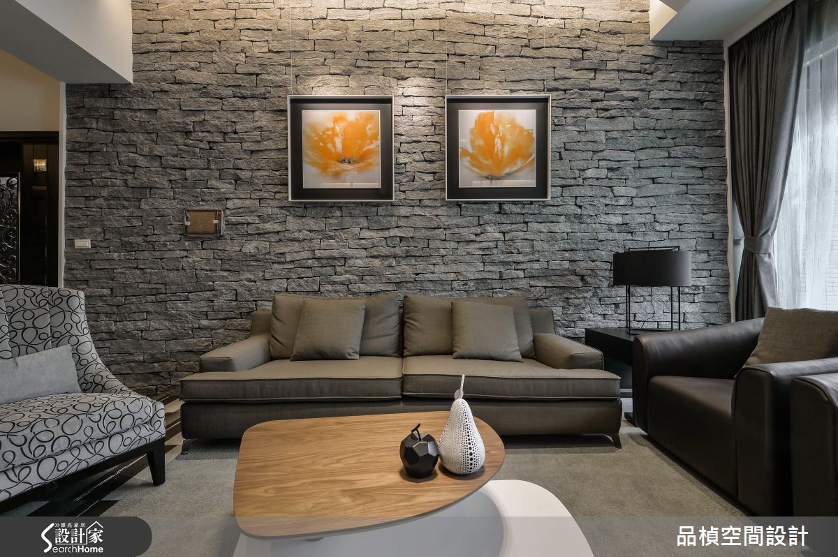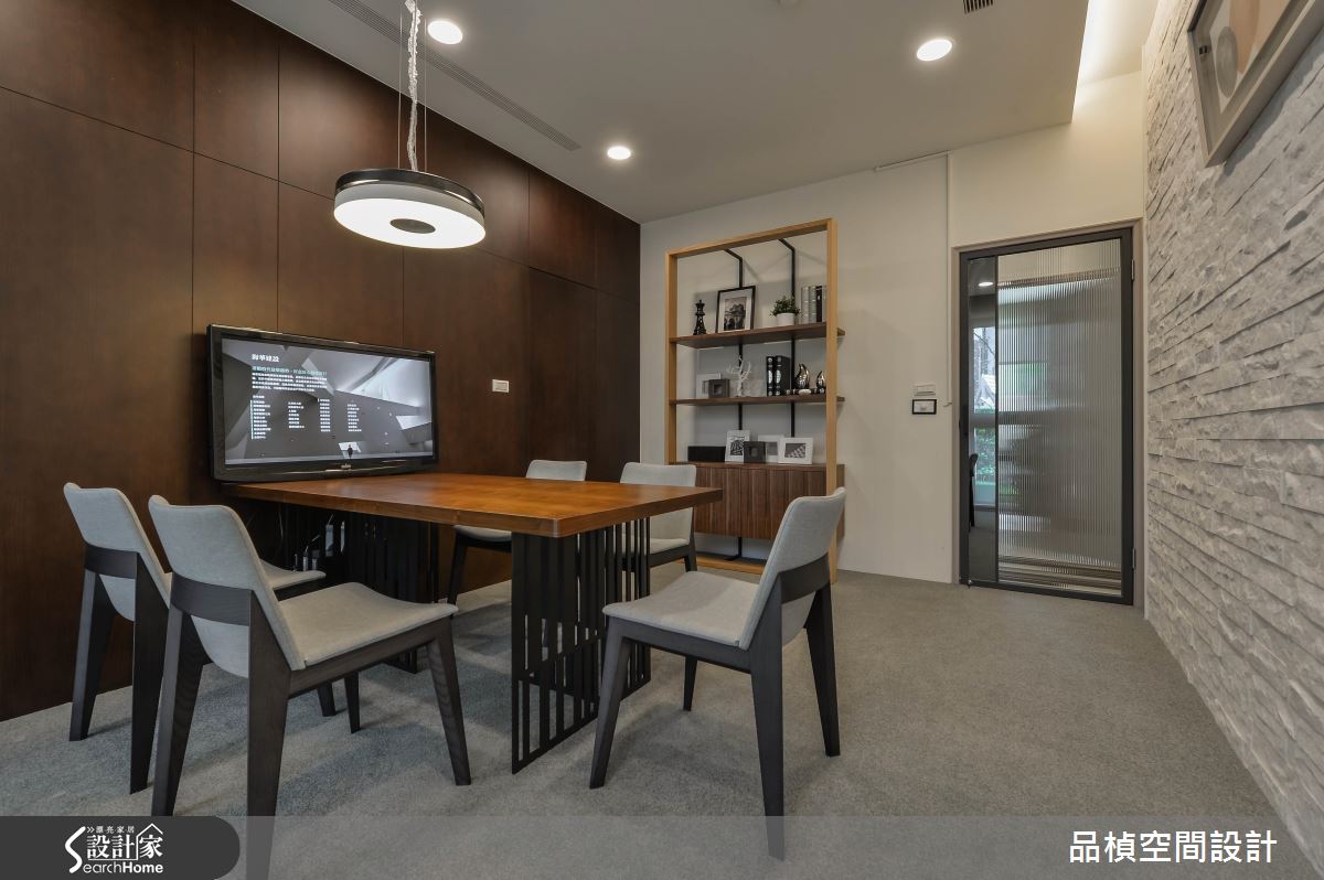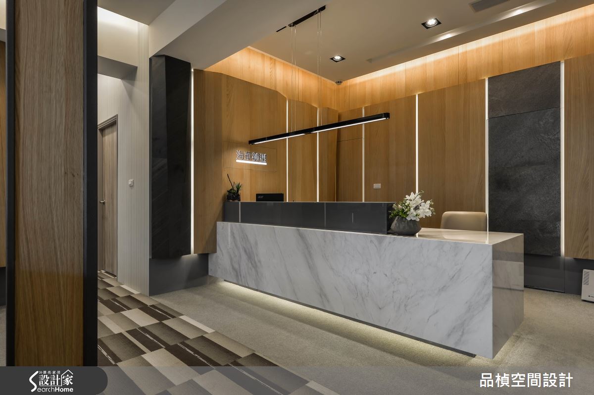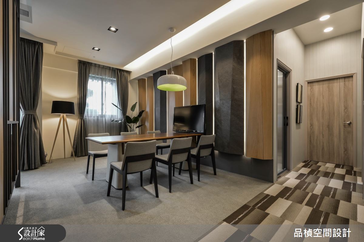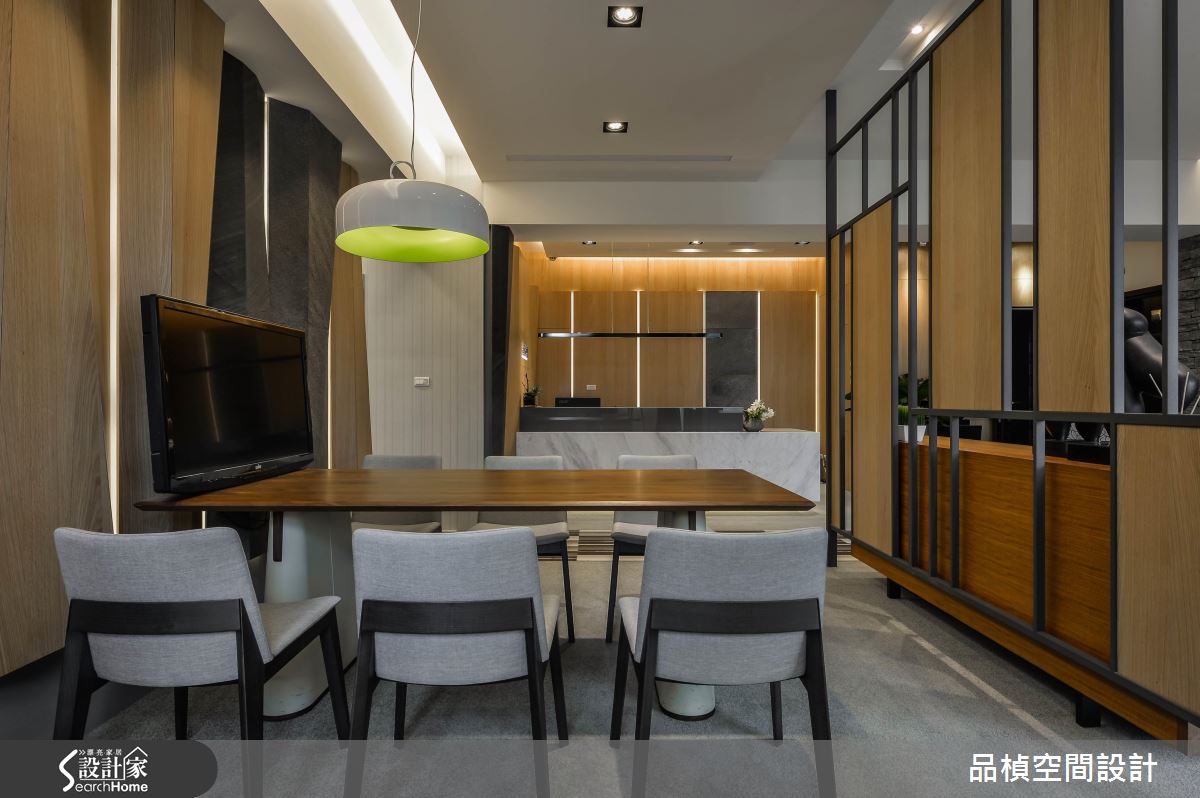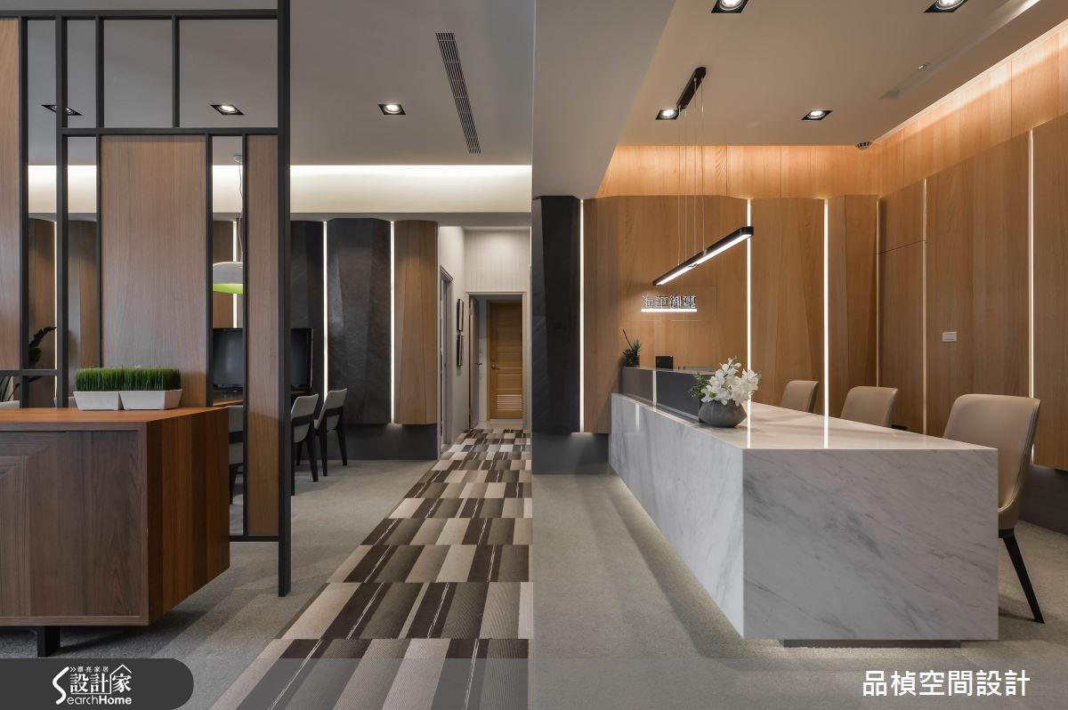 三色長形拼接的地坪從玄關處開始蔓延,延伸至盡頭的客用浴室,拉出一條風格廊道,界定出場域機能又串連起各個空間。鐵件與木作搭接起一面鏤空屏風,區隔出接待區與洽談區,屏隔前方擺設木作矮櫃與雕塑逸品,型塑一面藝術端景,與接待區裡原始自然的石材、藝術創作與弧形交織的沙發椅身相互融合,創造人文風景;銷控吧檯區到洽談區的壁面以木皮與石材裝飾,冷暖相間的質材變化調和出層次感的室內情境。