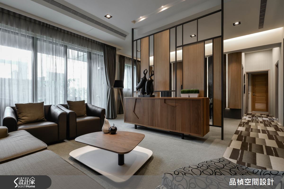 鐵件與木皮相融的屏風設計,以虛實相間的造型呈現,具穿透性的鏤空設計,讓有形化於無形,自然銜接起不同的領域機能。