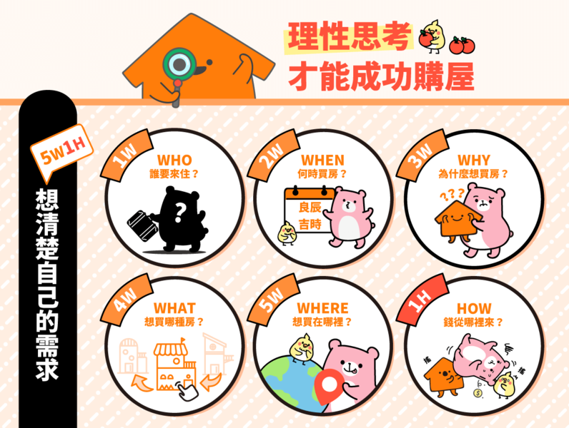 買房子是人生大事,對辛苦攢錢的上班族來說,動輒上百上千萬的房子,需要錙銖必較的仔細挑選。從盤點家庭收入開始到實際走訪看屋皆需理性思考,並做好與近二十年房貸奮戰的心理建設。「我家要能看到山景、旁邊有公園綠地、客廳要用水晶吊燈、臥房窗前要有法式咖啡桌……」美好的裝潢藍圖令人神往,可以增加你的購屋動力,但也可能混淆你看屋的判斷力,在揮別無殼蝸牛的行列前,先放下漂亮的居家設計雜誌,你需要用審慎的心態來思考購屋這件事。把握 5W1H的原則,想清楚再行動!