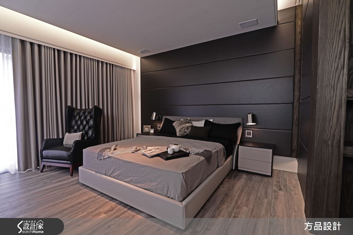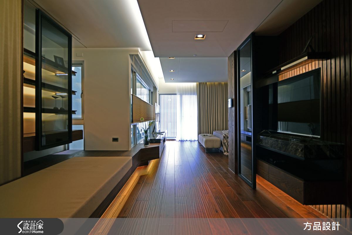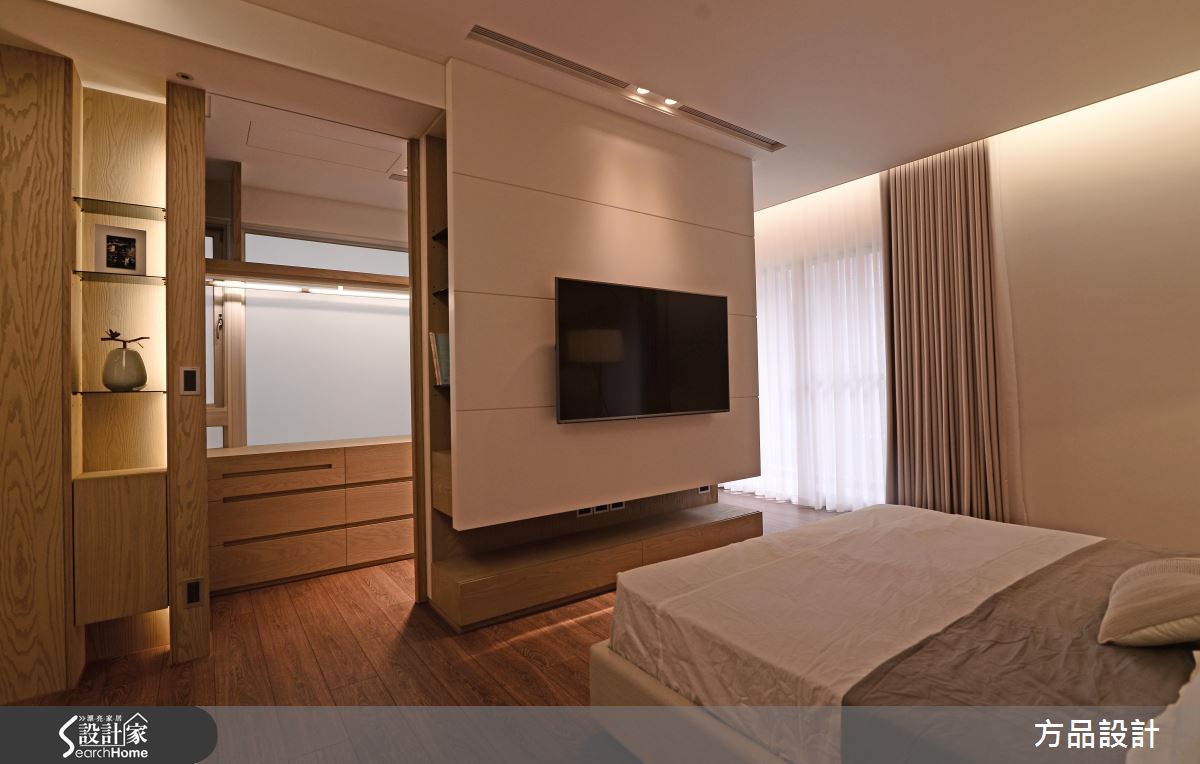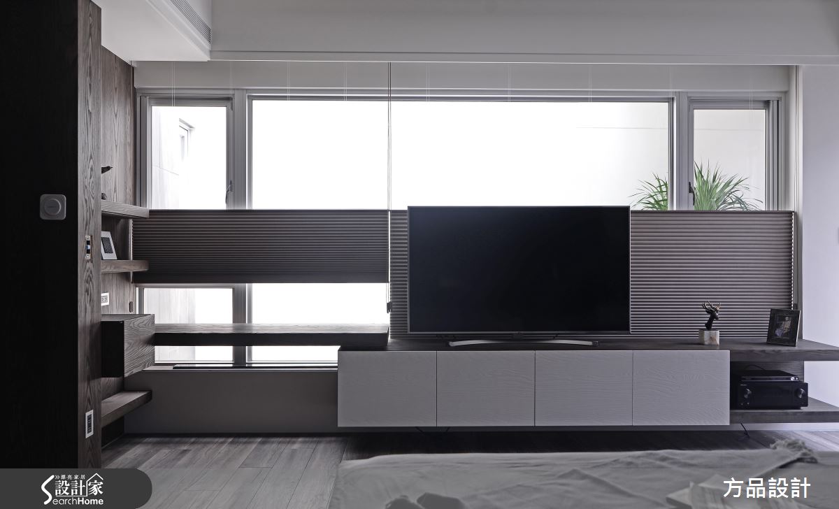 主臥室的電視牆倚靠窗台,大量的自然光引入室內,同時藉由天花板高低層次的堆疊,讓室內照明展現柔和光暈。