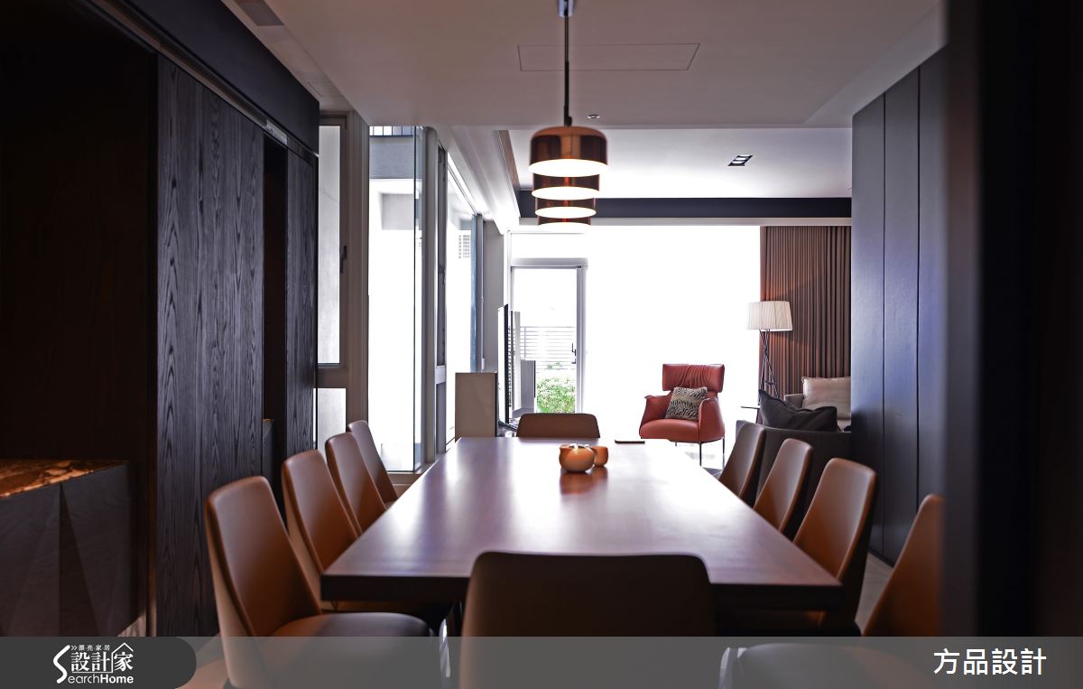 整體空間為長形屋,將客、餐廳與廚房橫向併置,簡約、俐落的材質描繪出客廳的非凡氣度,亮橘色系單椅與跳色抱枕從中脫穎而出,擦亮視覺風采;電視後方捨棄印象中實體牆,玻璃質材的隔間造型,將充沛的自然光不斷導引入室,創造出潔淨明亮的日光宅。大量木紋肌理成為餐廳空間的設計基底,隨著壁面端景牆的燈源調和,展現柔和溫馨的用餐氛圍,金屬光感的燈飾則提升視覺亮度,挹注些許時尚感;廚房以現代感的白色廚具擺設,隨著大面窗景的安排下,營造出乾淨、簡約的烹飪空間。