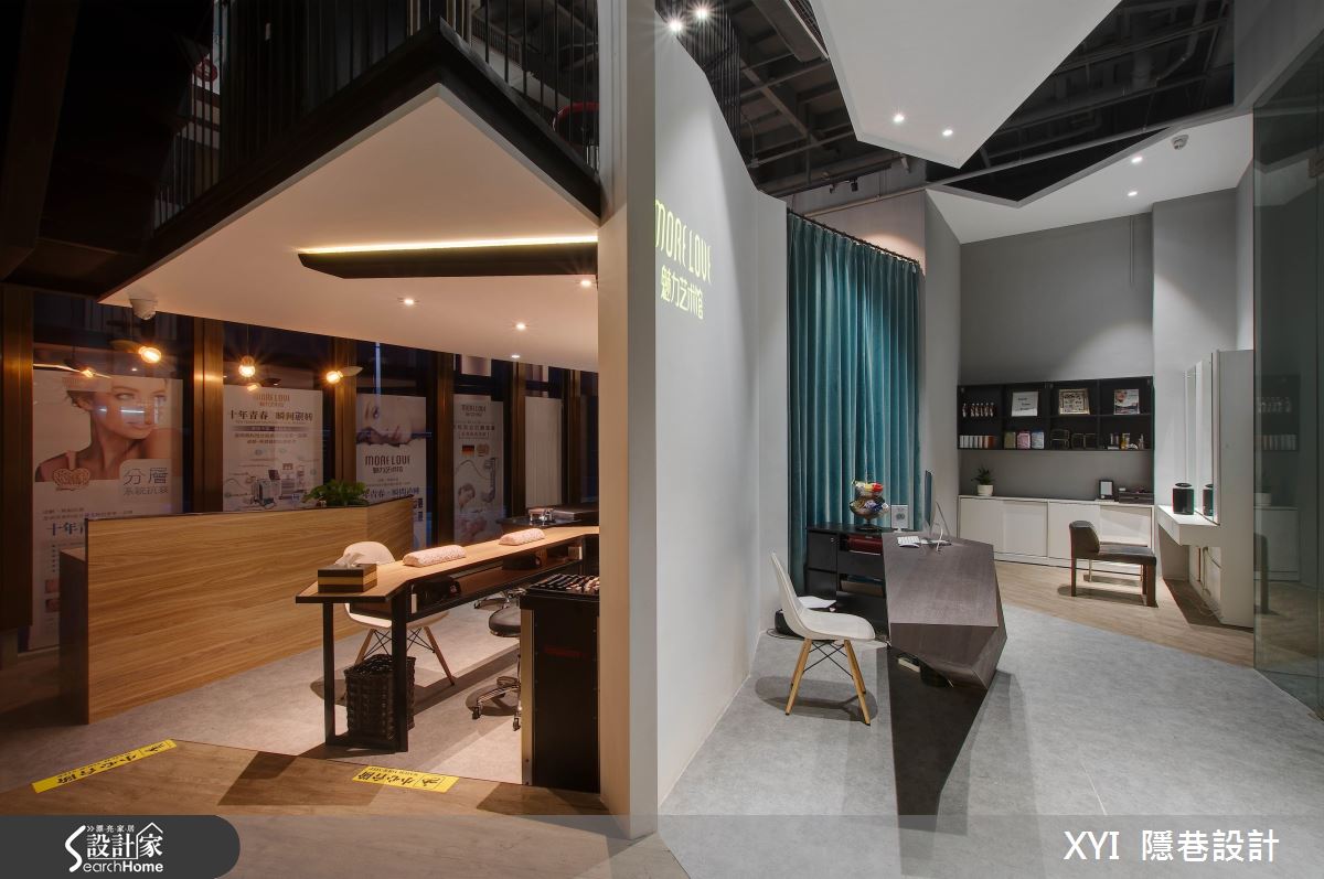 入門的幾何造型櫃台為賓客帶來充滿前衛氛圍的第一印象,與天花造型降版相互呼應,為明管帶出剛毅性格的層次。櫃台牆身後方即是小型的美甲美容空間,以溫潤的木皮搭配鏤空鐵件層架,打造俐落卻不失溫馨的放鬆空間。走上富有豐富收納機能的木皮樓梯,利用細密的黑色線條為賓客創造開放的行進動線。通往每一樓層的樓梯間以皆以黑色線條作為串連,巧妙利用磨砂玻璃作為隔間,維持透光度卻不減隱私。
