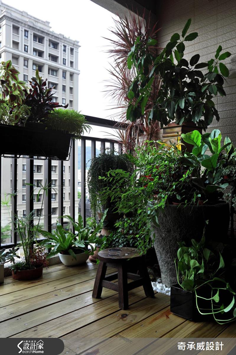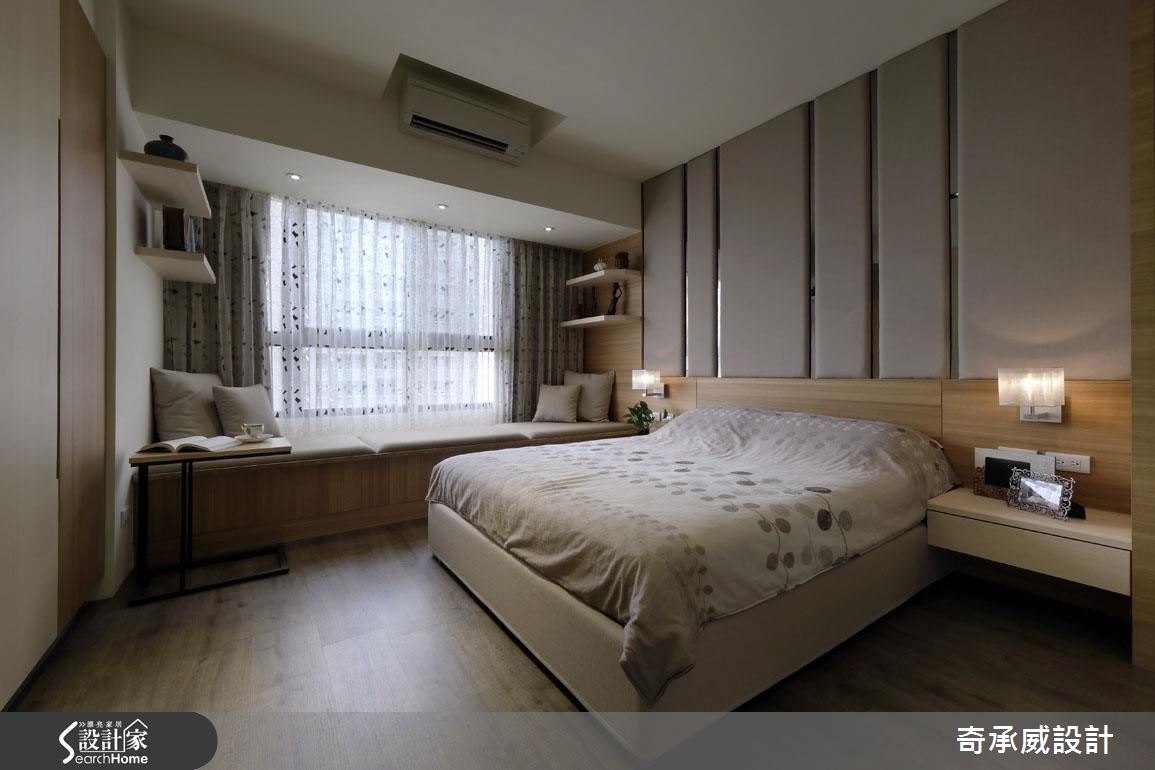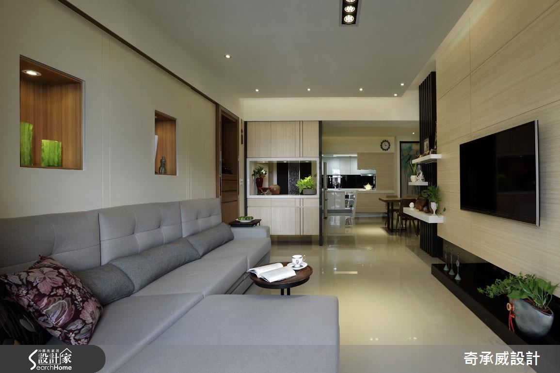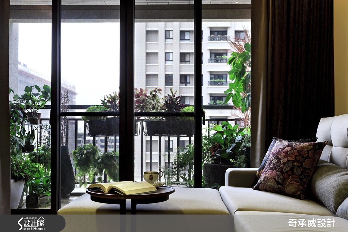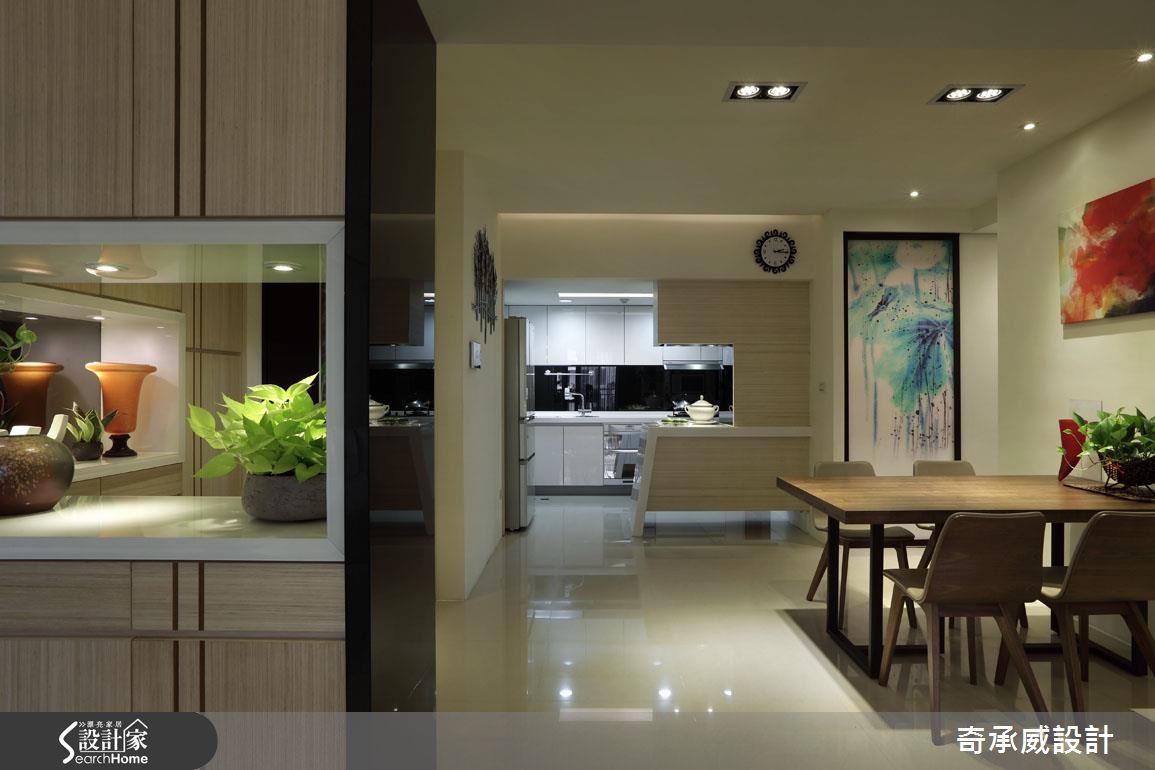 玄關處,配置量體形成緩衝,並結合鞋櫃及展示機能,在界定範圍之餘,也營造若隱若現的穿透感,延伸入廳區,則讓場域適度留白,透過落地窗導入戶外綠意,創造延伸的居家視野,並與室內植栽相映成趣,展現清幽寫意之美,沙發牆更突破實牆的呆板表情,嵌入兩道展示格櫃陳列藝品,充分顯現居者的藝術格調;餐廳、廚房之間同樣承襲了穿透手法,塑造靈活有彈性的使用情境,且在牆面掛上一幅鮮明畫作聚焦,瞬間提升用餐氛圍的暖度;寢臥鋪設了大面積的溫潤木地板,加入暖色調作為基底,在床頭融入質感繃布、以鏡面穿插勾邊,休閒且不乏優雅質韻,一旁的臥榻座席,則成為臥房內最閒適的放鬆角落!