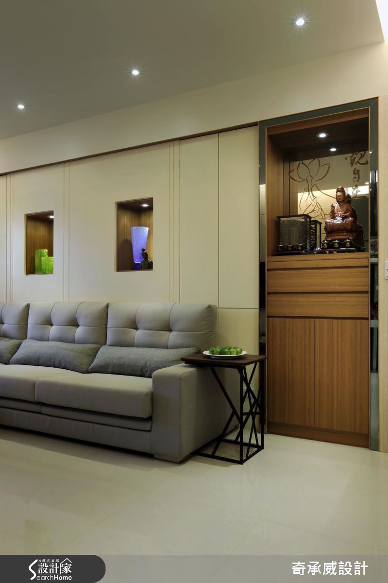客廳沙發牆旁,設計師訂製了獨一無二的櫃體,使神龕安穩置放在此,完美呼應整體風格、絲毫不顯突兀!