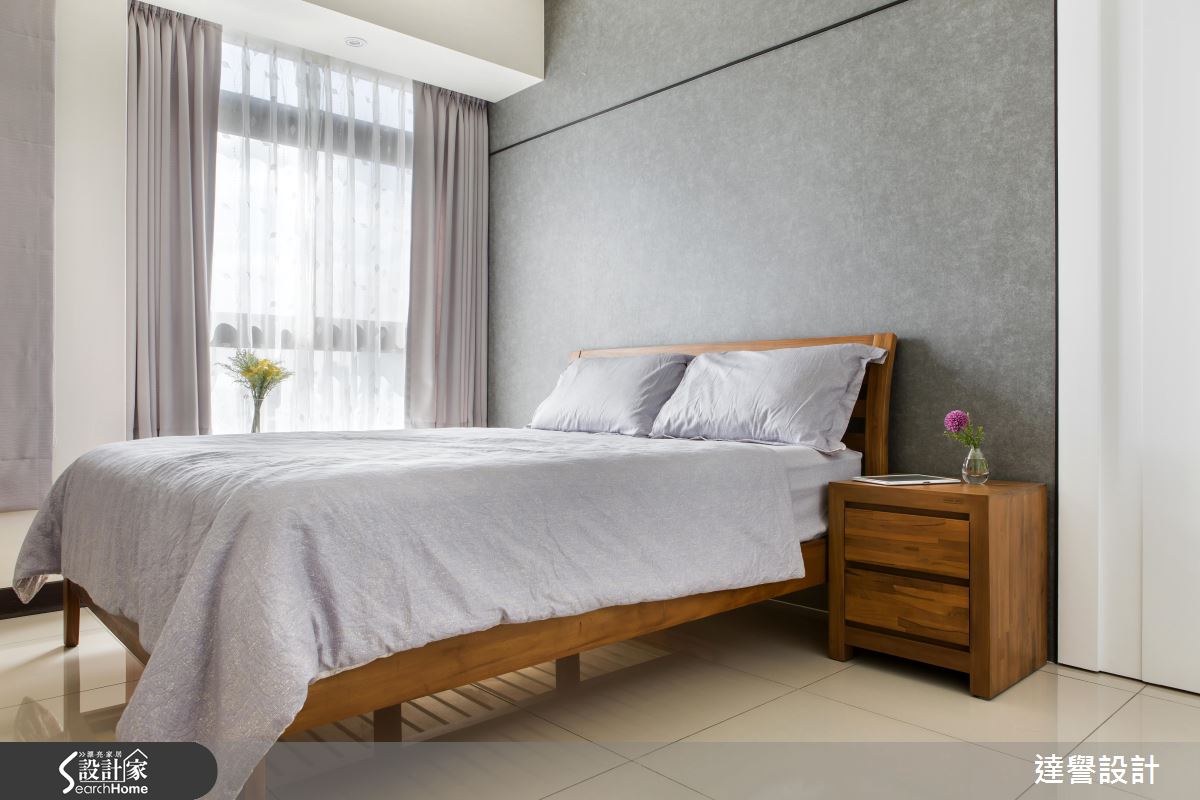帶著清水模質感的電視牆,替空間營造出靜謐、自然的氛圍,在橫向的條紋鋪陳下,醞釀富有變化的視覺美感,更拉大空間尺度。