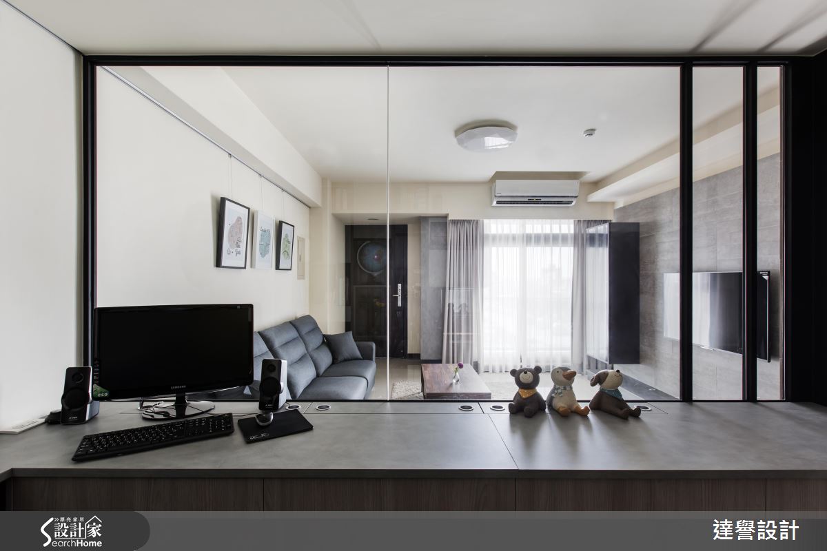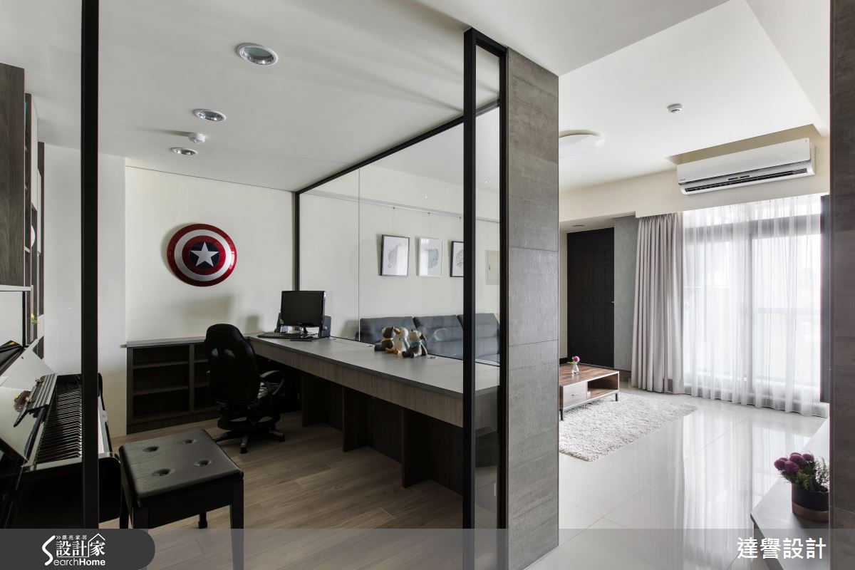 空間裡利用降低彩度的做法,讓開門進入室內的家人卸下一天煩塵,療癒身心靈;玻璃隔間的方式界定出客、餐廳與書房,清透質感讓領域間形塑流動氛圍,同時又讓各個領域相融,串連美感與機能。鐵件與玻璃創造整面落地櫥窗,區隔出讓男主人心怡的書房,輕盈、透視的隔間技法,讓視覺得以無限延伸,領域之間則產生互動與對話,增進家人彼此情誼。