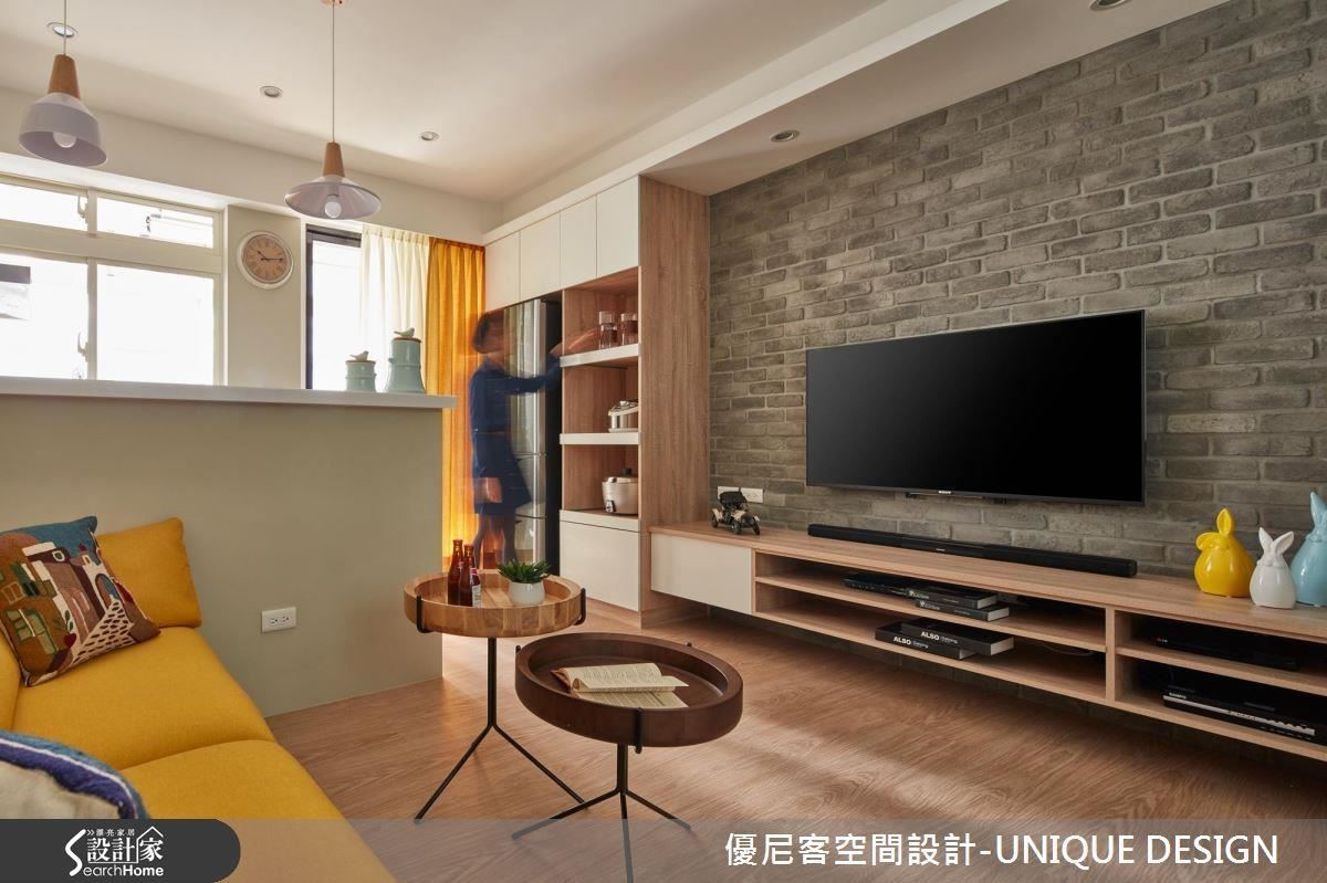 在 20 坪的整體空間裡,規劃出客廳、主臥及客臥領域,視覺用色上,除了天花板以白色粉飾,各個領域皆有主色作為設定,公領域裡則以一張亮黃的跳色沙發揭開玩色的風格美學,大膽的搭配靈感讓室內也營造出放大的感受;灰色中帶點綠色系的文化石紋理鋪陳電視主牆,與亮黃色沙發相互呼應,調和出自然的原始氣息。客廳與廚房相融一室,利用人造石檯面創造一座吧檯,圍塑出半開放式的餐廚領域,一次滿足烹調樂趣與小酌的午茶時光,而藉由大小不一的燈飾、茶几與風格物件的點綴,調和出人文雅致的愜意生活。