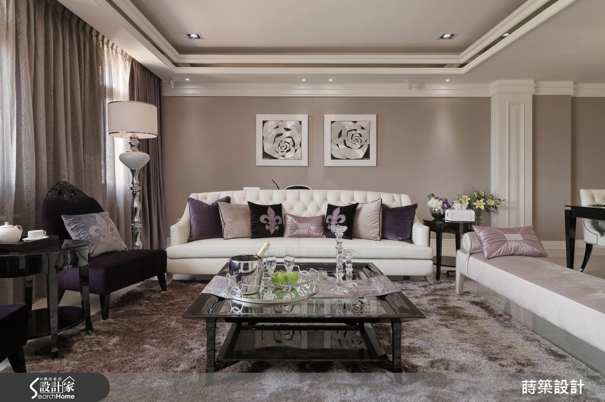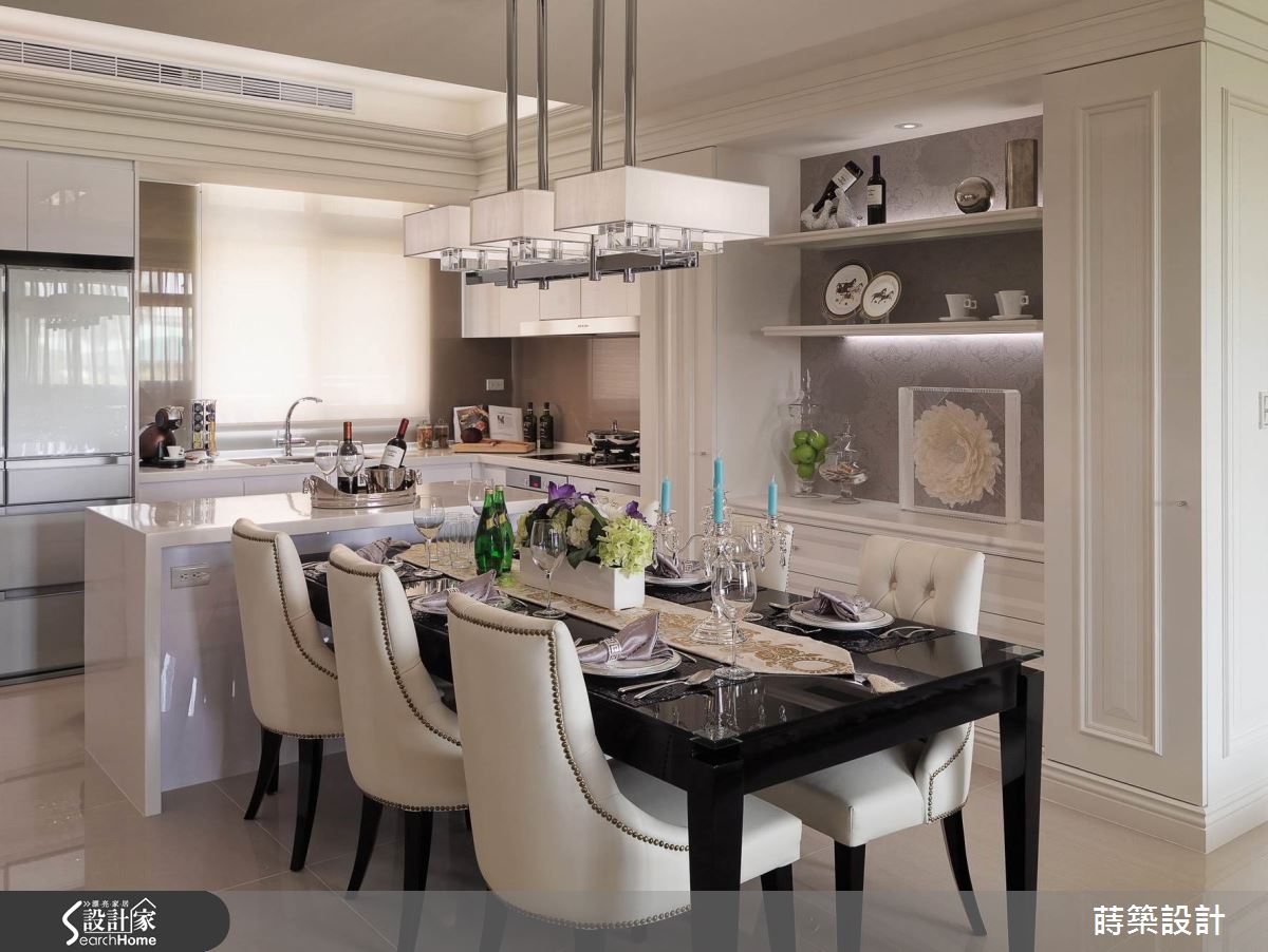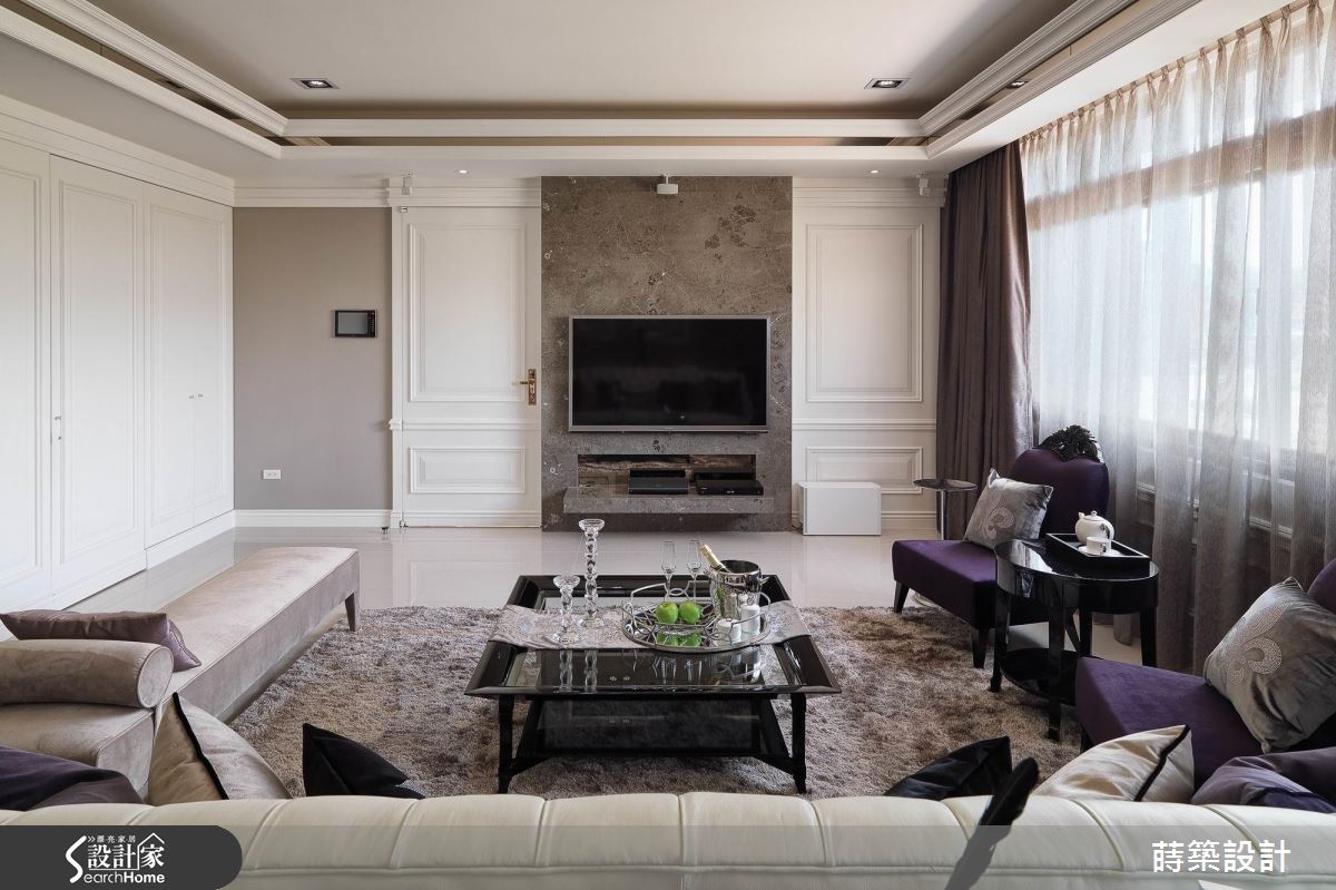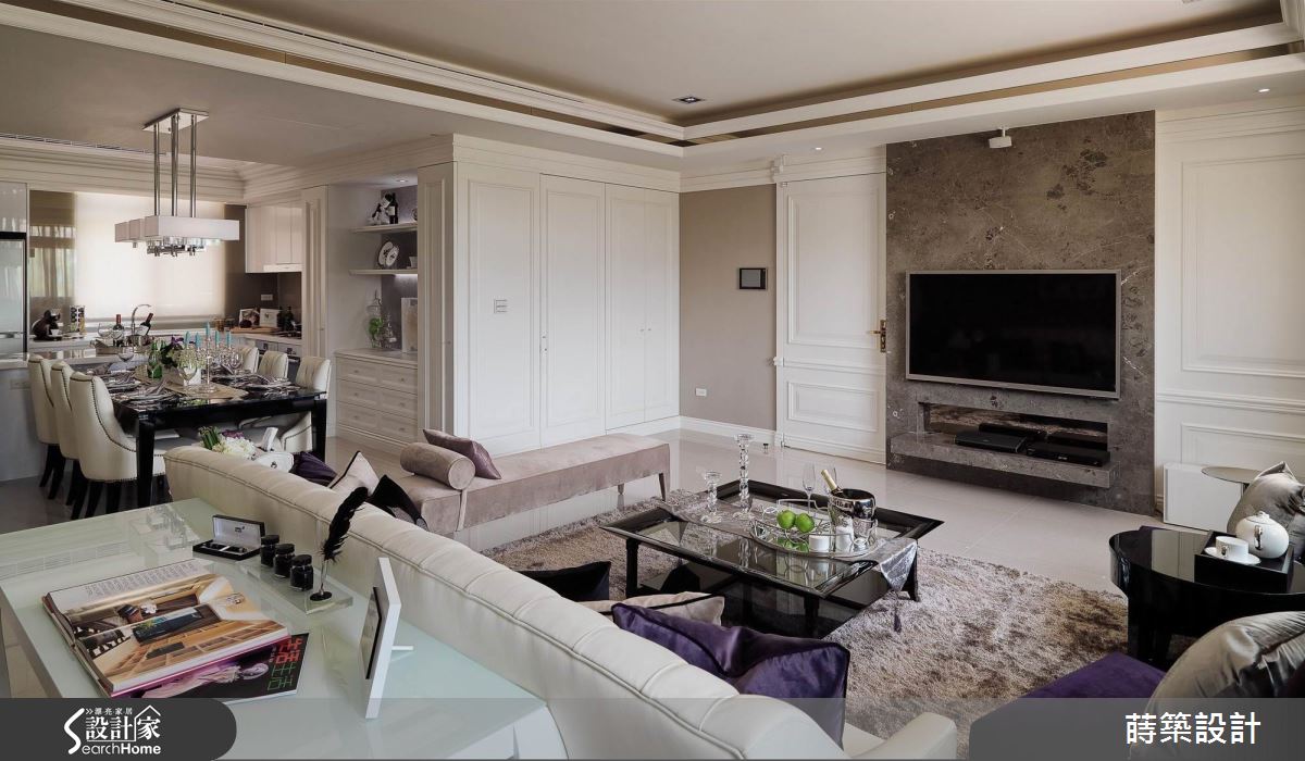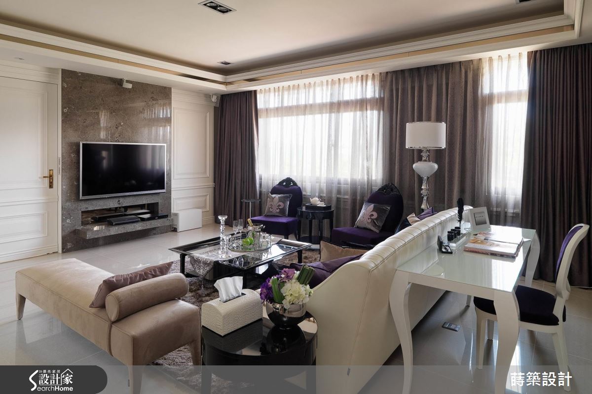 整體設計上,為了打破原格局受限玄關出入口位子,造成的狹長屋型,設計師在客廳電視牆的設計上,兩側增添對稱的線板設計,且將玄關入口納入其中,寬敞的視覺意象營造出器宇軒昂之感;而臨窗擺設的紫色單椅與抱枕,更傳遞一股浪漫動人的柔美情愫。客、餐廳相容一室,中島以人造石打造,與餐廳串連一體,簡約線條的燈飾妝點,加上後方展示櫃上陳列的藝術品,烘托精緻的時尚風情;而整體以對稱、和諧的美感鋪陳下,更巧妙將領域動線整併其中,像是與玄關垂直的收納櫃造型壁面裡,其實隱藏公共衛浴的入口,令人驚豔。