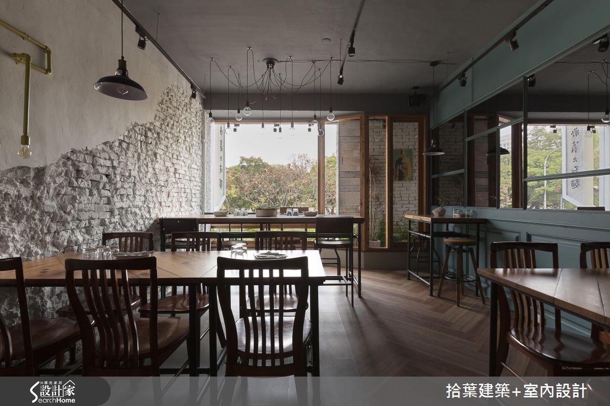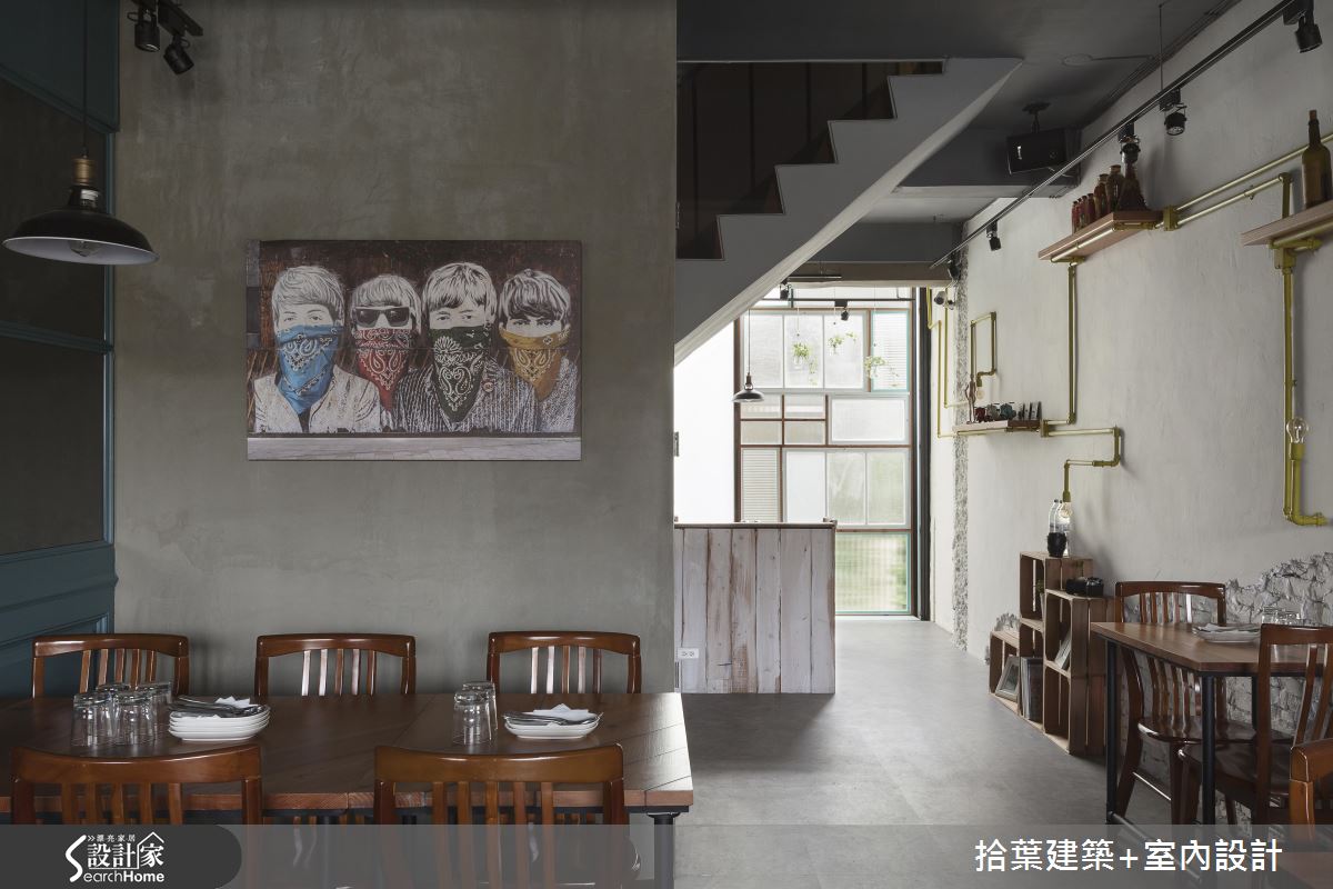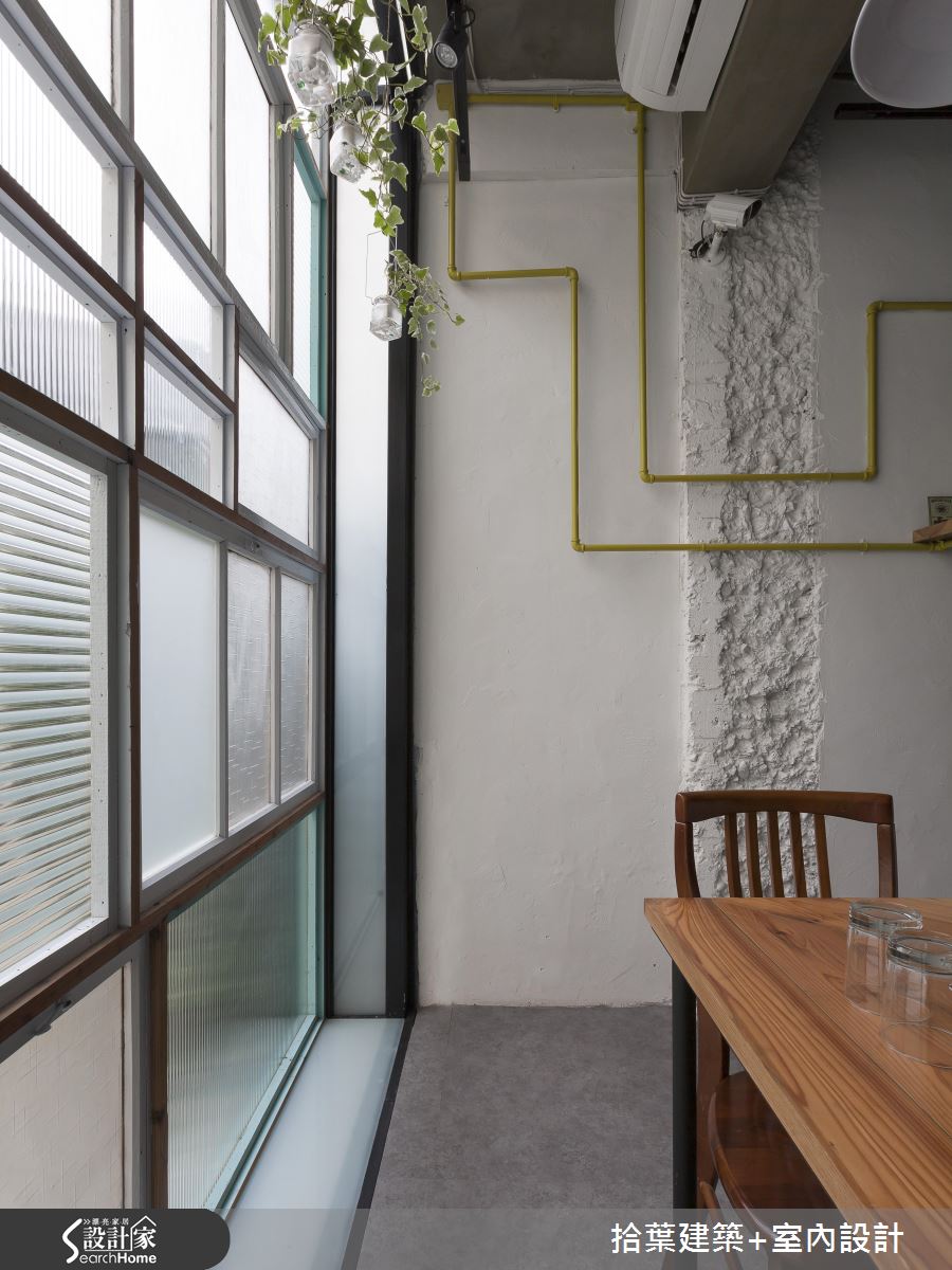 一樓主要為烹飪餐點的廚房,沿著壁面以木作搭接造型、鐵件復古燈飾,規劃出幾張雙人座位,沿著木製踏階的樓梯,前往二樓用餐空間。鐵件的軌道燈穿越天花板,上了芥末黃的水管則穿梭於整個壁面,成為室內的風格照明,水管造型甚至一路蔓延至窗邊,與天花板攀爬的枝葉交錯出自然情境,傳遞趣味盎然的活潑氣息;另一側的牆面則以藍色調線板搭配大面玻璃的手法,工業風的空間裡揉入些許古典氣息,明亮、反射的視覺特質替室內帶來放大之感;承襲原有窗框與殘木元素,不同特質玻璃拼貼出獨一無二的窗景,暖陽穿透介面在領域裡折射出多變風情,與空間裡的復古元素相互輝映,串連起美感與故事。