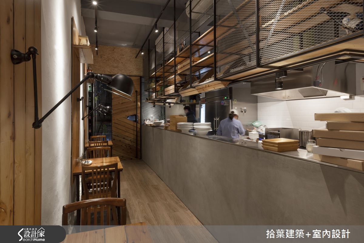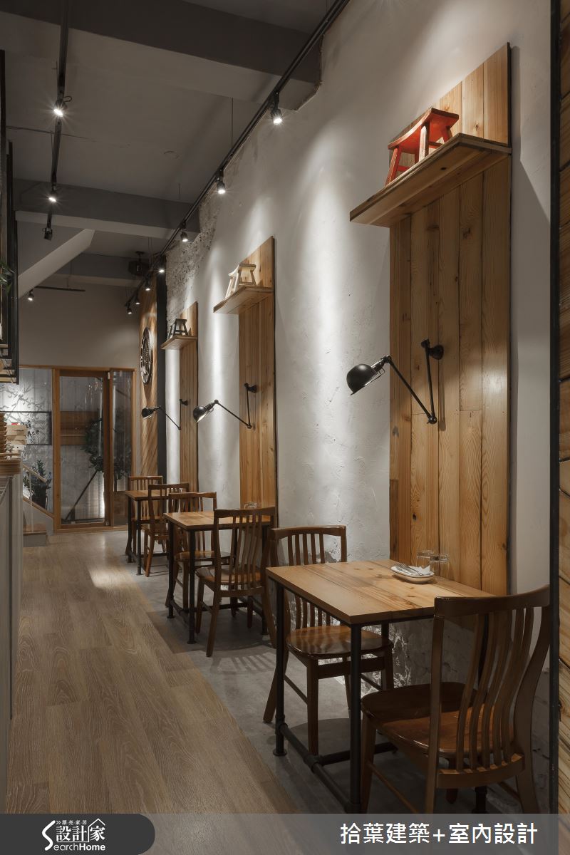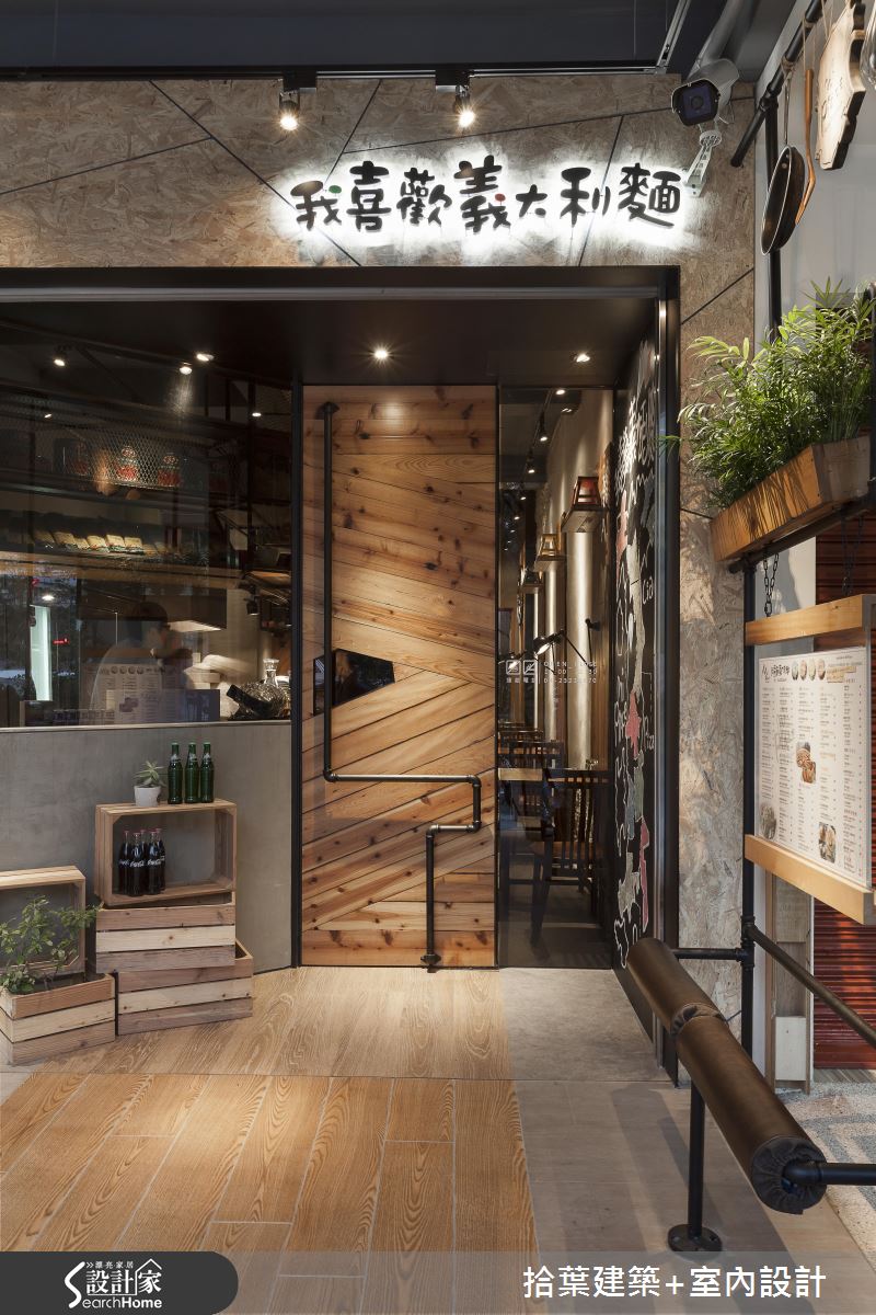 斜木片拼接一面頂天大門,扶著上下穿梭的水管把手、推開門扇進入餐廳,感受仿舊質材交織出義式餐廳的獨特風情,創新拼貼手法融入空間的情境,加上復古的物件安排,營造出恬靜且溫馨的工業風格。