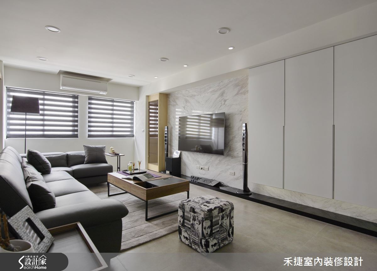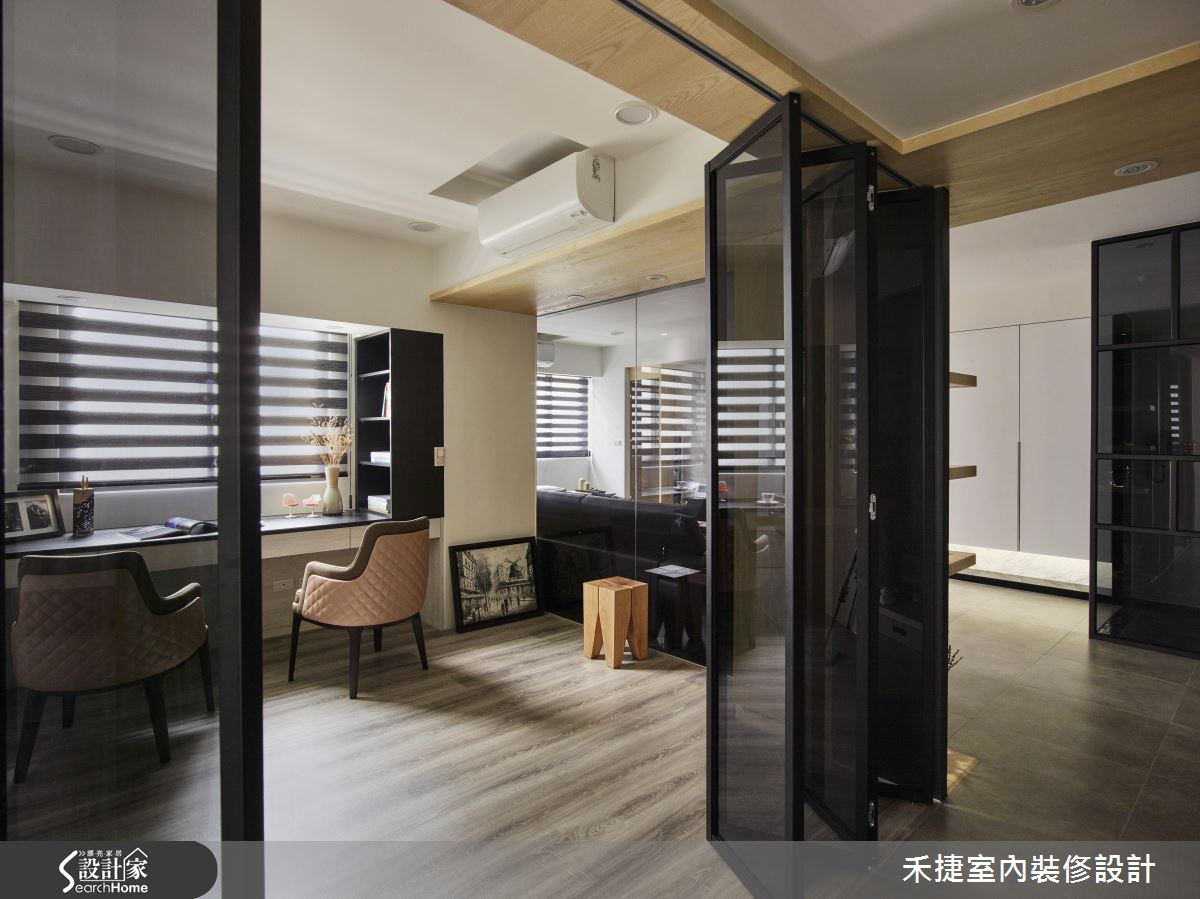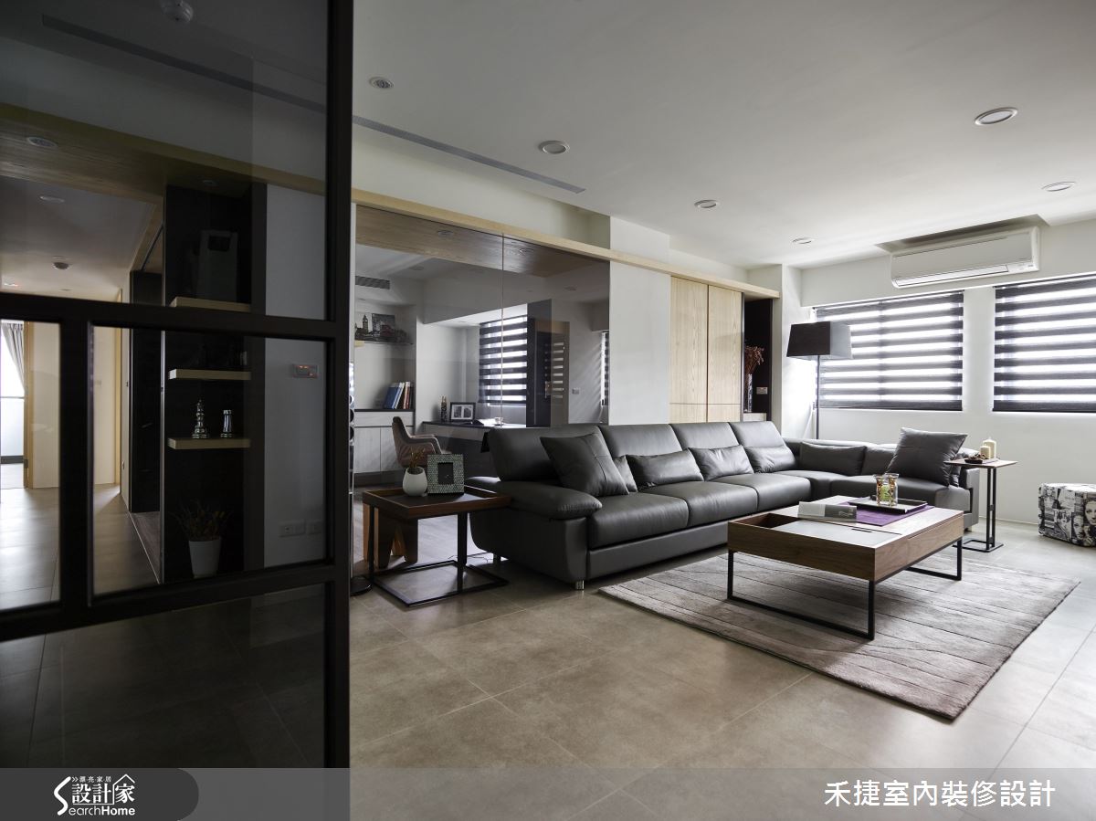 設計師加裝全熱交換機與隔音氣密窗,成功解決噪音與空氣問題;接著針對 2 米 7 的有限樓高,卻需要加裝吊隱式冷氣的需求,設計師將機身與管線安置於走廊與廚房等較少使用的區域,便不會造成其他空間的壓迫感。由於屋案本前身為辦公室,有著隔間與樑柱的問題,則採用木皮與黑玻,修飾橫亙的大樑與阻礙動線的柱體;更巧妙在沙發後方的樑柱交界的畸零空間設置櫃體,同時達成收納用度。重新規劃格局後,除了半開放書房之外,更為屋主夫妻規劃一個多功能和室,蘊藏客房、遊樂、休憩與收納等多元機能。