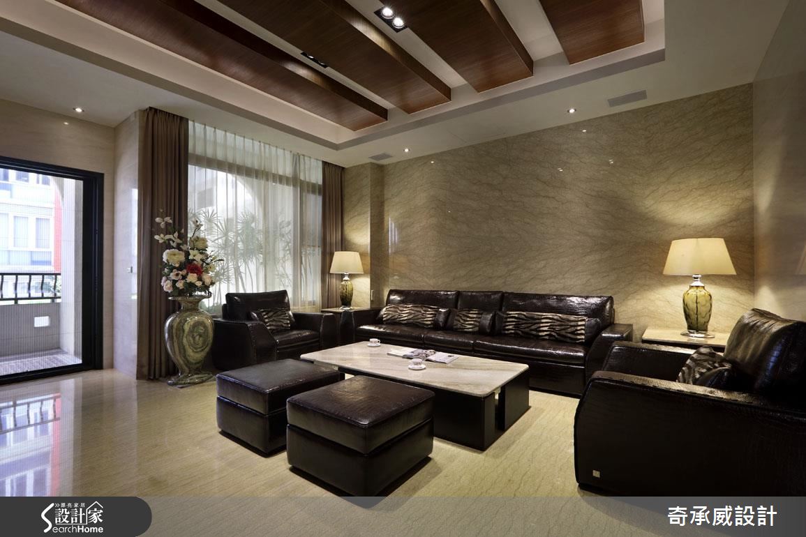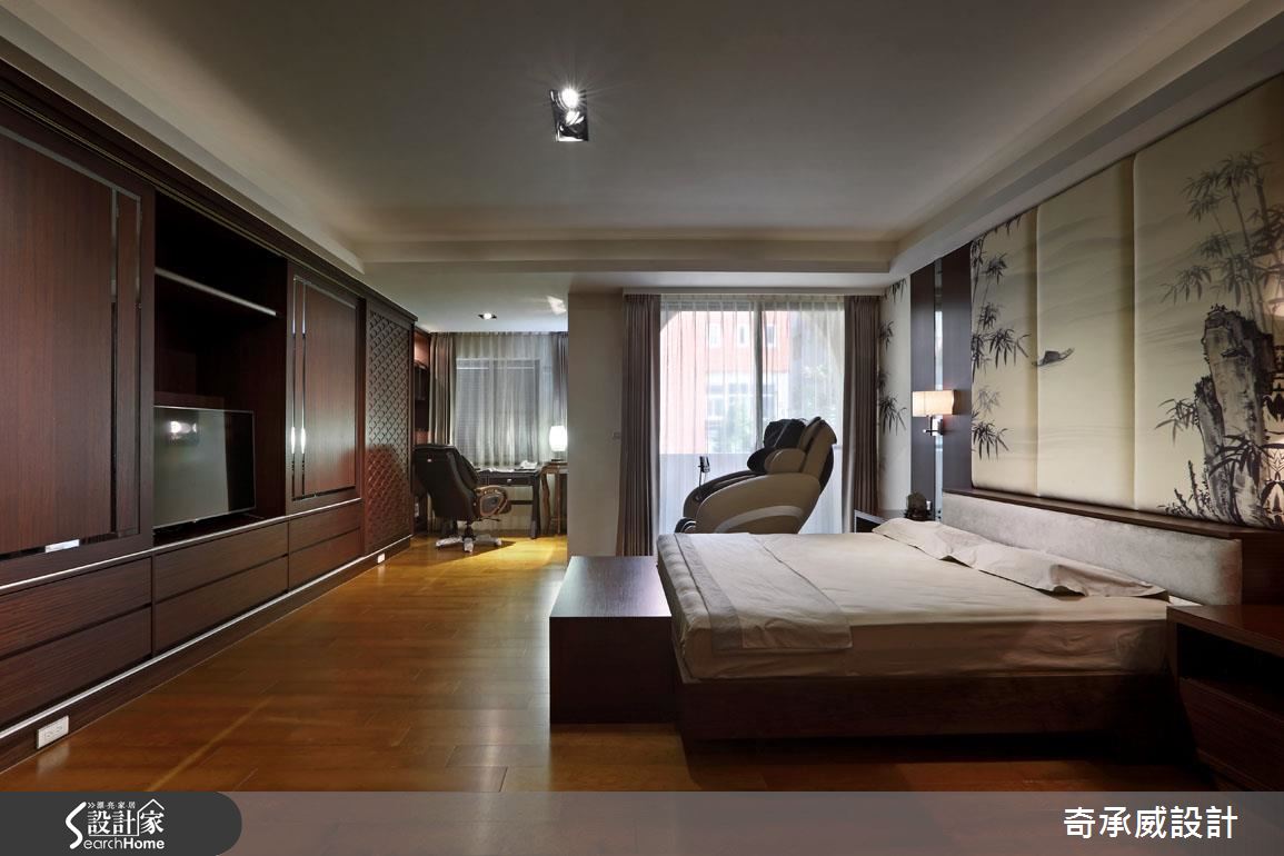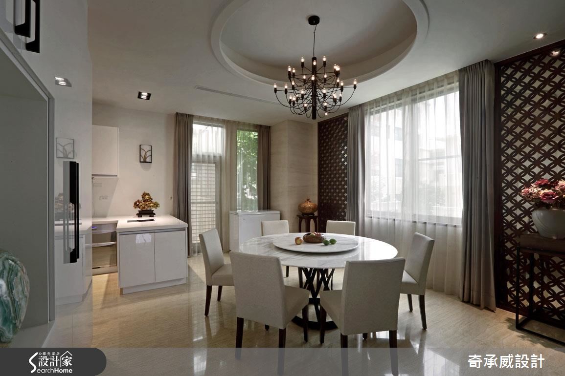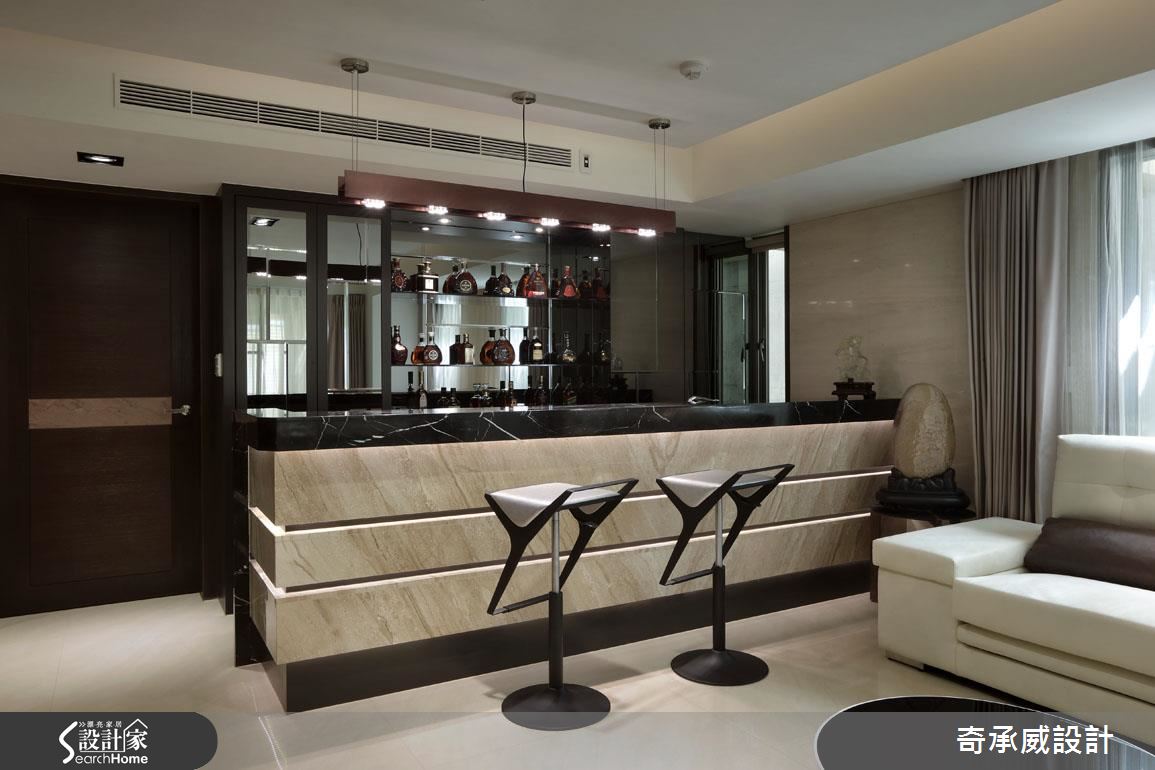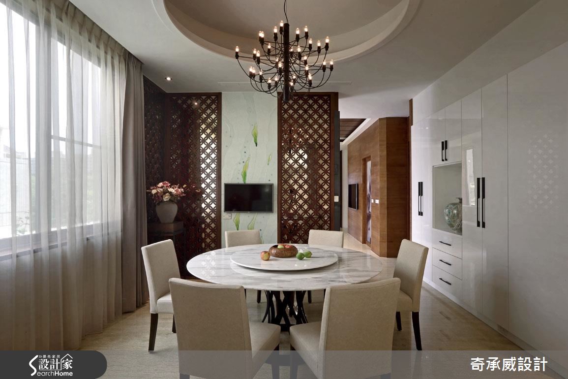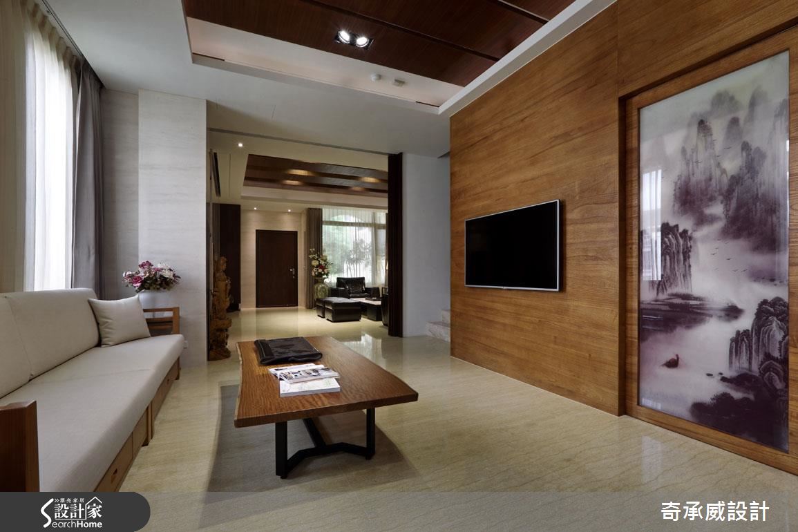 以東方風情作為空間創作的靈感,無論是潑墨畫意象、雕塑品或是彩繪琉璃的電視牆,替寬敞大器的空間賦予鮮明的生命力。一樓作為貴賓接待區,簡約的石材吧檯成為主要的核心領域,格柵電視牆的造型巧妙呼應整體風格;二樓為重要的客、餐廳,融合多種大地色系的石材鋪陳於地板、壁面,揮別冷冰冰的質材印象,反而營造出溫暖的質地,再搭配深色調的皮革沙發,增添一抹氣勢;往空間裡面走去,一片拉門界定出餐廚區,佈滿現代感的廚具裡,周圍利用屏風式的窗花造型點綴,電視牆面流露的藝術光彩,自然寫意與東方色彩織就生動的人文意象,祥和靜謐之中又添自然寫意氣息