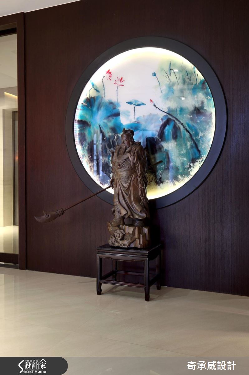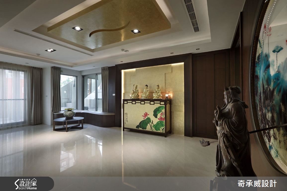 樓上特別打造一處佛堂空間,由金箔鋪陳天花板與神龕質感,帶來莊嚴氣度,還有一面荷花視覺的彩繪玻璃牆面,飄散著清幽與神聖的力量。