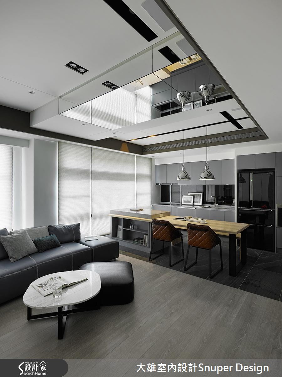 公共空間涵括客廳、餐廚,以及閱讀區,抹除制式的格局分野,僅以地坪材質、家具位置等,彈性劃分領域歸屬,沿著日光充裕的窗畔,每個角落皆能感受到綠意和微風的拂照,開啟生活的舒適想像。在材質的選擇上,採用大理石的柔和脈理,搭配不鏽鋼金屬,形構溫質自然和現代時尚的互動對話;天花樑體覆上鏡面,讓高度得以舒放延展,也透過介質的映射,援引窗外綠景,拉近生活和自然的距離。進入主臥室,除了簡約寬敞的睡眠環境,也包含盥洗和獨立的更衣室空間,將居住者的舒適度列為優先考量。