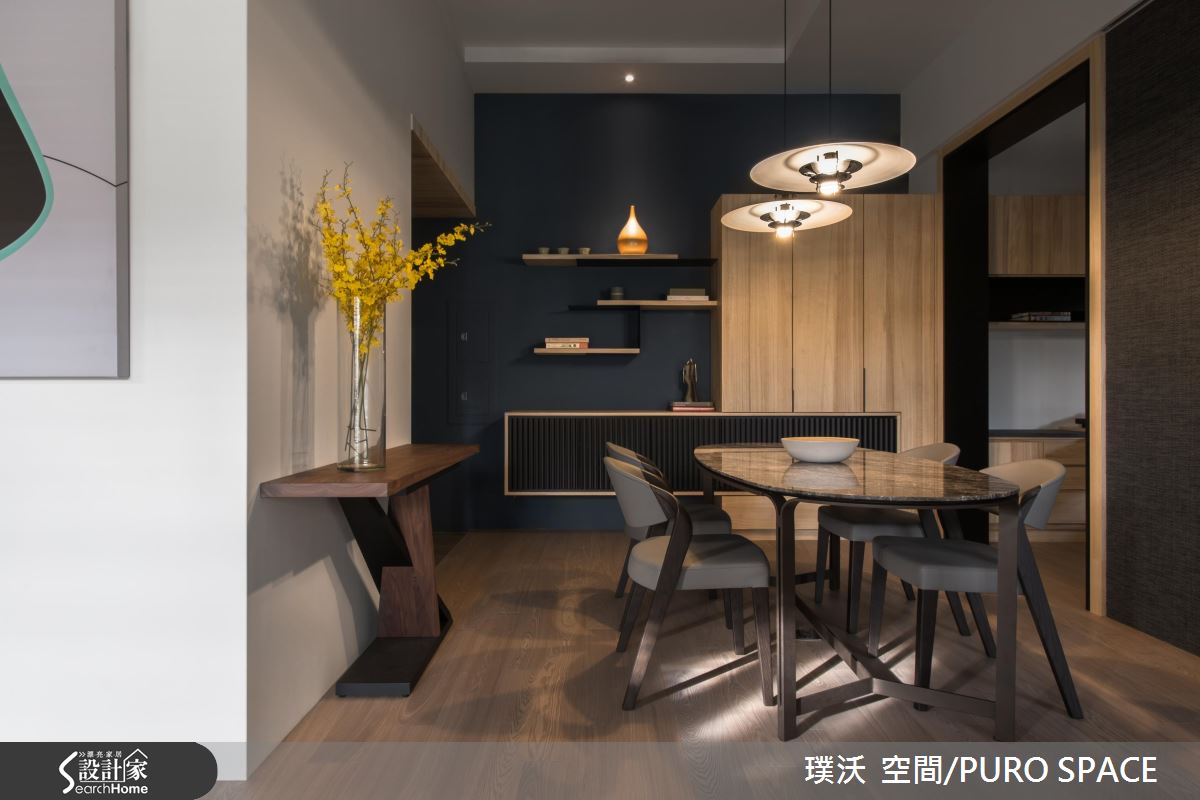 暖陽隨著百葉窗映照入室,電視牆以半高的姿態坐落在公領域之中,讓自然光能夠持續滲入後方梯間與畸零地,照亮空間的每一處;以半面電視牆體的設計方式,不僅打破封閉的隔間,更形塑一股流動的氛圍,創造出寬敞氣度;餐廳區的壁面以深色調鋪陳,營造出沉靜、溫潤的用餐氛圍,串連櫃體與層板的方式,打造展示與機能兼備的場域;整個公領域裡更藉由端景美學的技法,在角落或領域轉換處擺設風格獨具的家具或物件,讓視覺所到之處皆是景,展現藝術與人文交會的質感雅居。