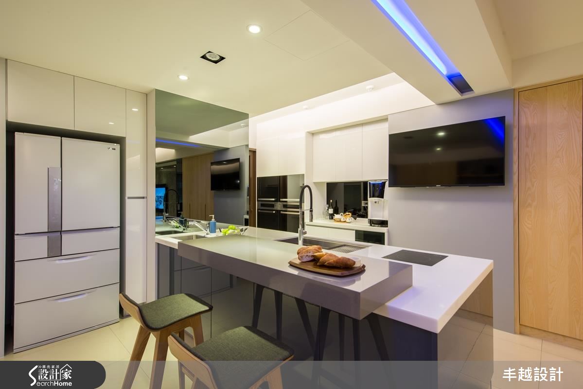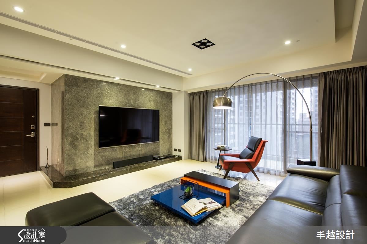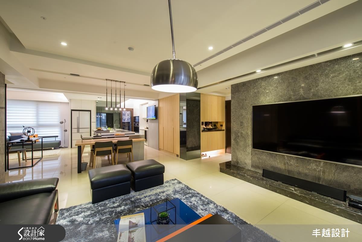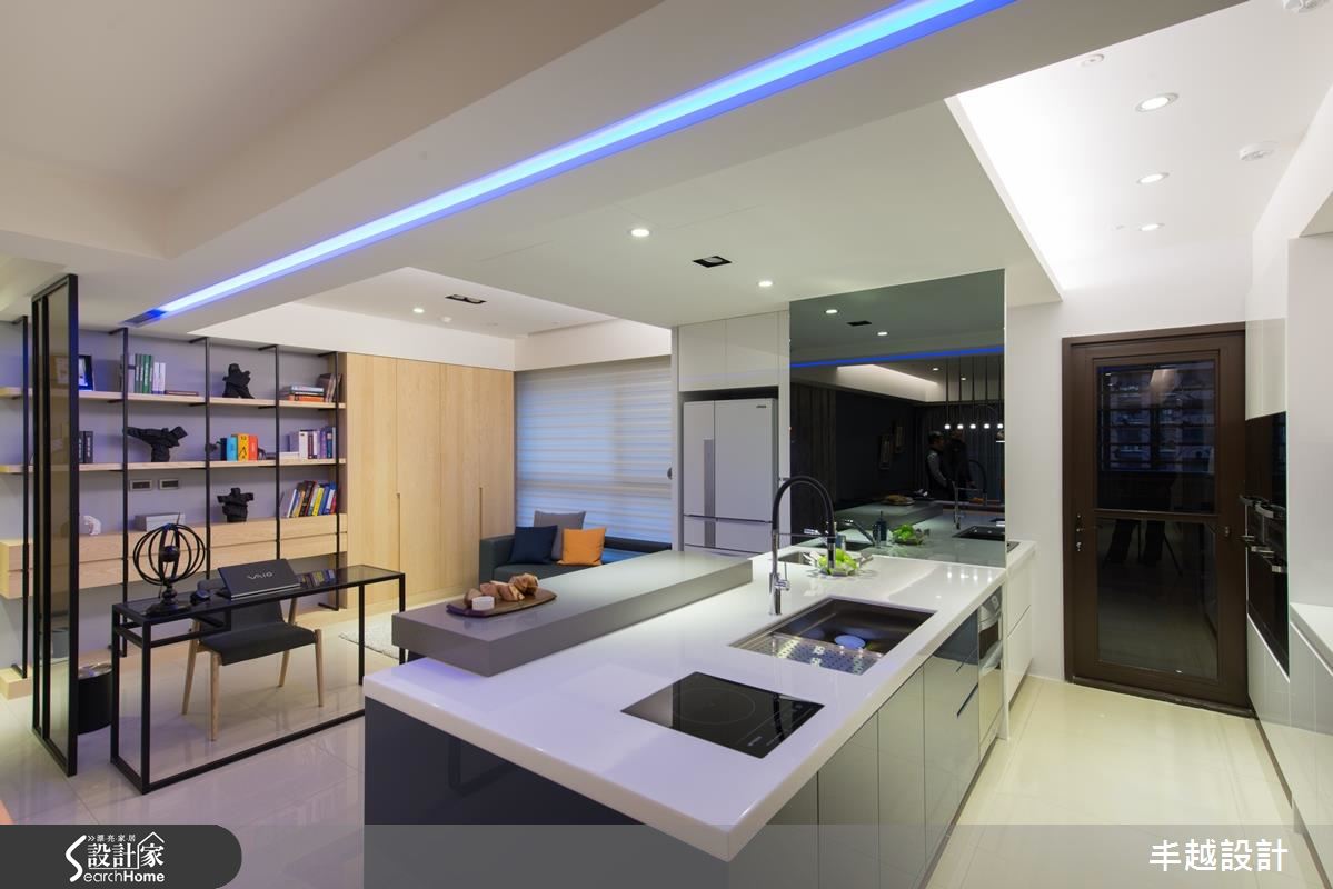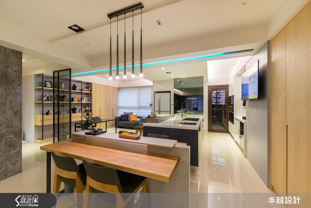 50 坪空間以全開放式設計規劃,充滿著簡約卻不失品味的格調,客廳以大理石電視牆為主角,大幅提升空間質感,沙發背牆則選用帶有細緻線條的深灰色階,搭配黑色皮沙發,彰顯了專屬冷色調搭配的成熟質感。開放餐廚與書房則以清新、自然的色調為主色,搭配鐵件屏隔與家具,在溫和氛圍中點綴個性氣息。利用餐廳作為客廳與廚房、書房的分野,並巧妙避開樑下空間;設計師更在樑面嵌入藍光照明,增添都市雅痞風格。中島吧台成為廚房與書房的連結,如有客人來訪,也不會讓烹飪阻礙互動度,更將臥榻放置在窗邊,輕鬆享受日光浴。