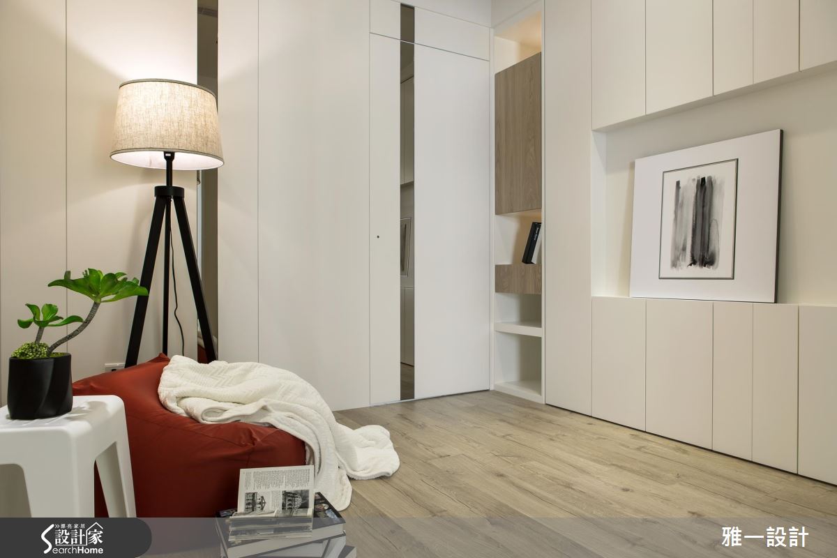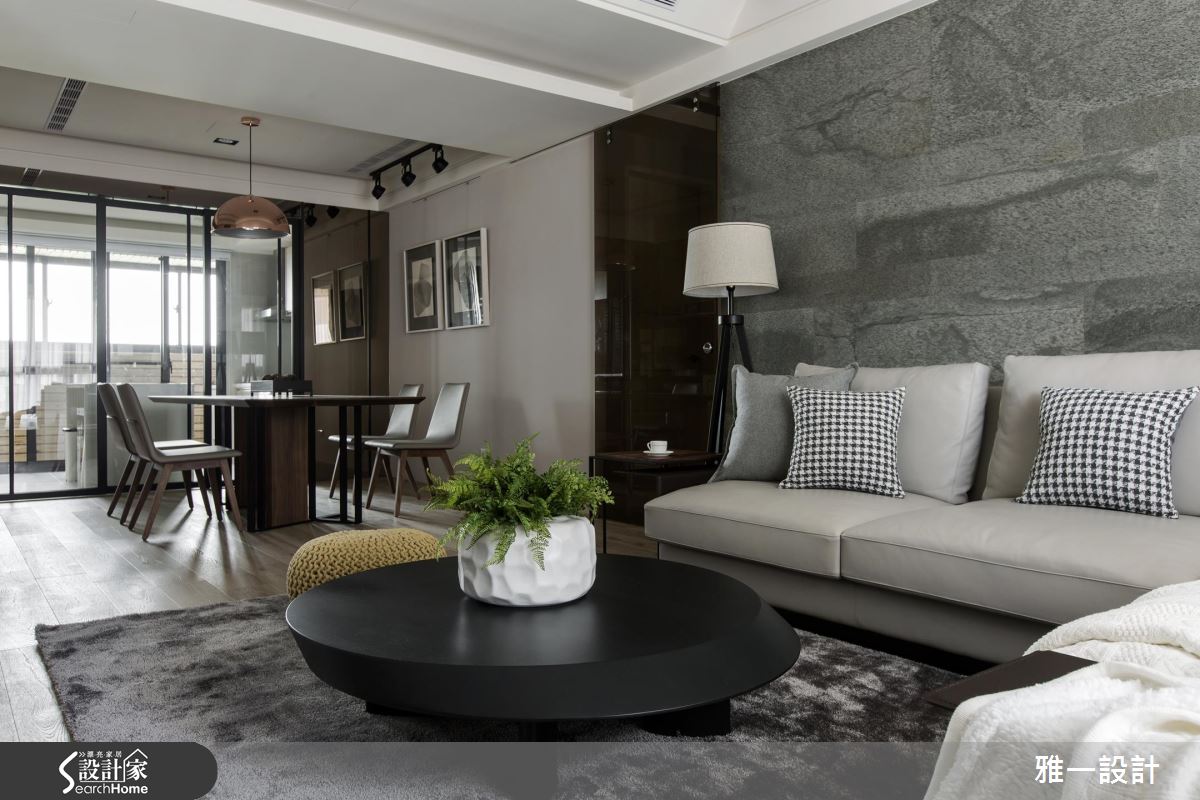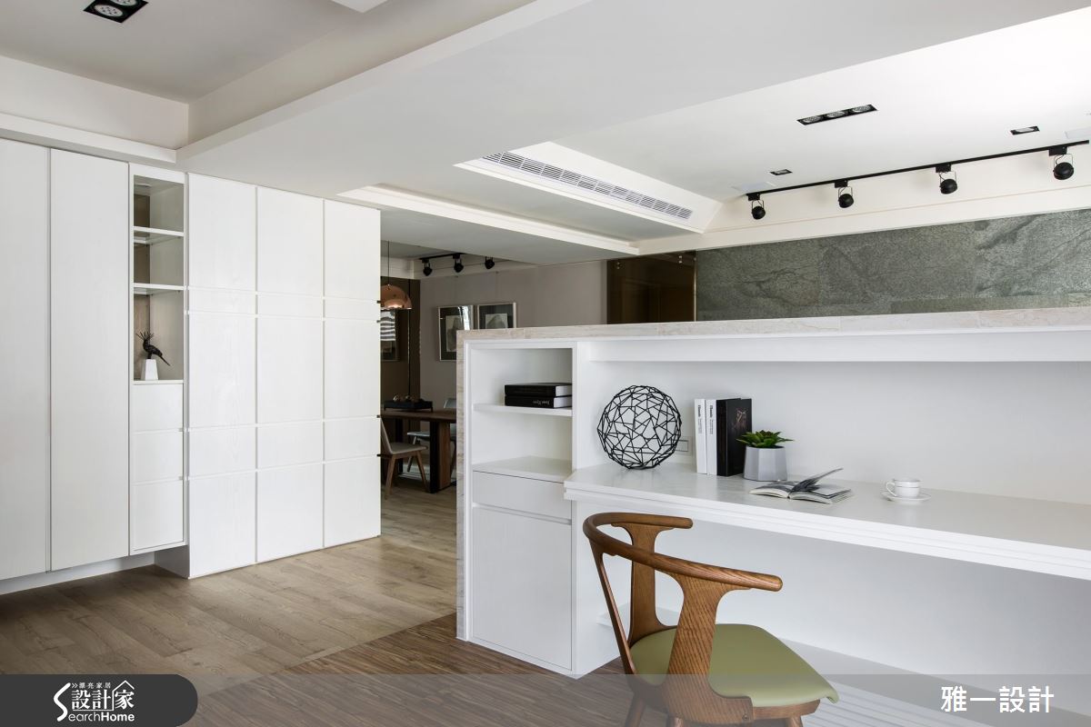 將公領域化為一個大型開放空間,在局部立面使用色調或材質較為沉重建材,另一方面引入豐沛的陽光,讓明暗為之平衡,適當調和溫暖與清新的比例。電視牆與沙發背牆雖皆選用石紋材質,但經由挑選後,以冷暖色調產生對比,佐以灰階與大地色沙發、軟件,創造巧妙的溫度平衡。開放和室與書房回歸純白色彩,讓日光成為最自然的調節機關。三間臥房依據主人的習性採用不同的色調與材質,但三者的共通點皆是大面積木元素與輕淺色調,組合為清新、明亮的簡約風格。