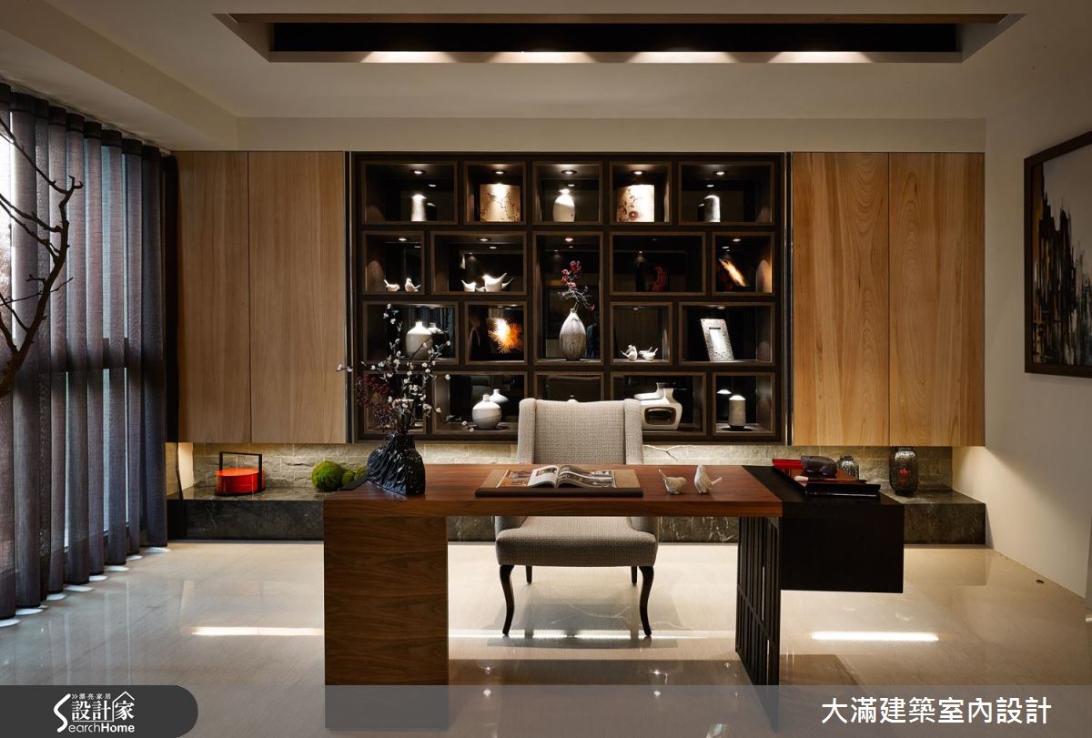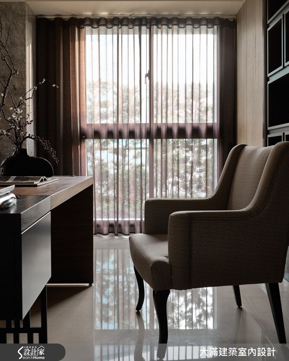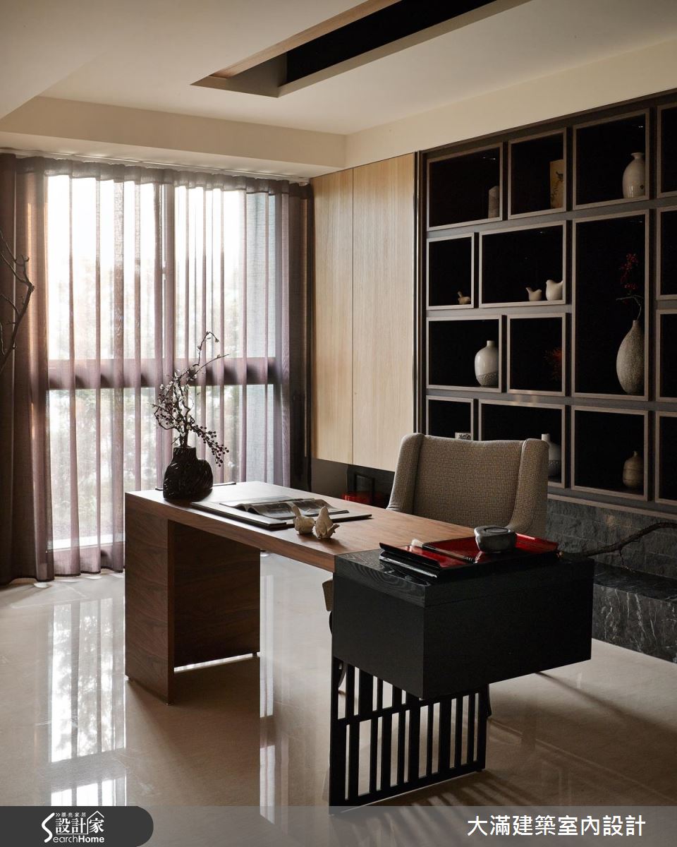 設計師引用木質、大理石等天然建材,強調以原色創造溫潤視感,並透過材質延續的筆觸,型塑完整富質感的立面背景,襯出畫作與藝品特色,同時給予大面積開窗,襯著掀動的微揚窗紗,將採光導入室內場域,形成絕佳的光影對話,鋪述充滿暖度的生活情境,而工整的線條、流暢的量體則型塑一幅又一幅的美好端景,並於書房一隅妝點枯枝、配上墨黑的花瓶,演繹出東方風格特有的拙樸雅趣。
