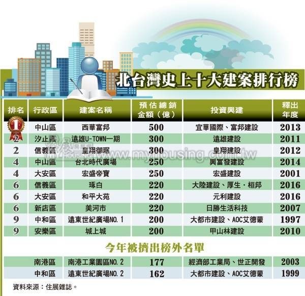 史上十大建案排行榜的冠軍,一六年依然是大直重劃區的「西華富邦」,總銷估為五百億元,是目前北台灣唯一一個案量突破四百億的建案,更已蟬聯四年榜首。同列為第二名的是汐止廠辦案「遠雄U-TOWN」一期、與信義區豪宅案「皇翔御琚」,案量約為三百億。一起位在第四名的是大直重劃區商辦案「台北時代廣場」、與大安區豪宅案「宏盛帝寶」,案量約為二五○億。