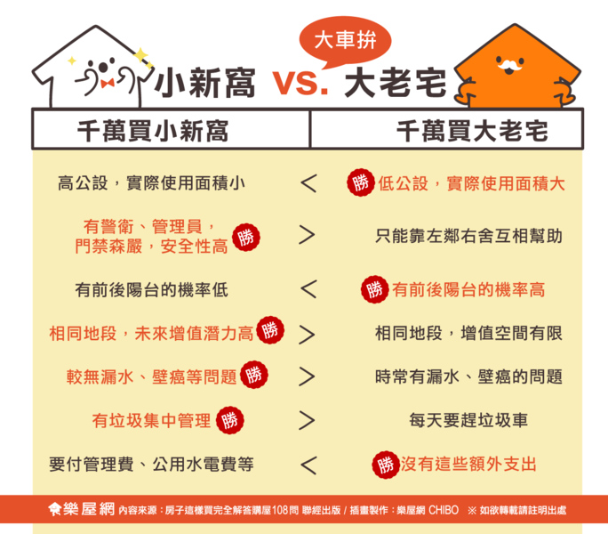 「千萬買小新窩?還是買大老宅?」這個問題簡直是購屋過程中的天人交戰,對口袋不深的購屋者而言,當然期待可買到又大又新的好房子,偏偏天下沒有這等好事。
